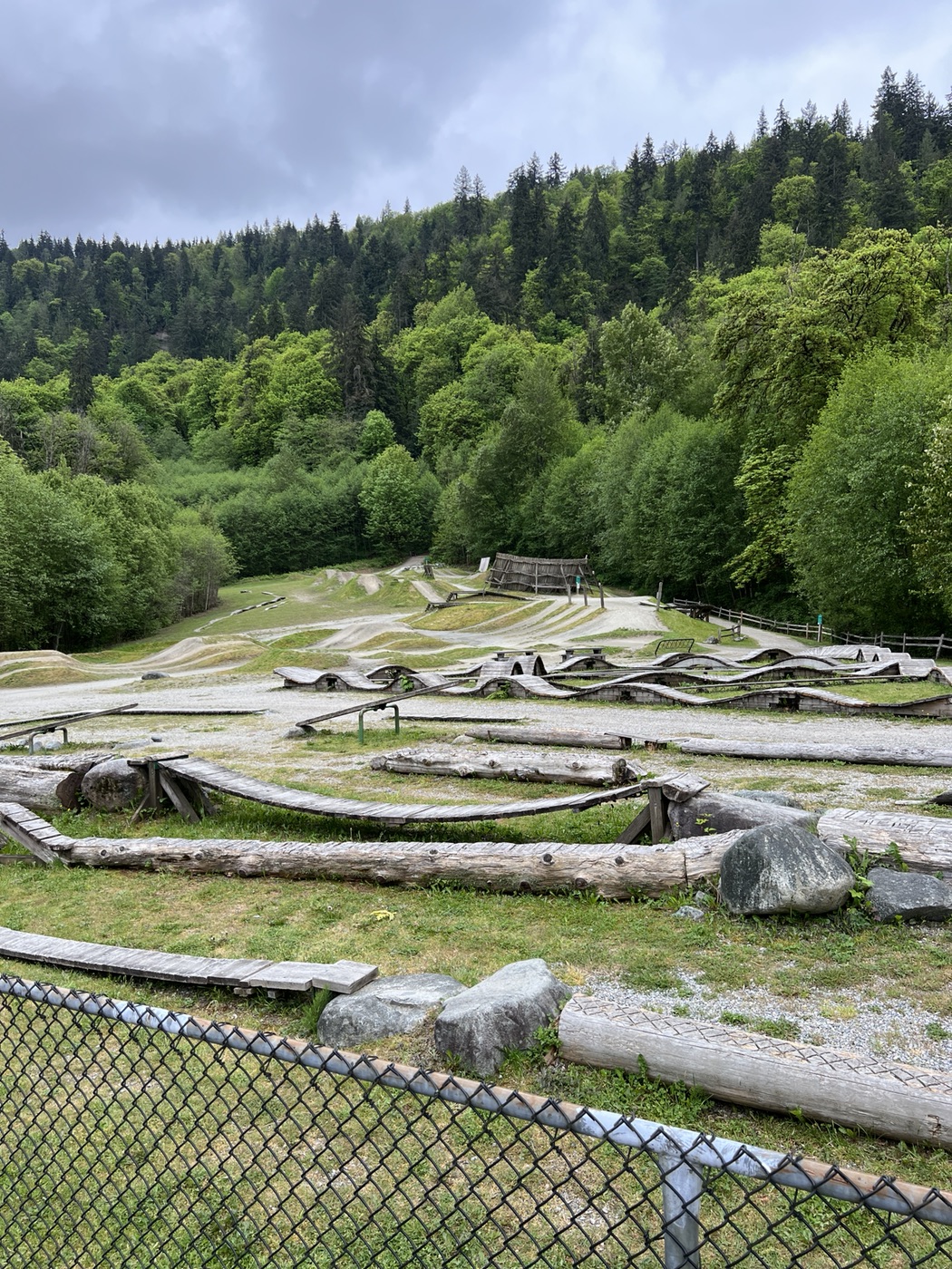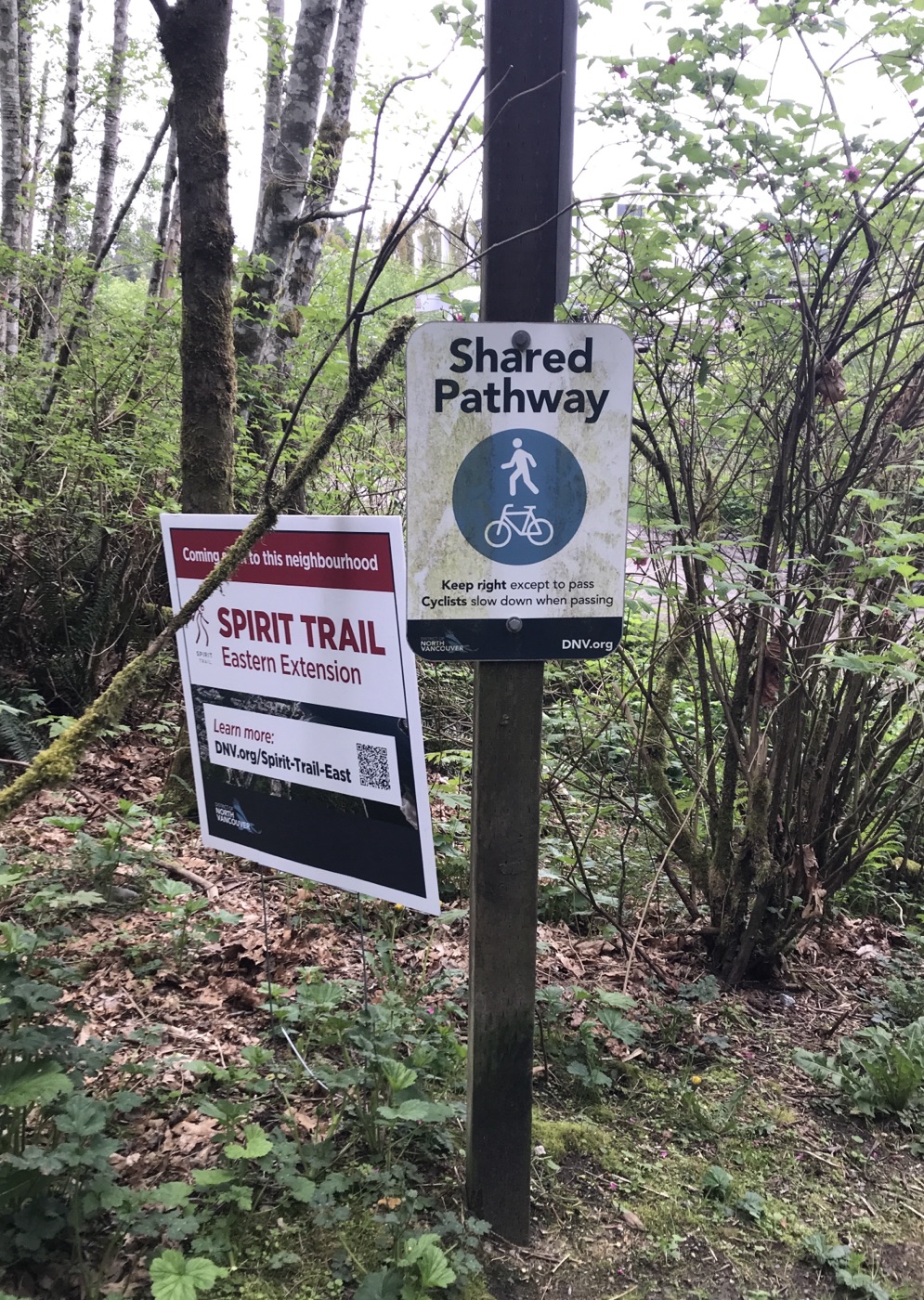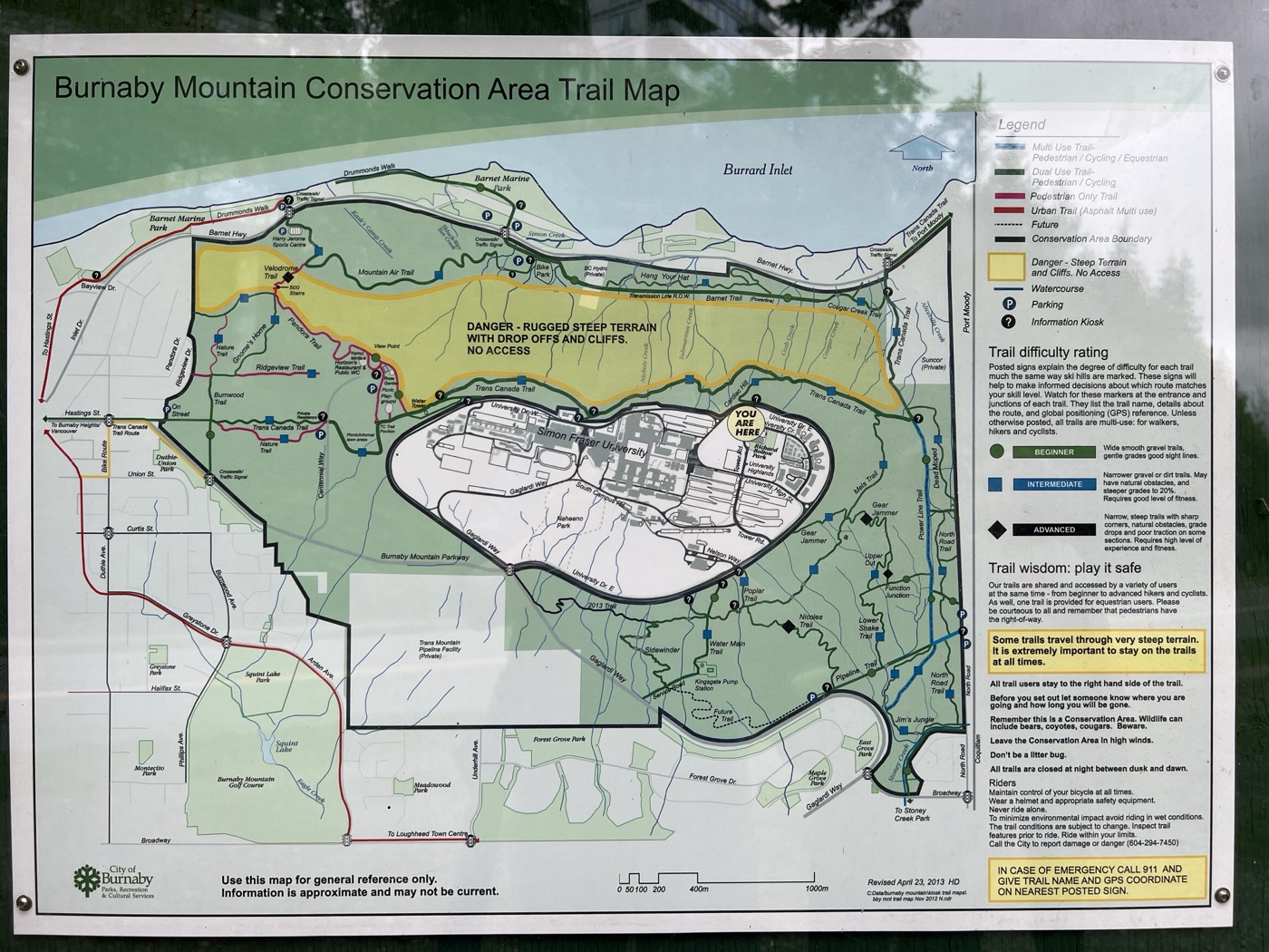 At the bottom of Velodrome trail we turned east to follow the Mountain Air trail, which led us to the Mountain Air Bike Skills course, featuring “a circuit of rollers, banked turns and features designed to be ridden completely by riders ‘pumping’–generating momentum by up and down body movements, instead of pedaling or pushing.” Unfortunately we’d forgotten to bring our bicycles along, so we simply continued east on foot along Barnet Trail to the point where it joins the Trans Canada Trail, the start of our ascent of Burnaby Mountain.