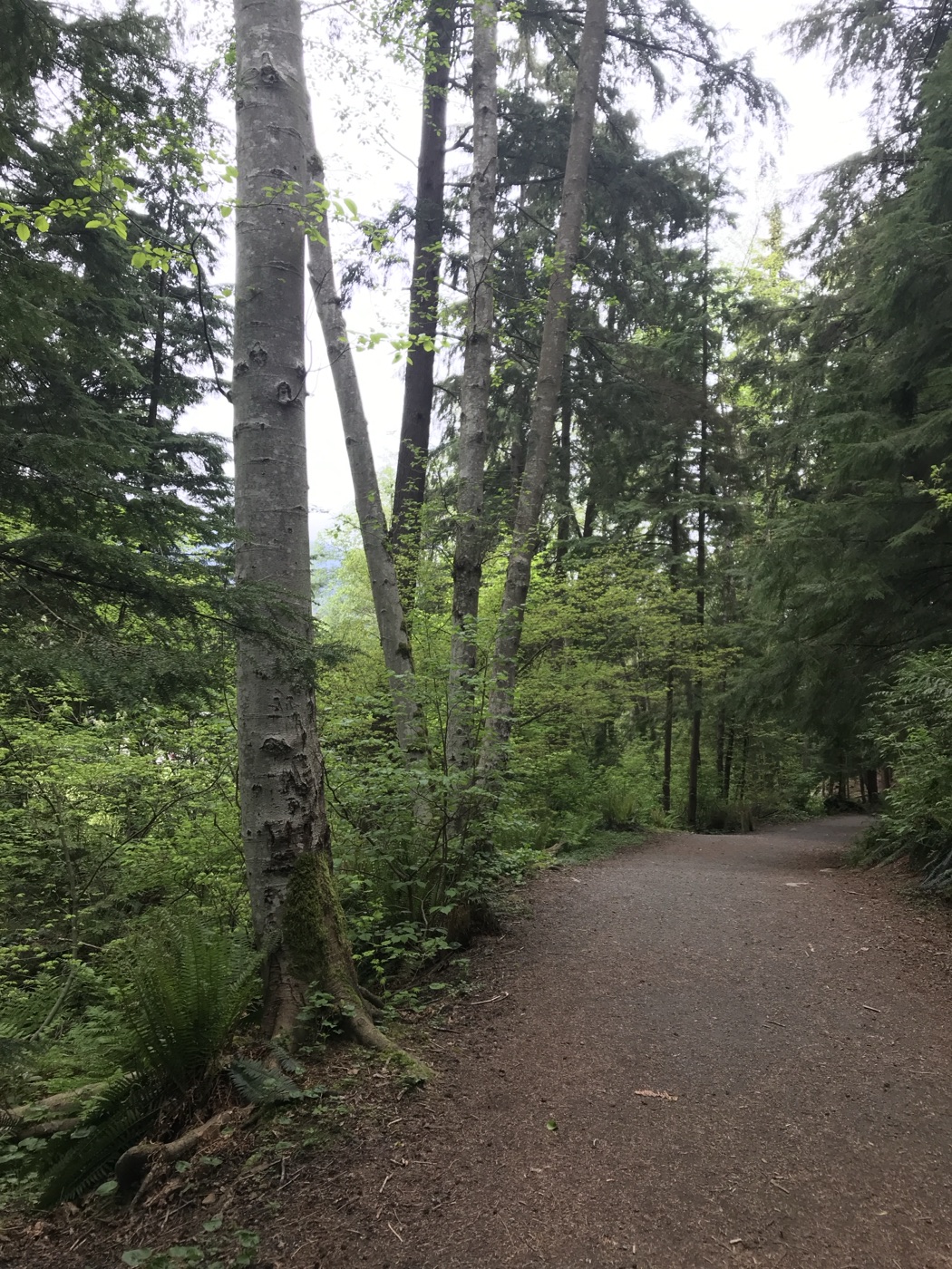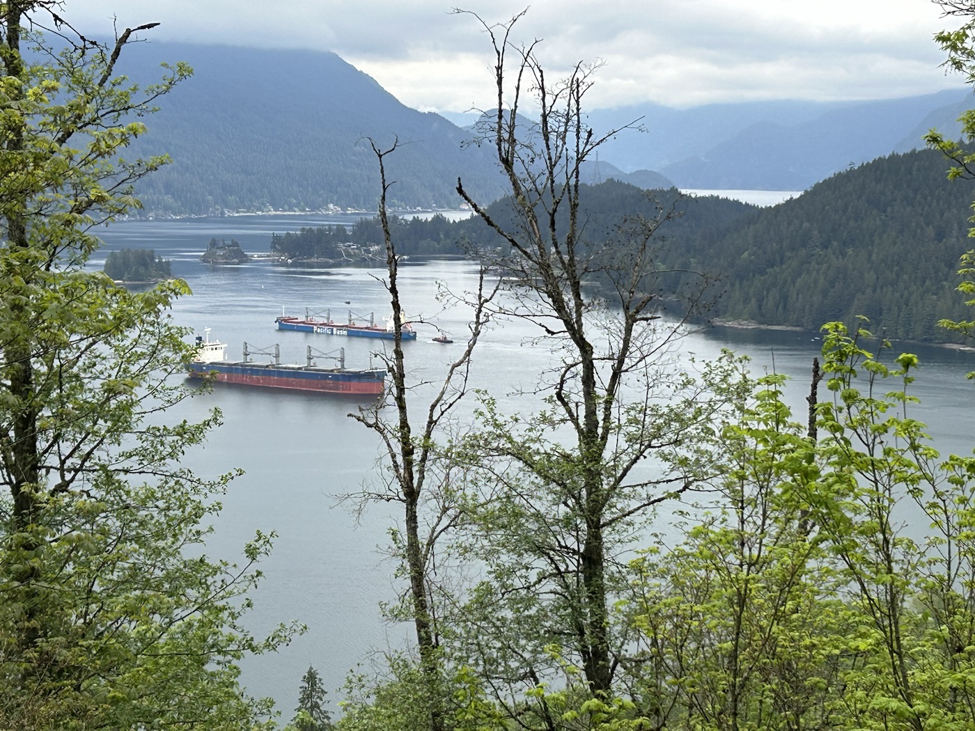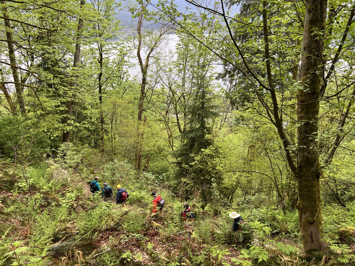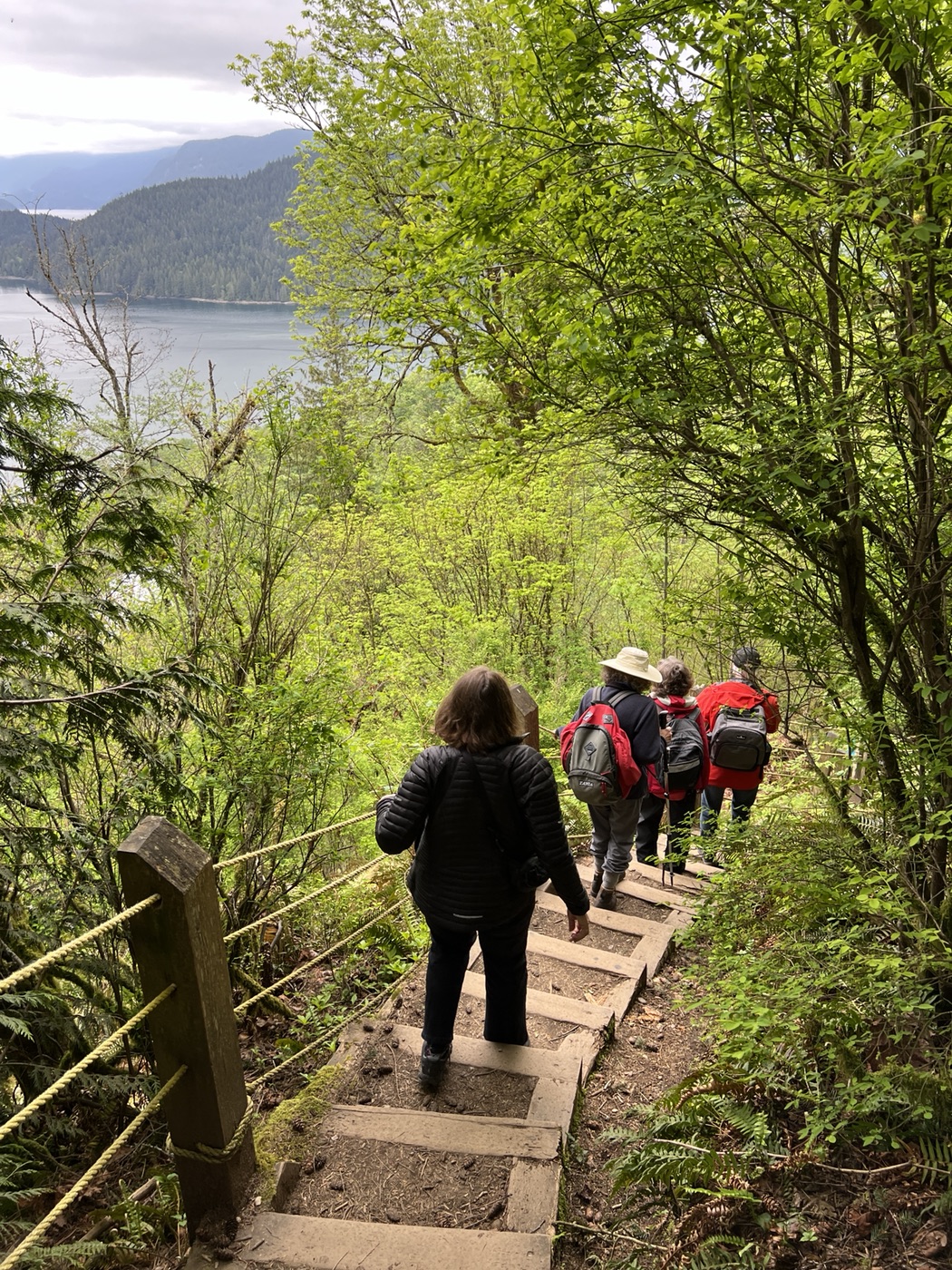 The Burnaby Mountain trail started out fairly gently, leading us uphill through vine maples, various ferns, and other seasonal flora which flaunted themselves in diverse shades of green. We soon came to the start of the Velodrome trail, a 500-step staircase leading down, which took us to the base of the steep bluff which marks the northern edge of Burnaby Mountain. Excellent views of Indian Arm were on offer during our descent.