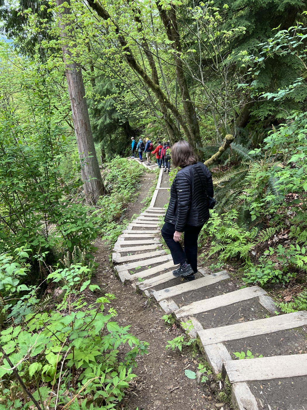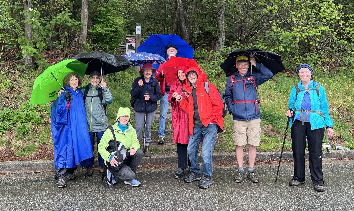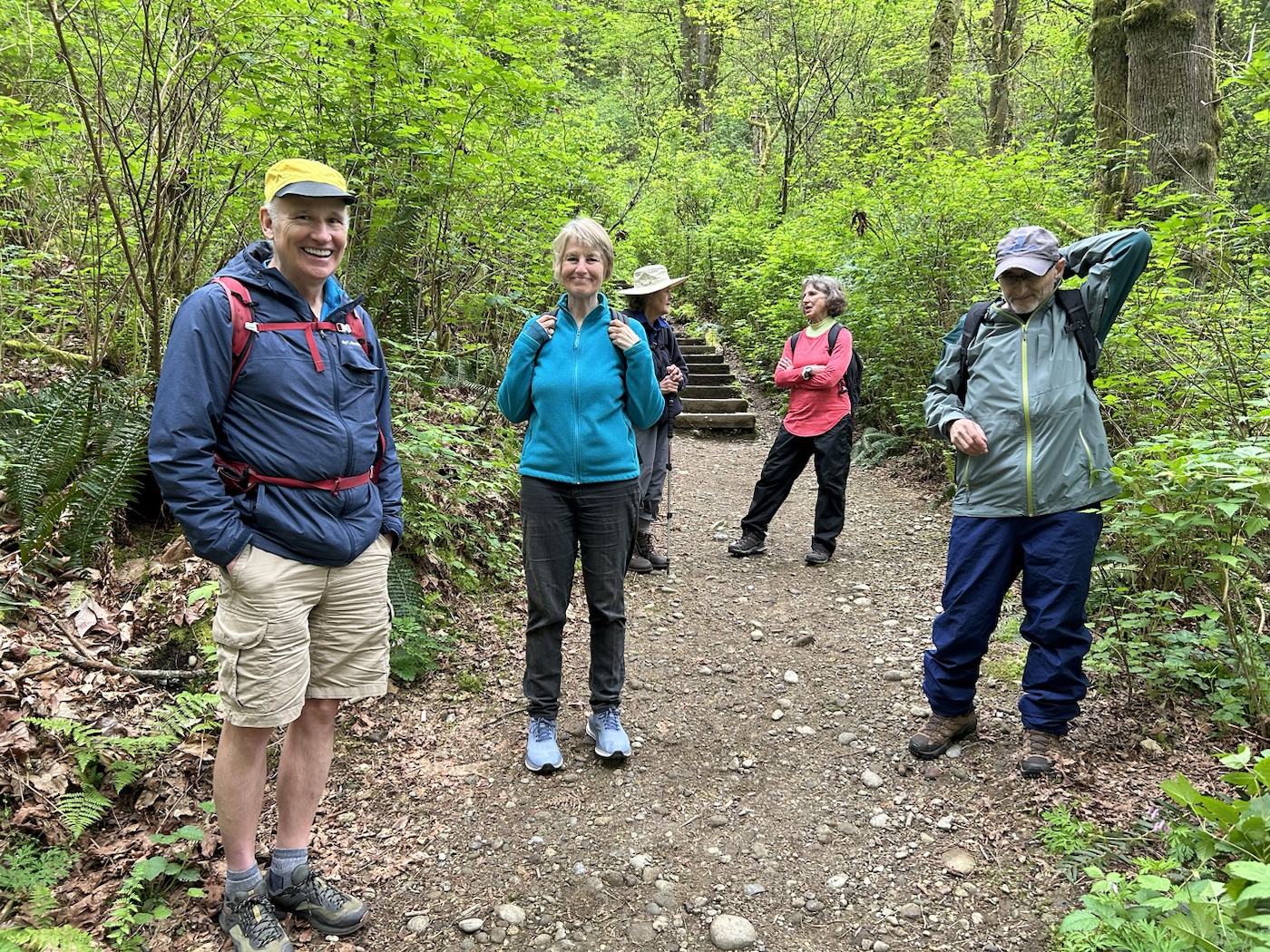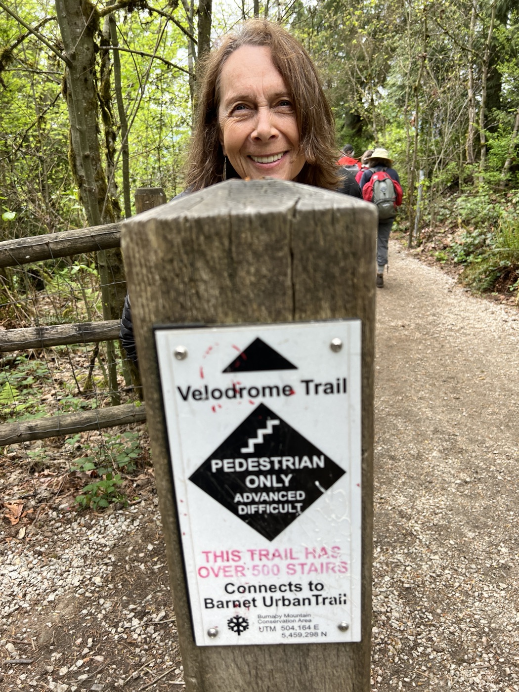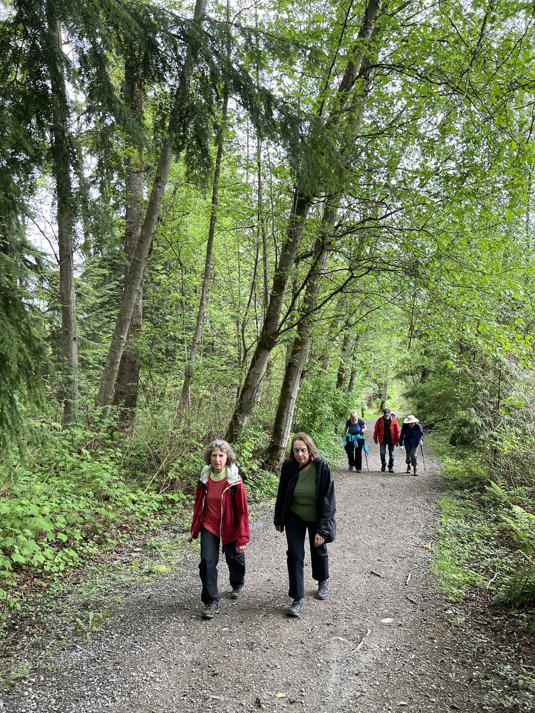 Our May Looper walk was organized and led by Annie and Jan, who had previously scouted out the trails surrounding Burnaby Mountain in search of a suitable route which incorporated the steepest of the hills. Nine of us met up at the usual 10:30 starting time, at the trailhead just opposite 7509 Pandora Drive, on an overcast day, with rain threatening. Other Loopers were more-or-less-simultaneously (if you ignore time zone differences) doing their own thing in other parts of the Looperverse: Jean on a solo walk in Deep Cove (in an attempt to avoid the worst of Burnaby Mountain’s ascents and descents); and a contingent of expatriate Loopers exploring ancient cart ruts and cave systems in Malta, under much bluer skies. Some brief bulletins describing those walks can be found at the end of this posting.