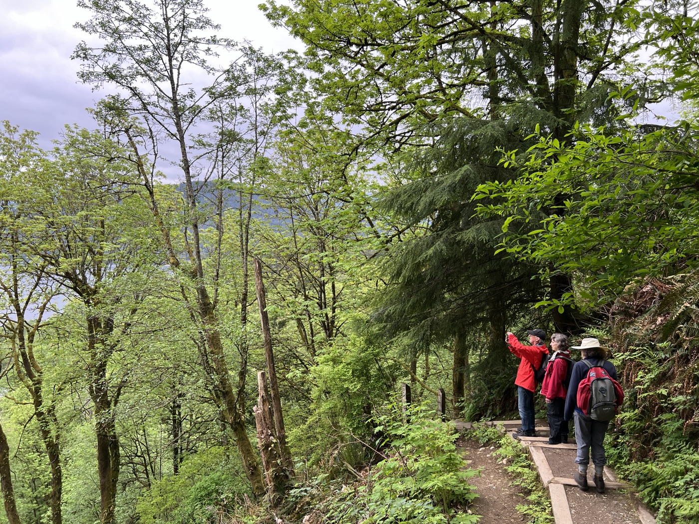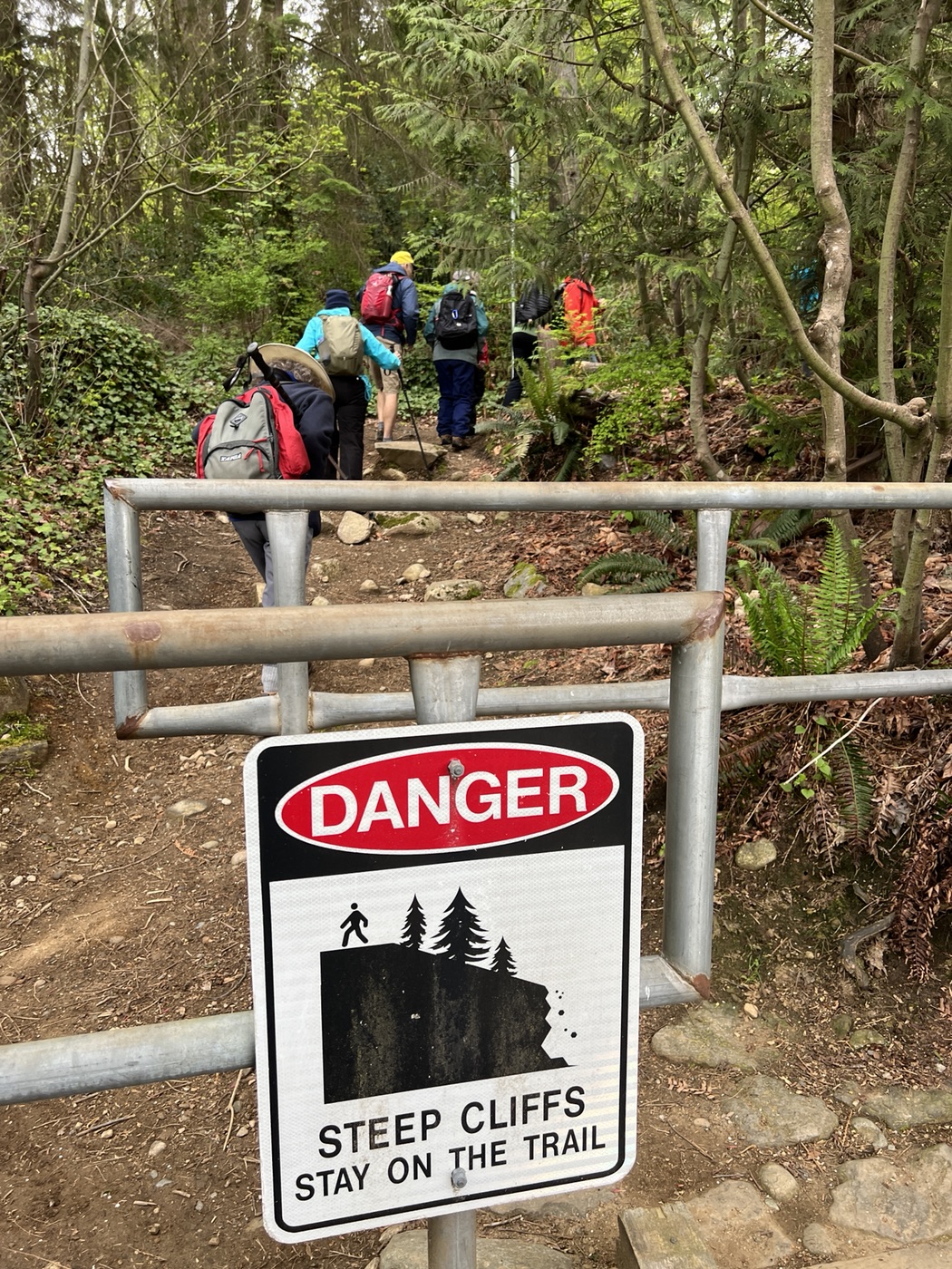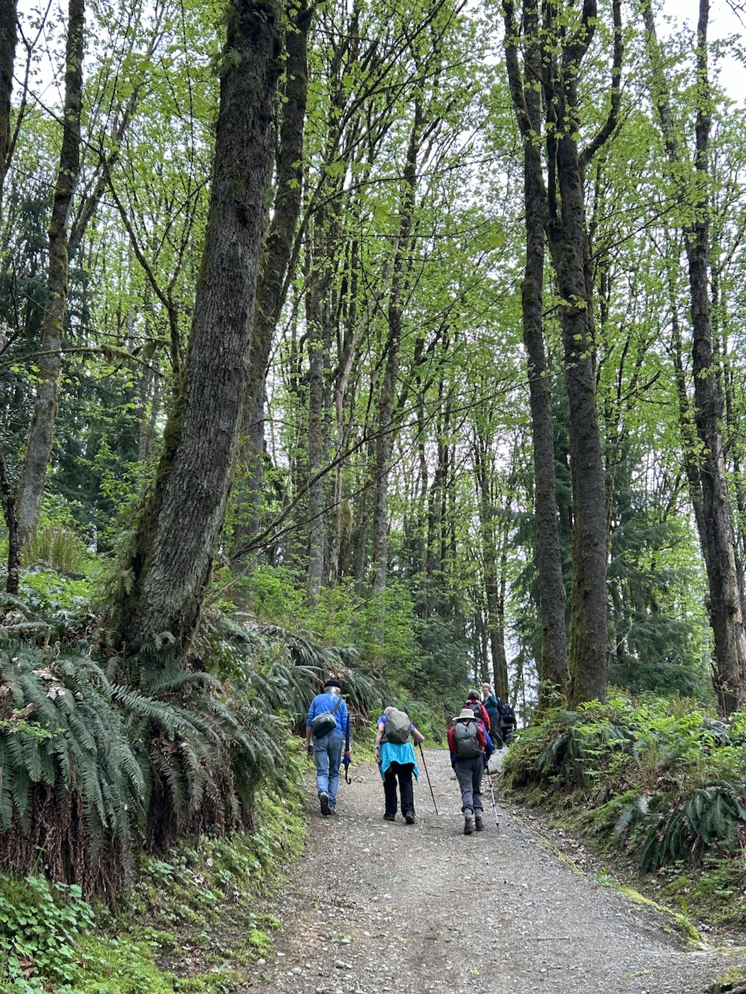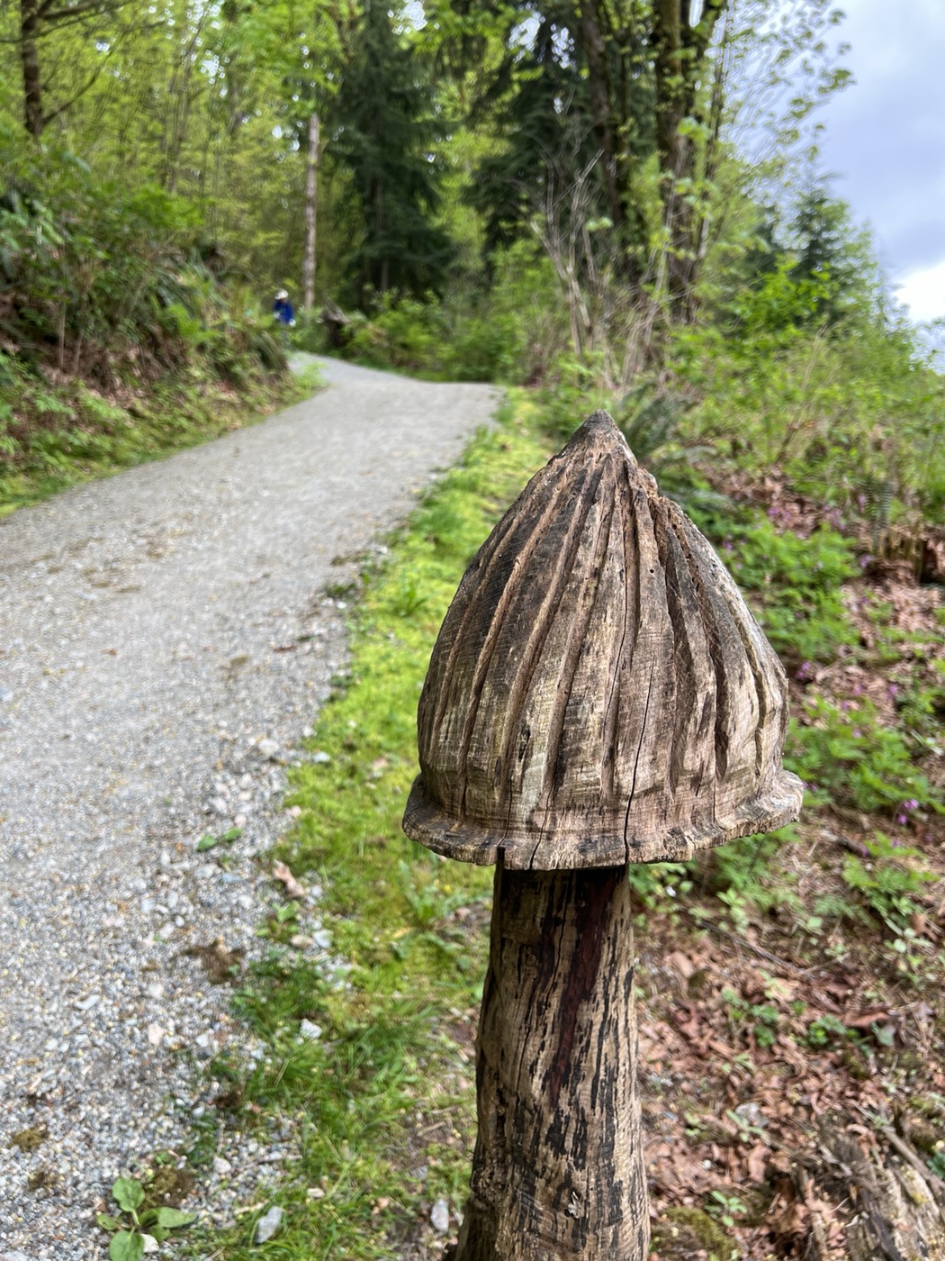 Our May Looper walk was organized and led by Annie and Jan, who had previously scouted out the trails surrounding Burnaby Mountain in search of a suitable route which incorporated the steepest of the hills. Nine of us met up at the usual 10:30 starting time, at the trailhead just opposite 7509 Pandora Drive, on an overcast day, with rain threatening. Other Loopers were more-or-less-simultaneously (if you ignore time zone differences) doing their own thing in other parts of the Looperverse: Jean on a solo walk in Deep Cove (in an attempt to avoid the worst of Burnaby Mountain’s ascents and descents); and a contingent of expatriate Loopers exploring ancient cart ruts and cave systems in Malta, under much bluer skies. Some brief bulletins describing those walks can be found at the end of this posting.