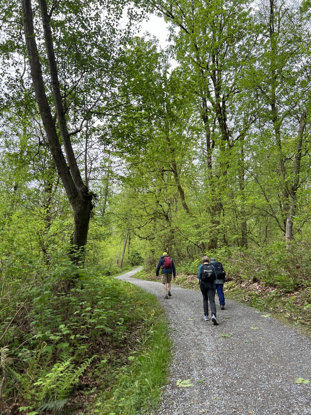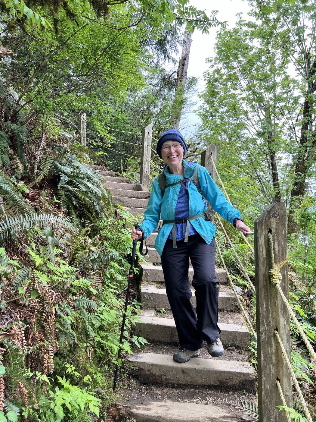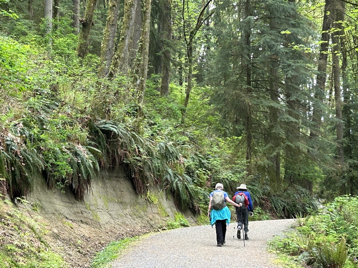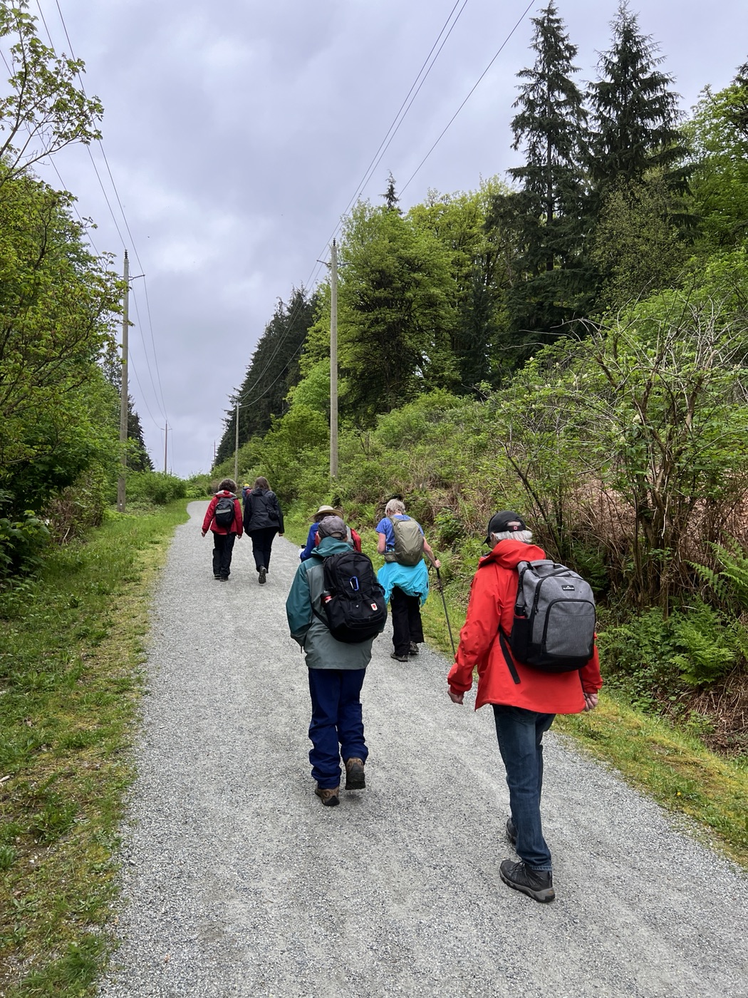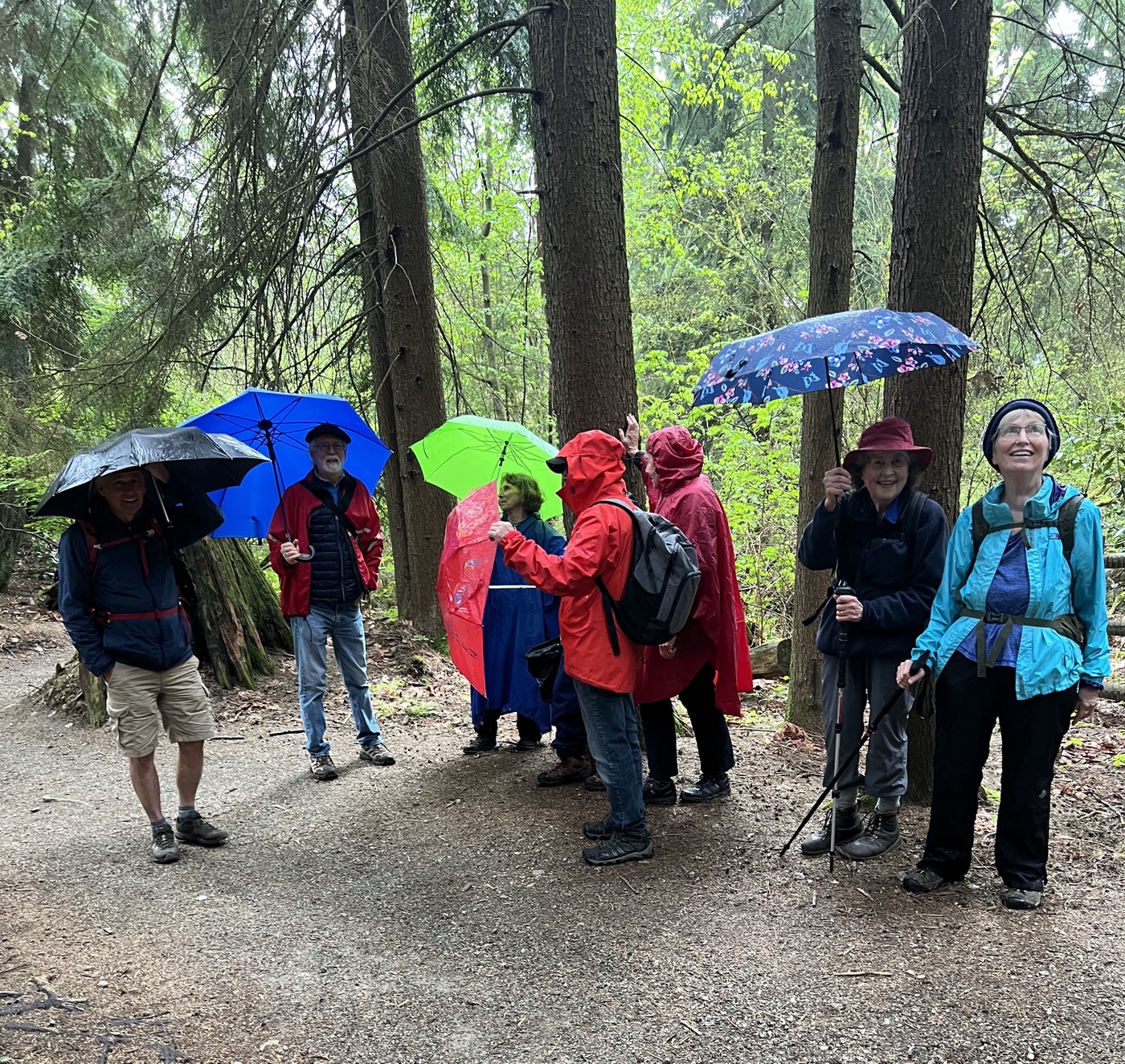 Our May Looper walk was organized and led by Annie and Jan, who had previously scouted out the trails surrounding Burnaby Mountain in search of a suitable route which incorporated the steepest of the hills. Nine of us met up at the usual 10:30 starting time, at the trailhead just opposite 7509 Pandora Drive, on an overcast day, with rain threatening. Other Loopers were more-or-less-simultaneously (if you ignore time zone differences) doing their own thing in other parts of the Looperverse: Jean on a solo walk in Deep Cove (in an attempt to avoid the worst of Burnaby Mountain’s ascents and descents); and a contingent of expatriate Loopers exploring ancient cart ruts and cave systems in Malta, under much bluer skies. Some brief bulletins describing those walks can be found at the end of this posting.