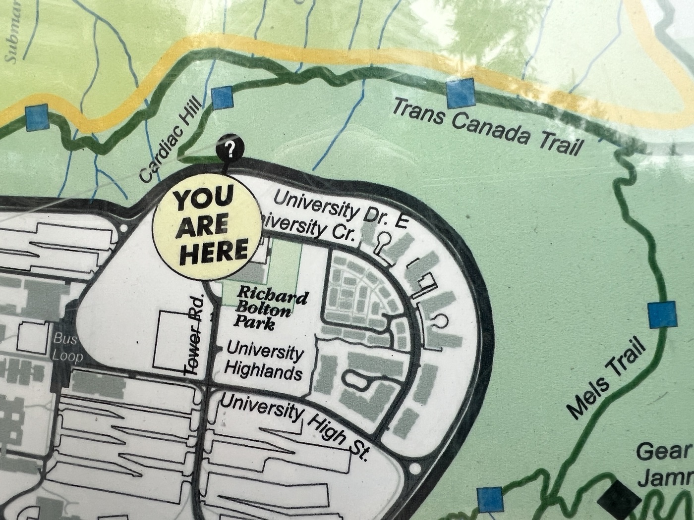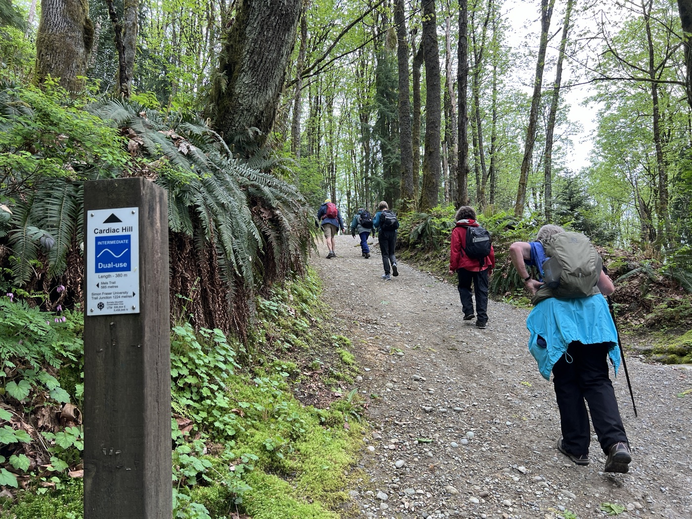 Just when we thought we’d got the steepest sections behind us, and were nearing the top, we found ourselves at the bottom of the aptly-named Cardiac Hill, a 380-meter section of trail which has been awarded “a Walk Score of 70 out of 100” by walkscore.com (“This location is Very Walkable so most errands can be accomplished on foot.”), which deposited us at the edge of the Burnaby campus of SFU, ready for a break.