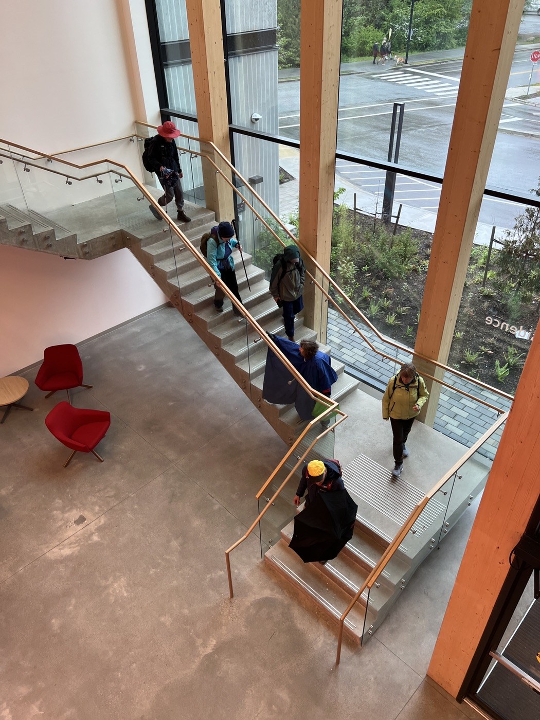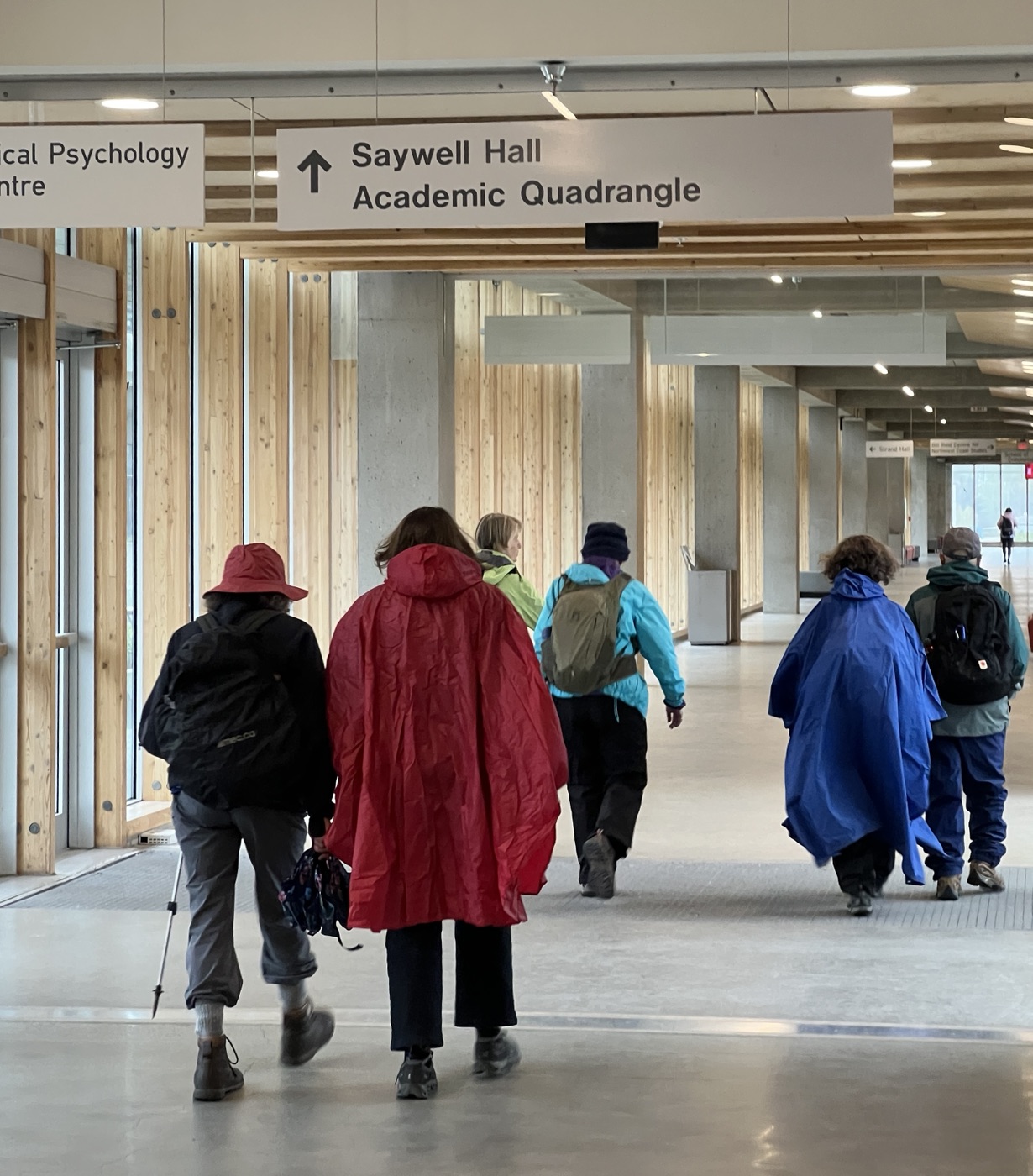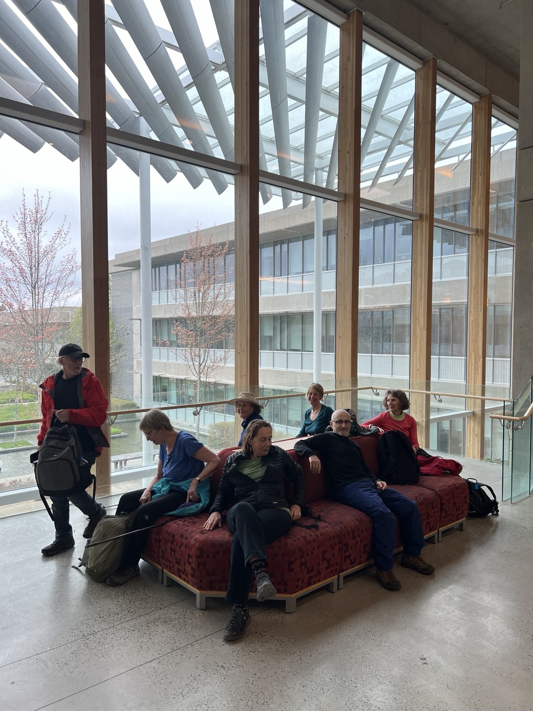 For our snack break we took full advantage of the comfy seating, the water fountains, and the washrooms on offer in Blusson Hall, where we could observe the start of light rain showers outside. Post-snack, we continued our walk through the halls of SFU’s AQ, passing an amazing sculpture titled “Frog Constellation”, by James Hart, located at the entrance to the Museum of Archaeology & Ethnology. By judicious route-finding we managed to avoid deploying our umbrellas as long as possible.