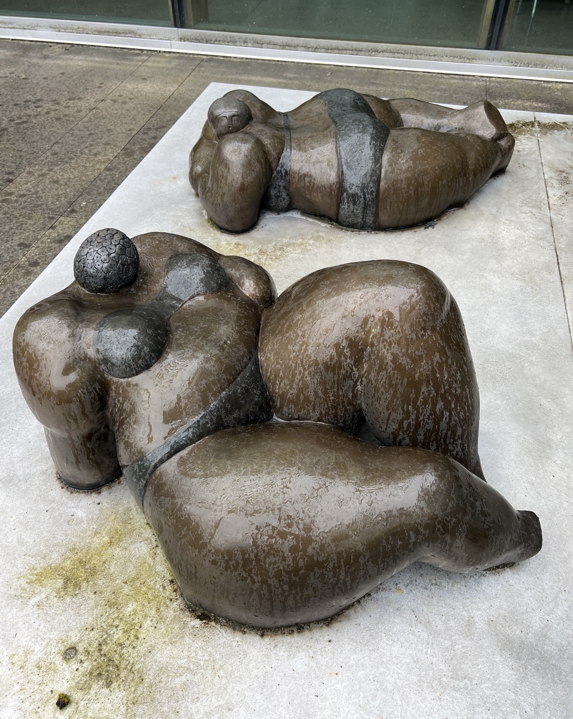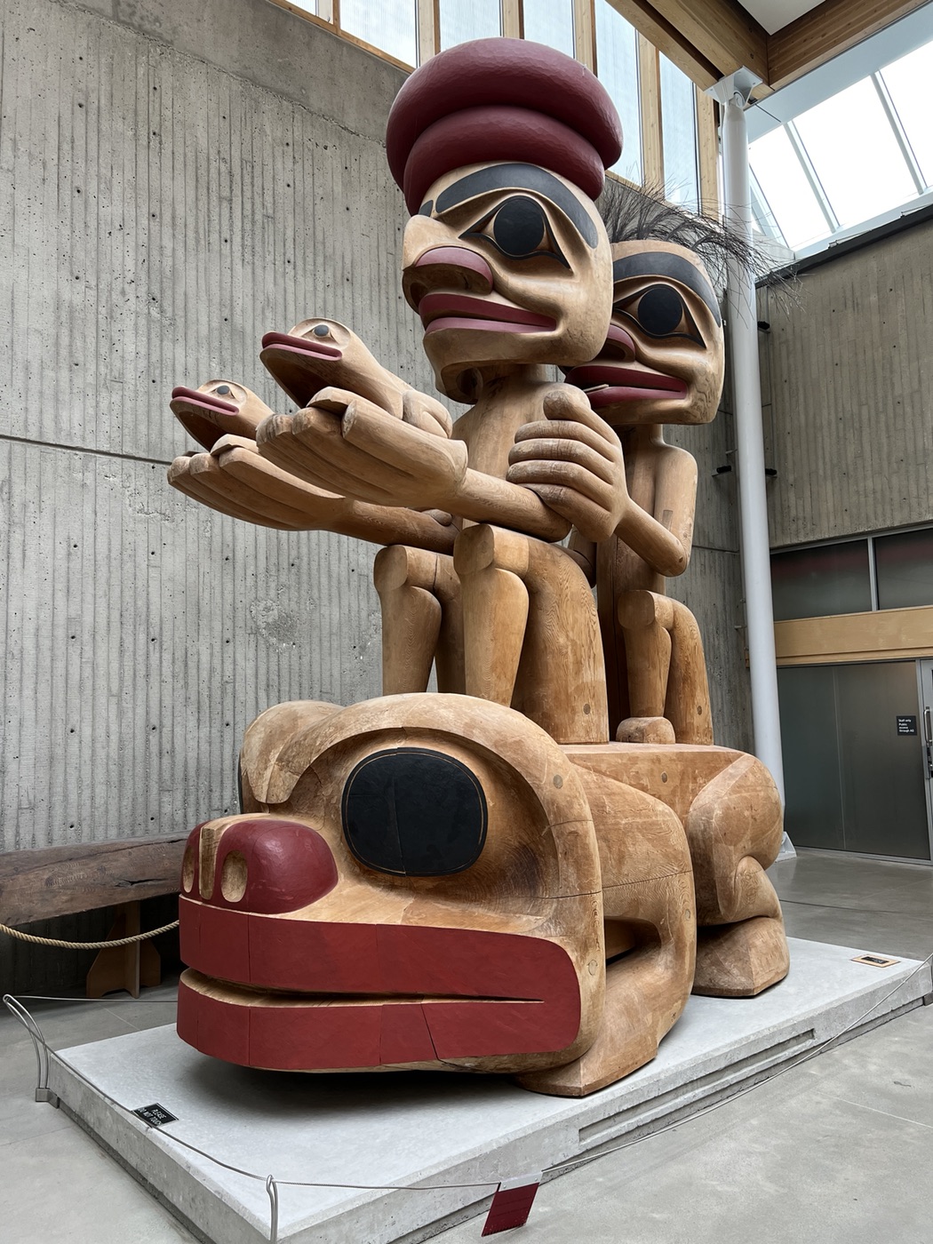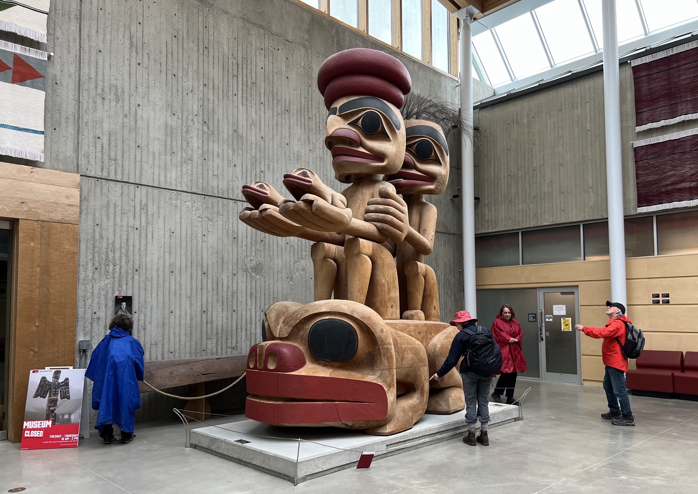 For our snack break we took full advantage of the comfy seating, the water fountains, and the washrooms on offer in Blusson Hall, where we could observe the start of light rain showers outside. Post-snack, we continued our walk through the halls of SFU’s AQ, passing an amazing sculpture titled “Frog Constellation”, by James Hart, located at the entrance to the Museum of Archaeology & Ethnology. By judicious route-finding we managed to avoid deploying our umbrellas as long as possible.