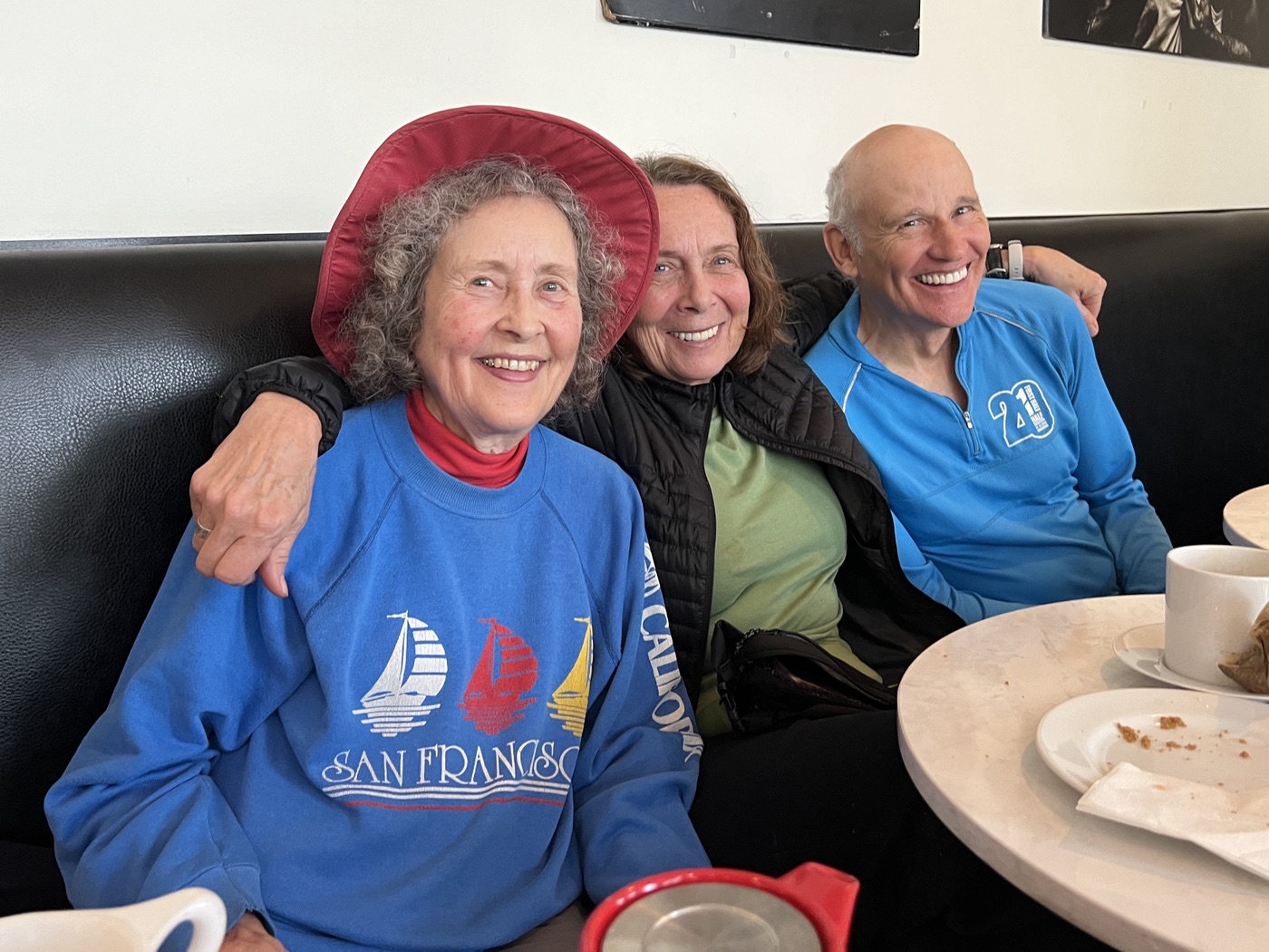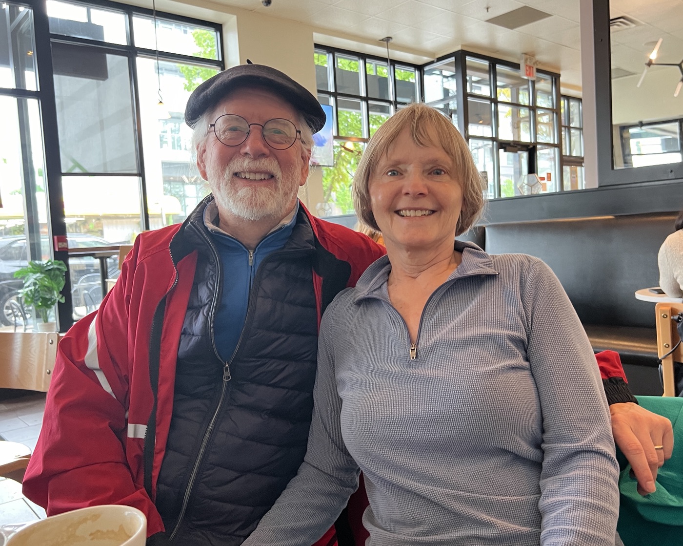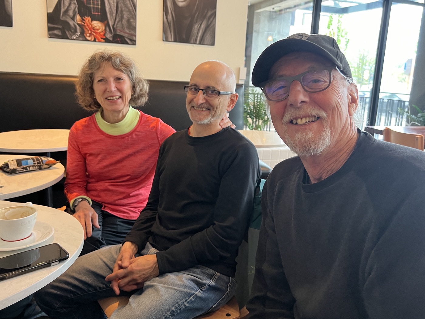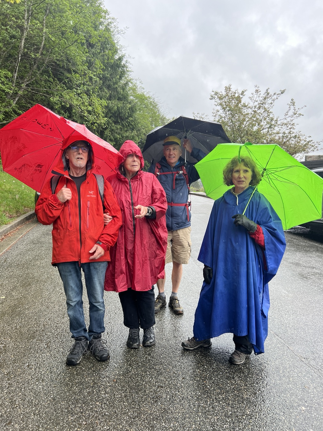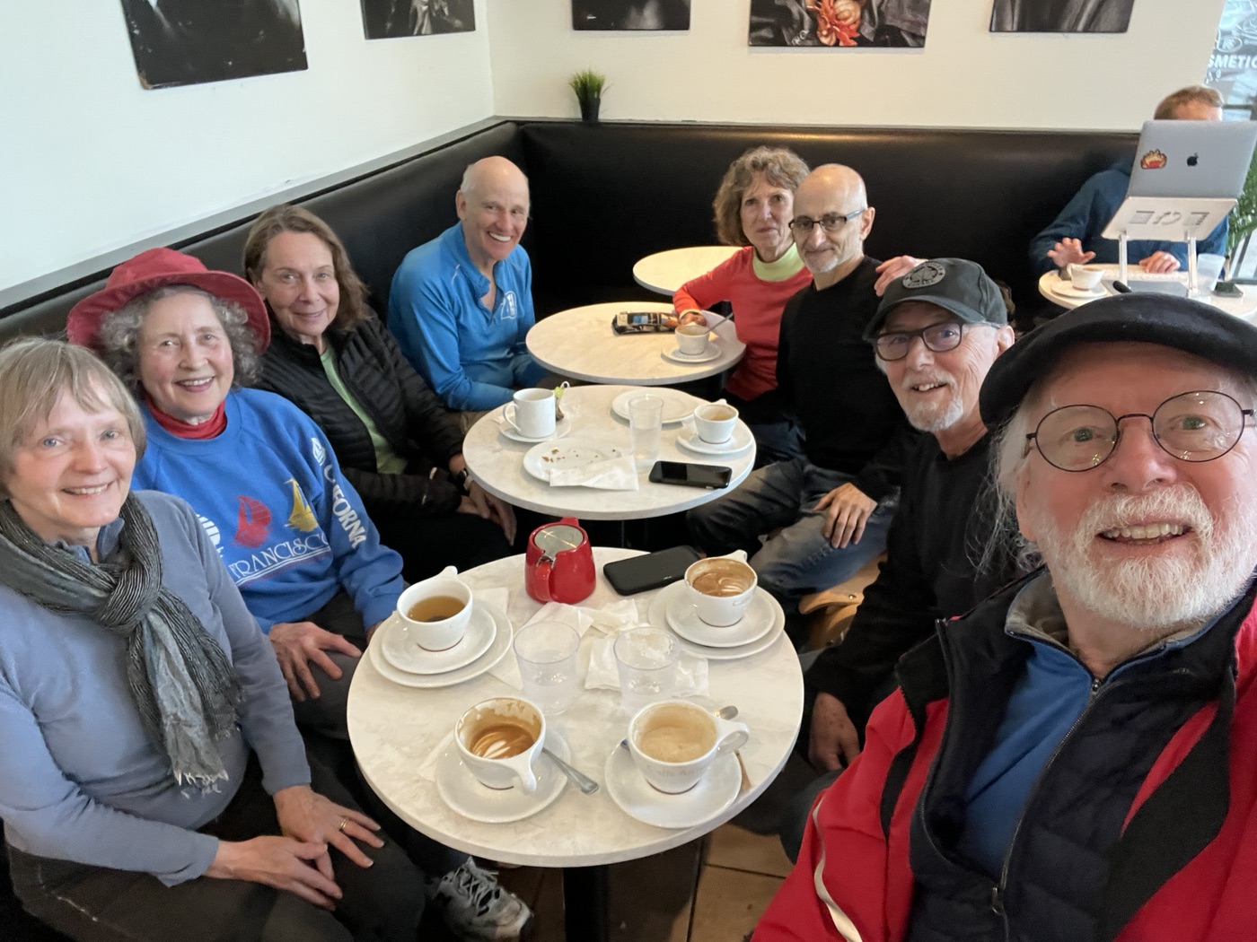 We finished our walk at about 2:30 pm, with umbrellas and rain ponchos out. Our various stats-gathering software packages were a bit at odds regarding: the total distance covered (let’s say approximately 11.5 km); the total steps (somewhere between 13k and 17k); and the altitude gained (either 39 or 102 flights). A local resident was persuaded to take a group photo to conclude our outing. Annie and Jan had a social commitment following the walk, but the rest—with Jean joining us—went for a caffeine and baked goods version of afters at Artigiano on East Hastings. A good time was had by all.