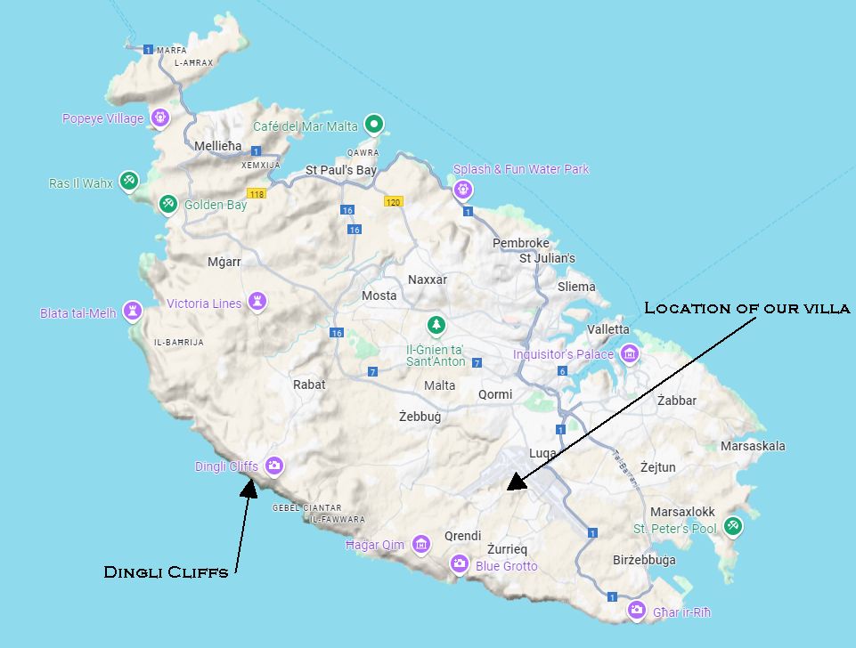 We Uber’ed to a viewpoint by a small chapel along the Dingli Cliffs. Located on the west coast, they are the highest spot in Malta and offer great views. After our starting selfie we headed out along the Cliffs for a short distance, admiring the view, and then turned inland along a side road. A short way along this road we found a trail heading off to the south.