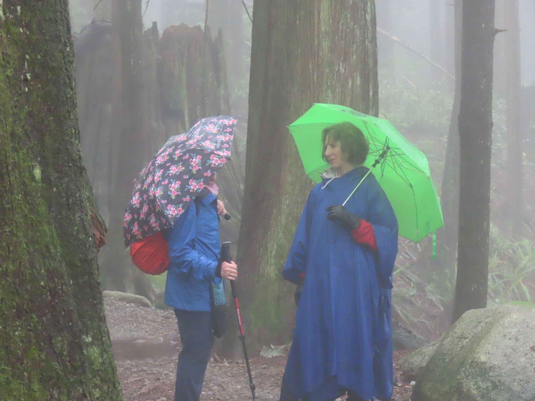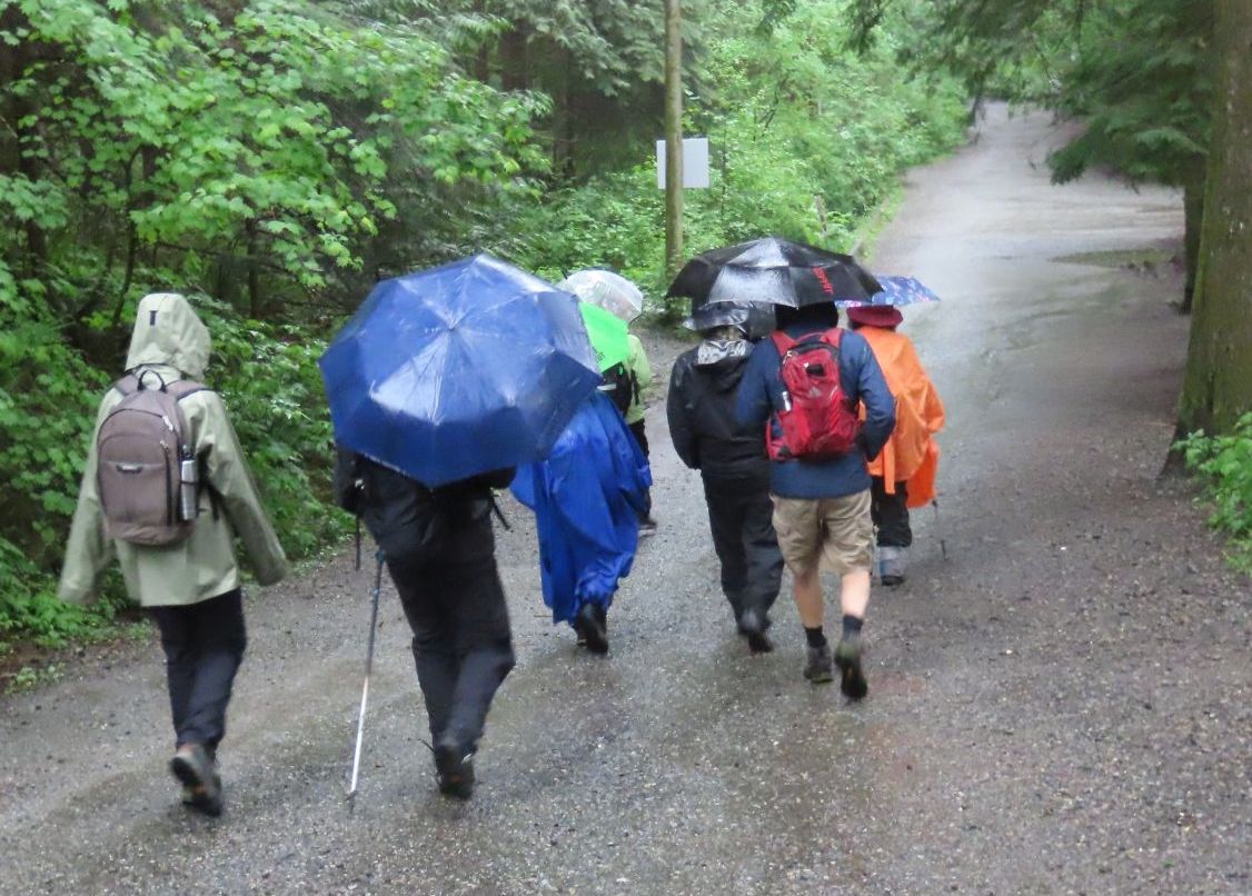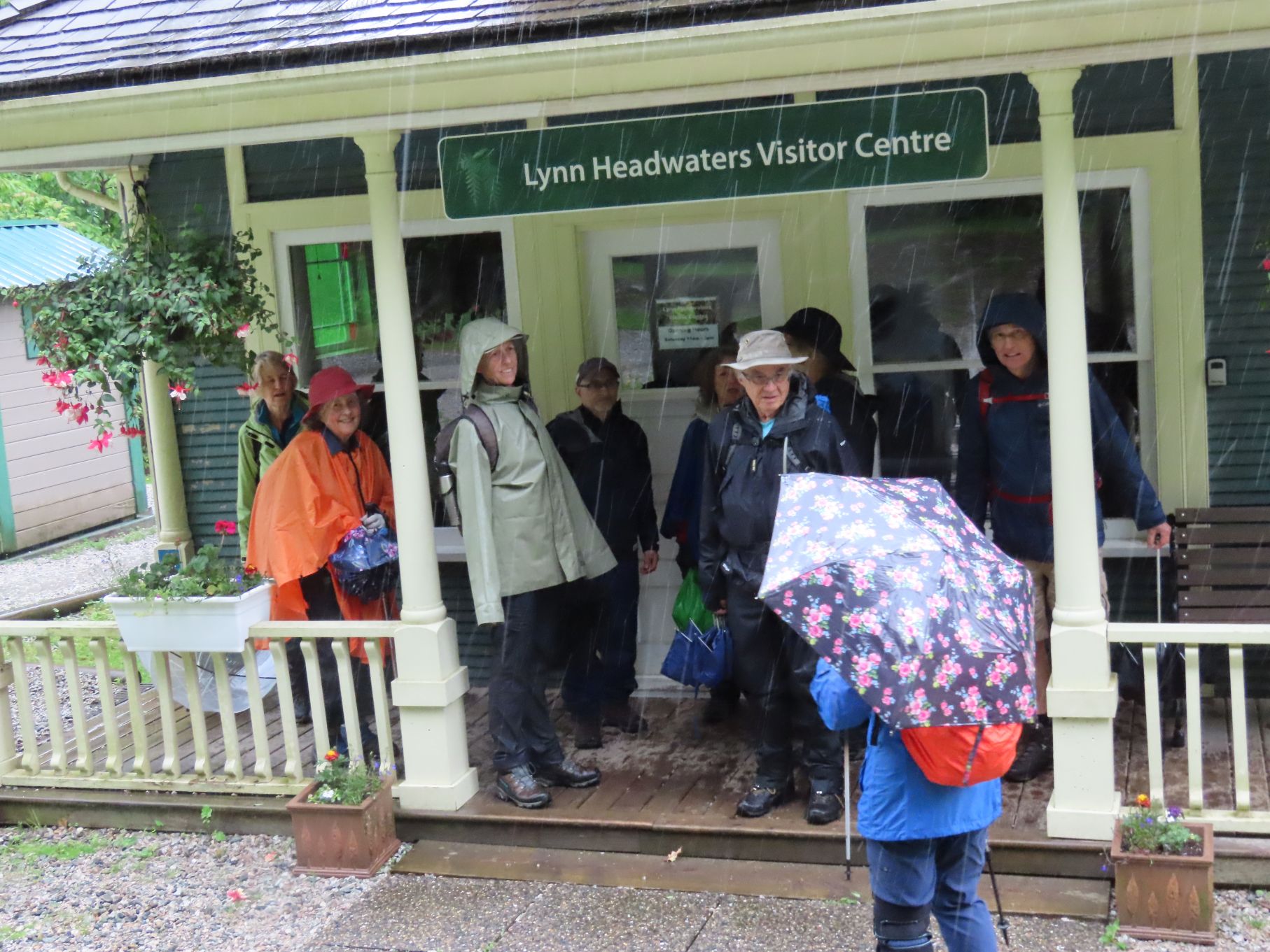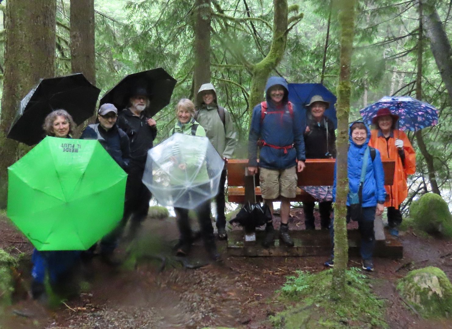 Well, I suppose a bit more detail is warranted.  Undeterred by rainfall warnings, 10 Loopers gathered at Kilmer Park at the top of Lynn Valley Road.  Under a steady rain and following this month’s leaders Diane and Fred, the group proceeded down to Lynn Creek and then took the trail north along the west side of the creek.  Shortly along the way we stopped for the starting selfie, taken minus photographer since it was too wet to stage the camera for the normal group shot.  At this point one of the group forgot her walking pole, only discovered after we were too far along to turn back.  We proceeded, fingers crossed that the pole would be there on our return.