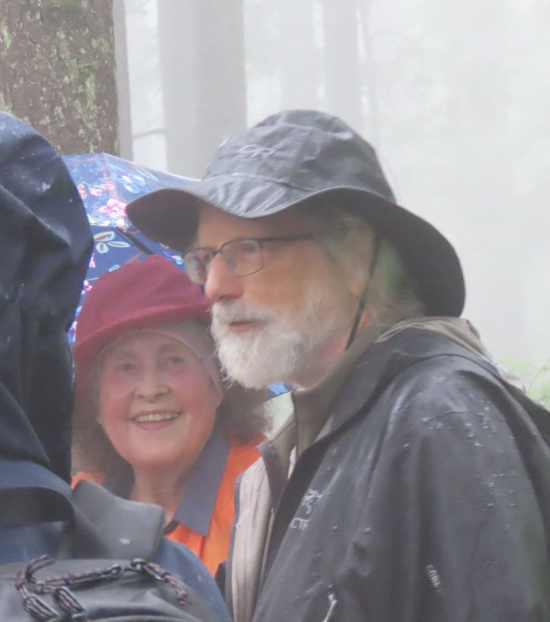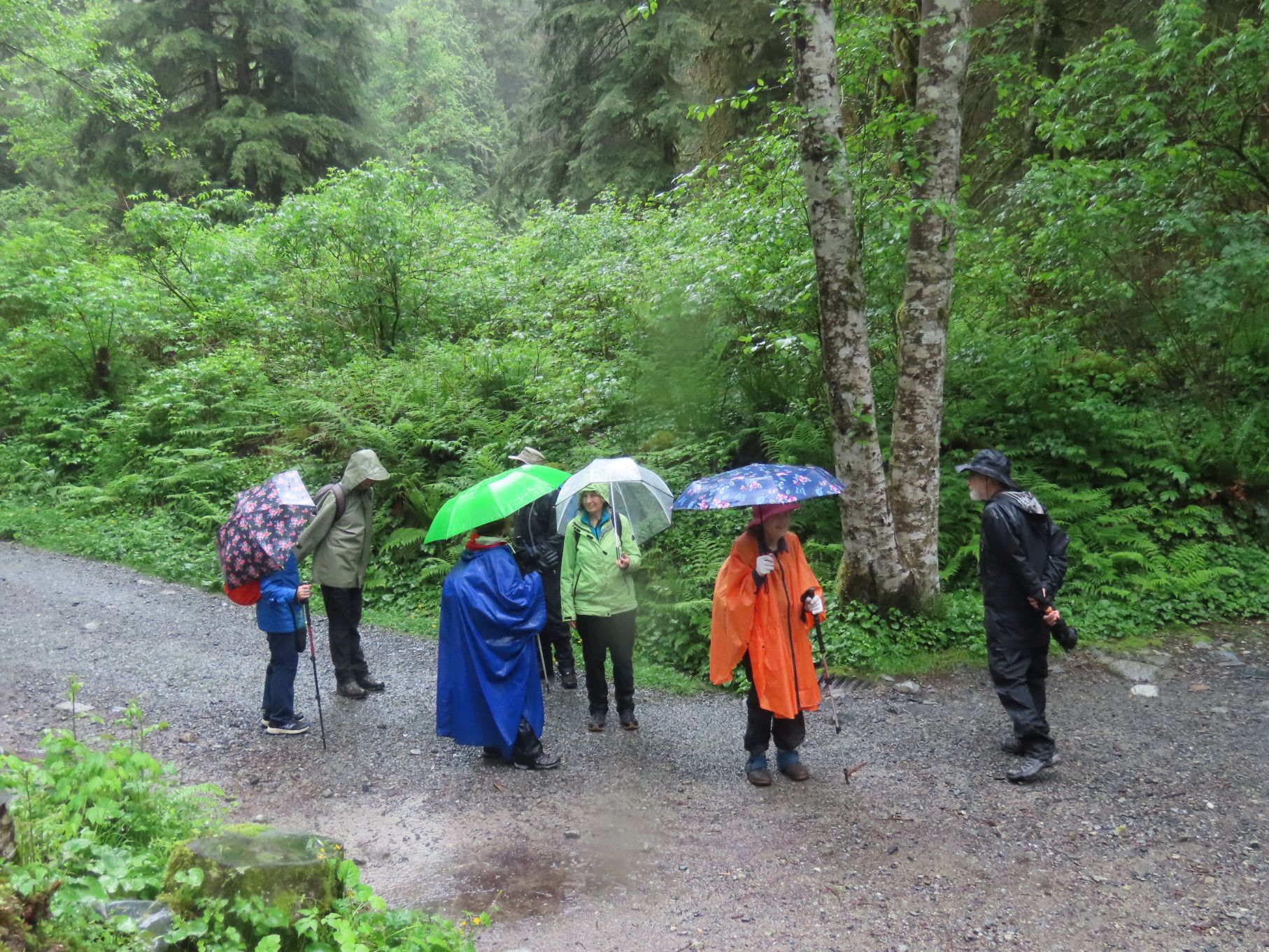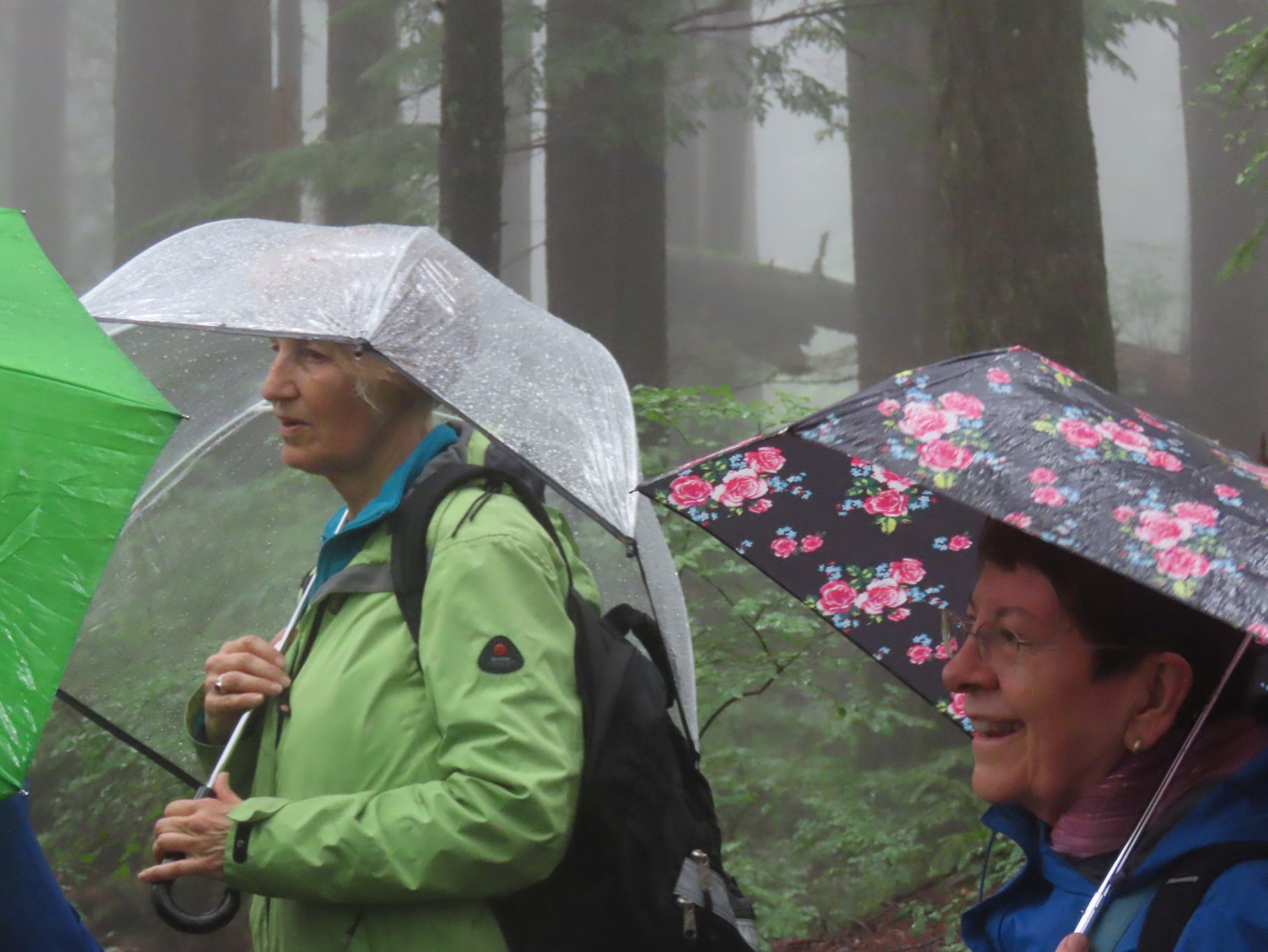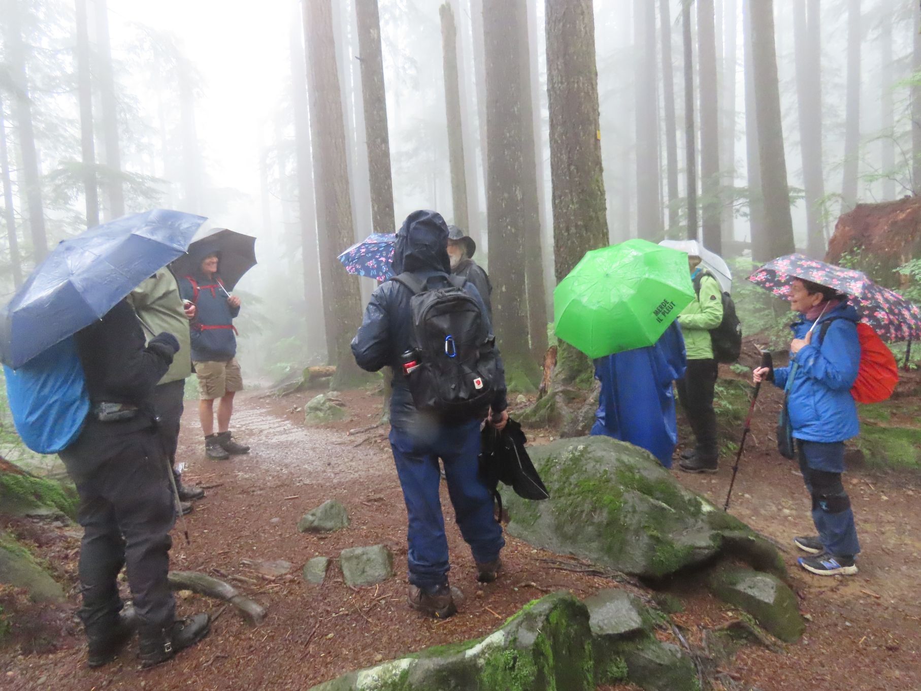 Well, I suppose a bit more detail is warranted.  Undeterred by rainfall warnings, 10 Loopers gathered at Kilmer Park at the top of Lynn Valley Road.  Under a steady rain and following this month’s leaders Diane and Fred, the group proceeded down to Lynn Creek and then took the trail north along the west side of the creek.  Shortly along the way we stopped for the starting selfie, taken minus photographer since it was too wet to stage the camera for the normal group shot.  At this point one of the group forgot her walking pole, only discovered after we were too far along to turn back.  We proceeded, fingers crossed that the pole would be there on our return.