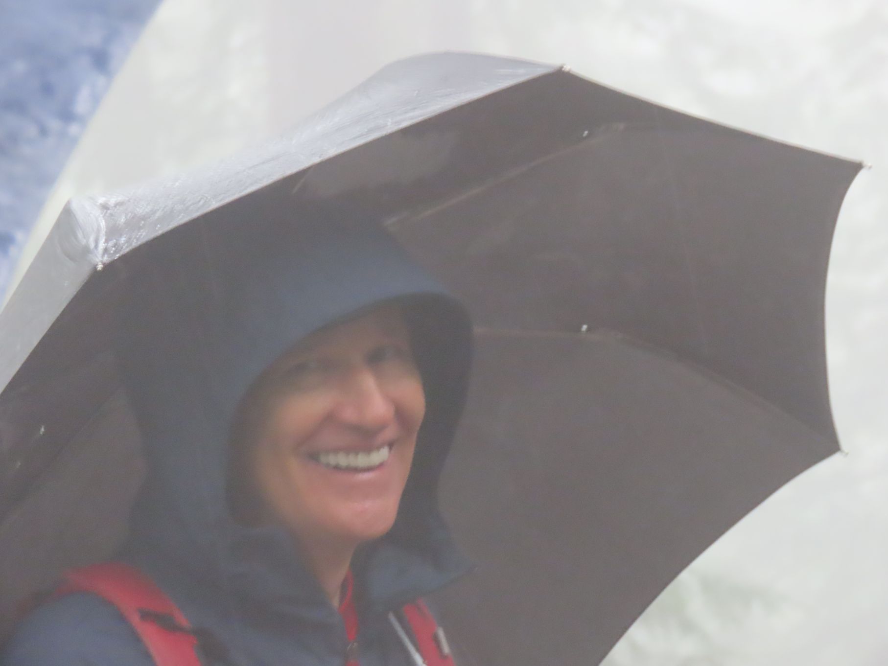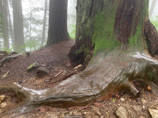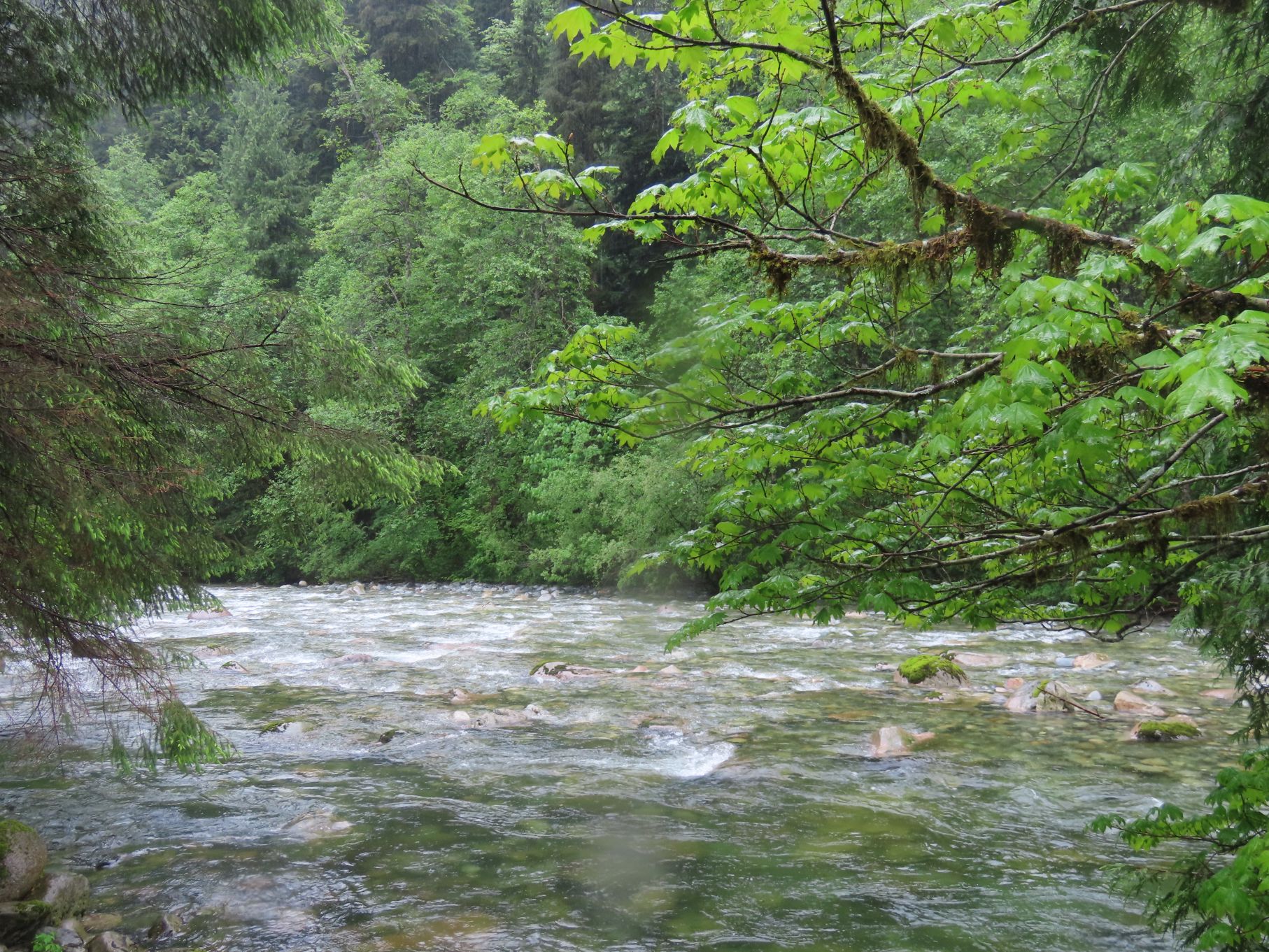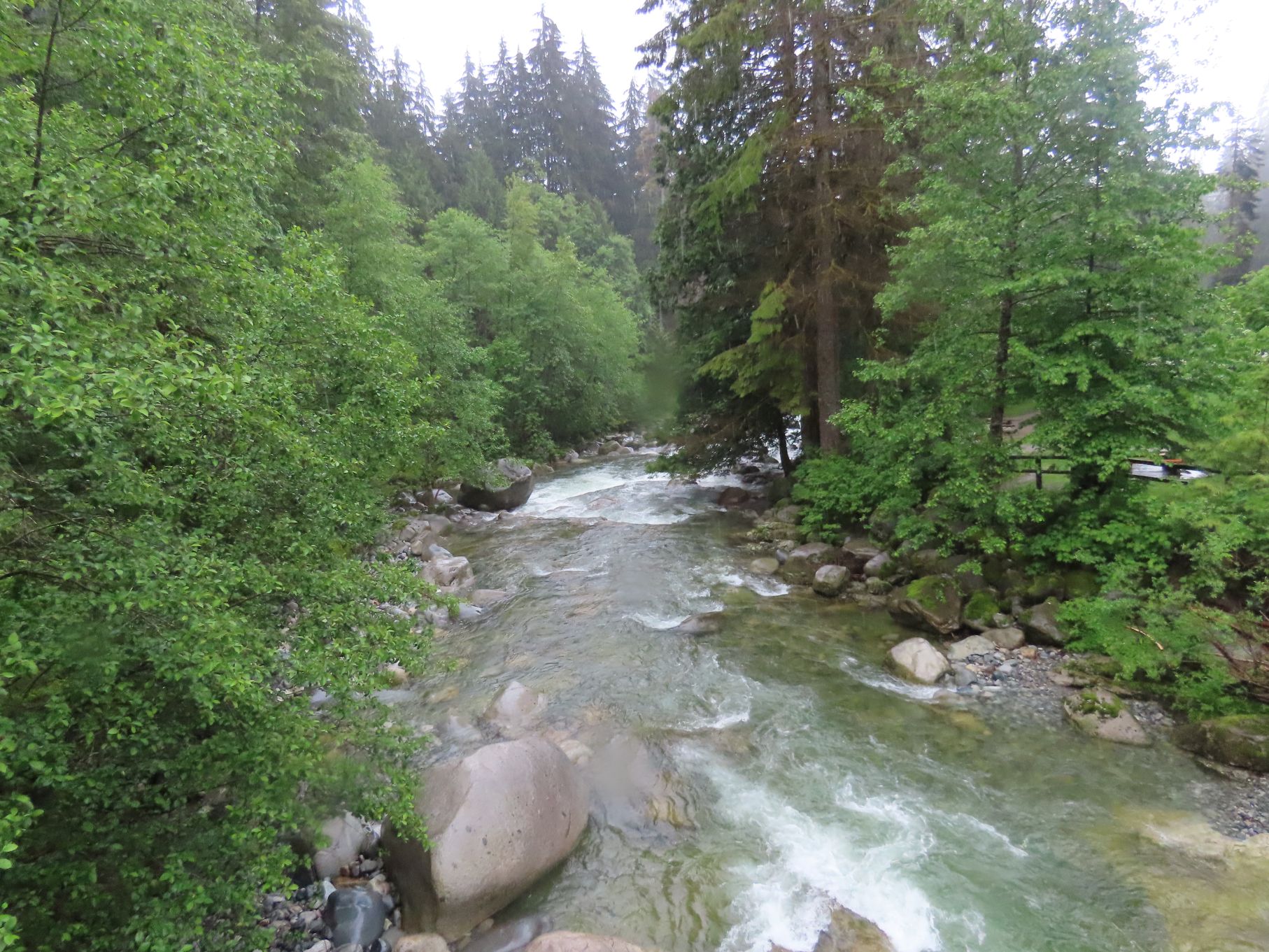 Well, I suppose a bit more detail is warranted.  Undeterred by rainfall warnings, 10 Loopers gathered at Kilmer Park at the top of Lynn Valley Road.  Under a steady rain and following this month’s leaders Diane and Fred, the group proceeded down to Lynn Creek and then took the trail north along the west side of the creek.  Shortly along the way we stopped for the starting selfie, taken minus photographer since it was too wet to stage the camera for the normal group shot.  At this point one of the group forgot her walking pole, only discovered after we were too far along to turn back.  We proceeded, fingers crossed that the pole would be there on our return.