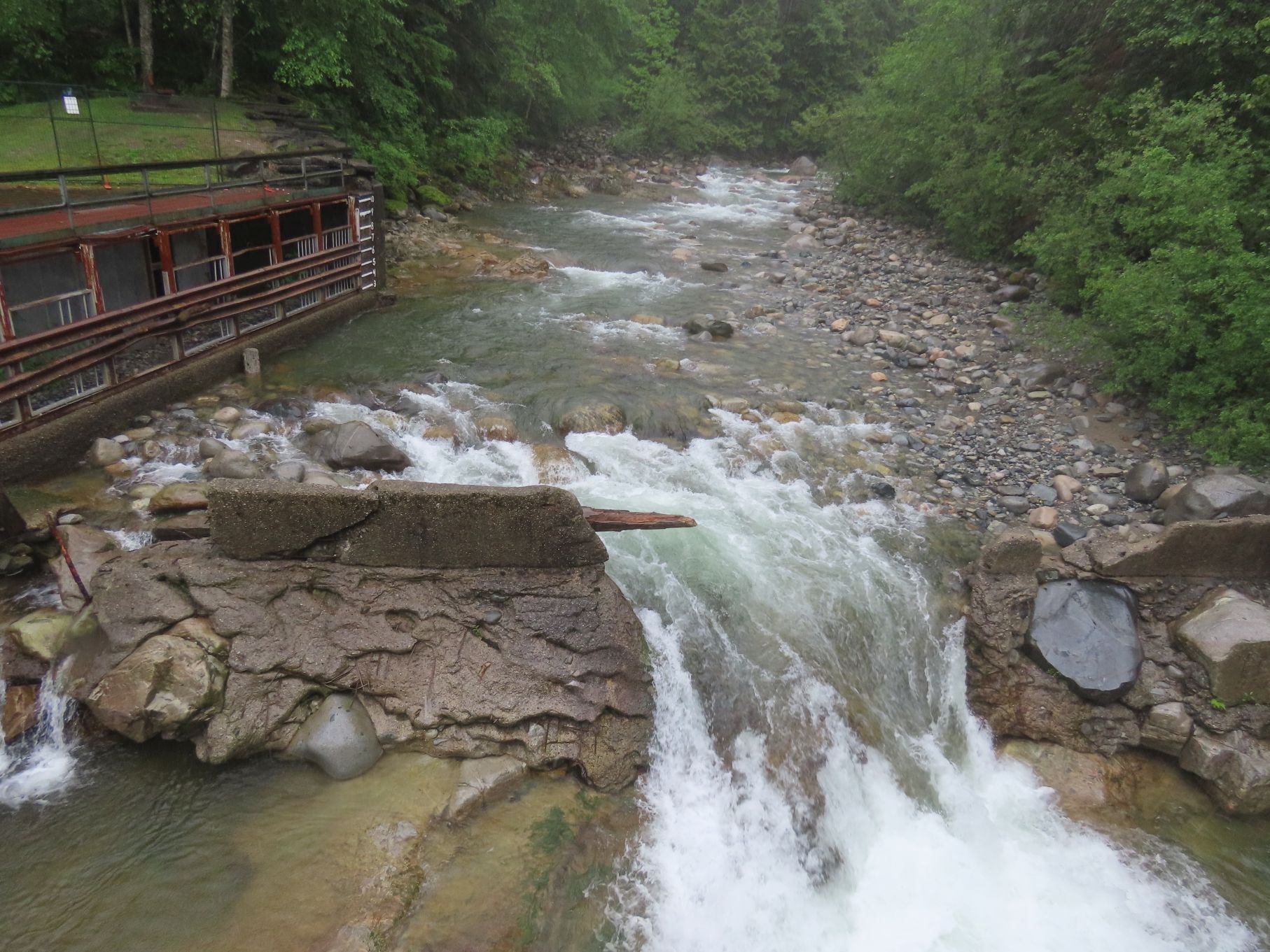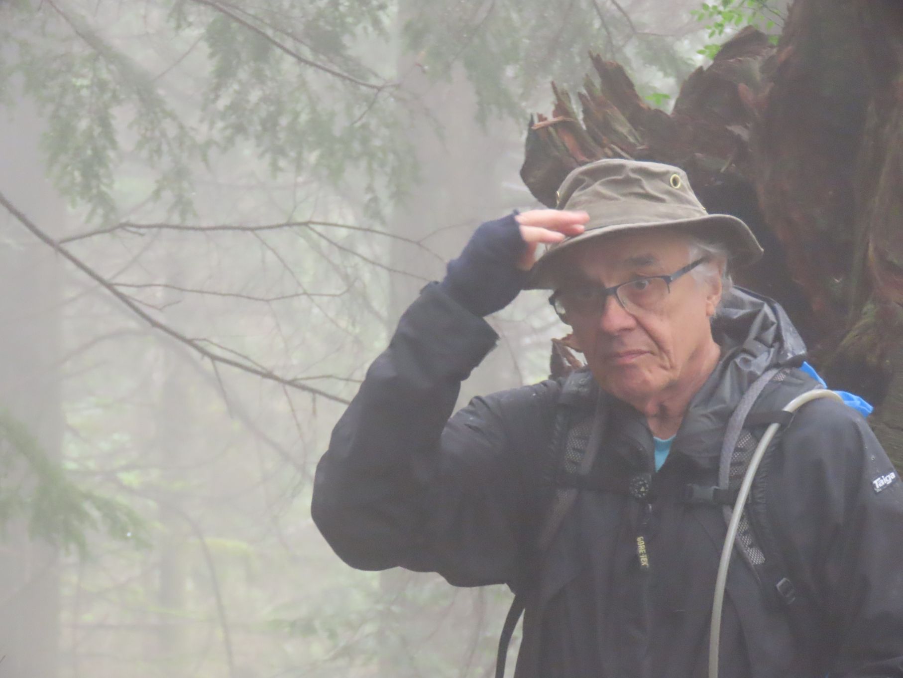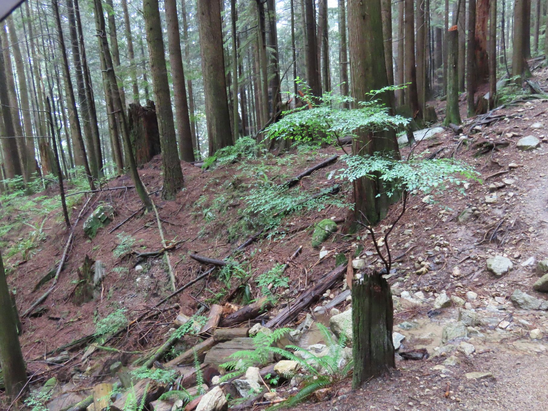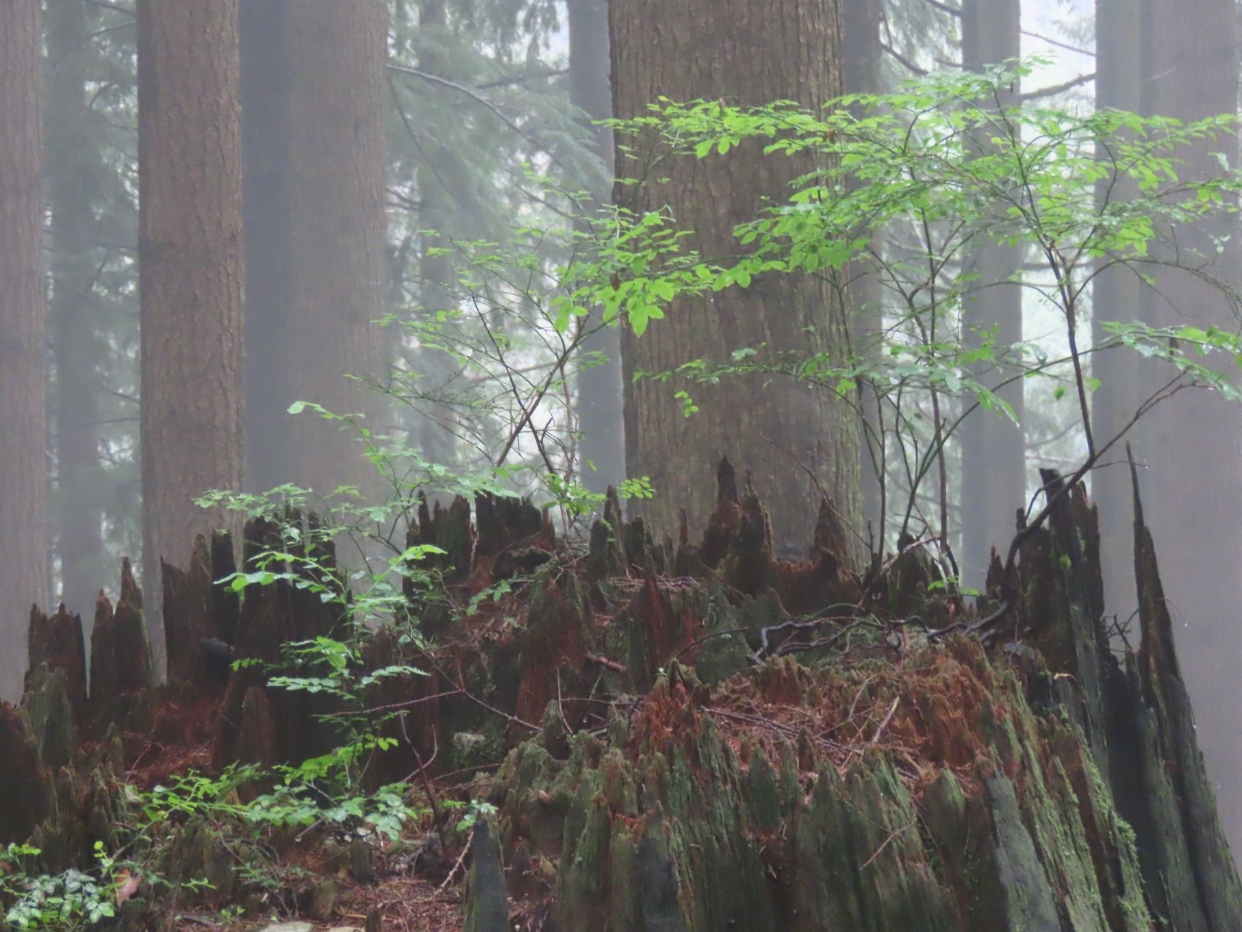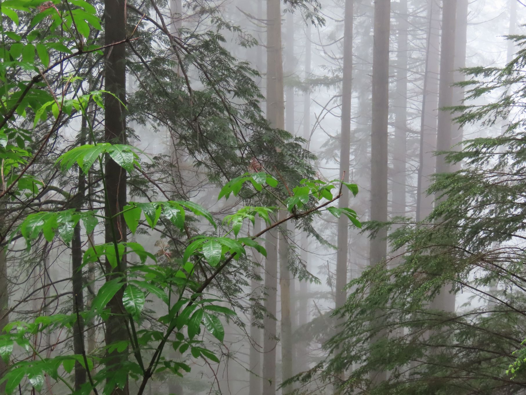 At the entrance to Lynn Headwaters Park we crossed the bridge over to the East side of the creek.  There was an impressive flow of water over the old dam just above the bridge.  After crossing we turned briefly south to reach the start of the upper trail, which climbed steadily as we turned back north.  As we climbed it became quite misty.