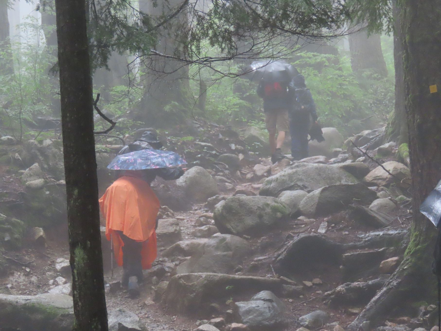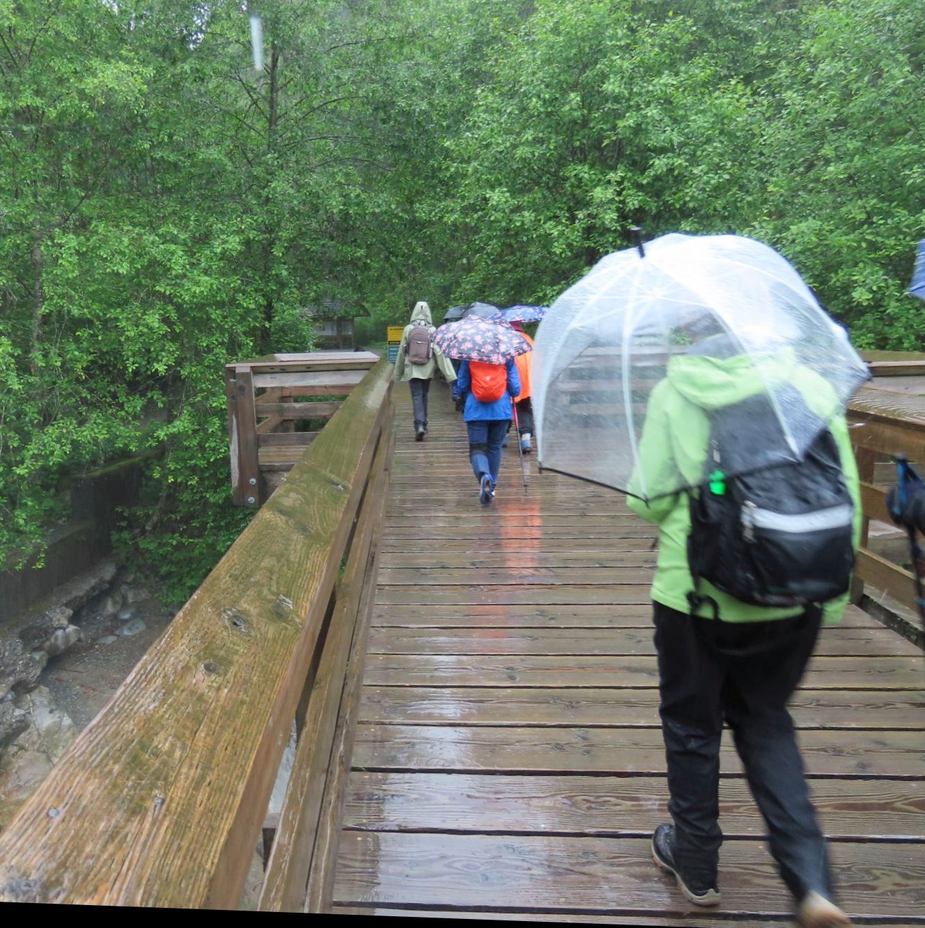 We had a brief snack break in the rain, which had let up slightly by that point, before descending to creek level via a series of wooden steps,  We then turned south and followed the creek back down to the bridge we had previously crossed.