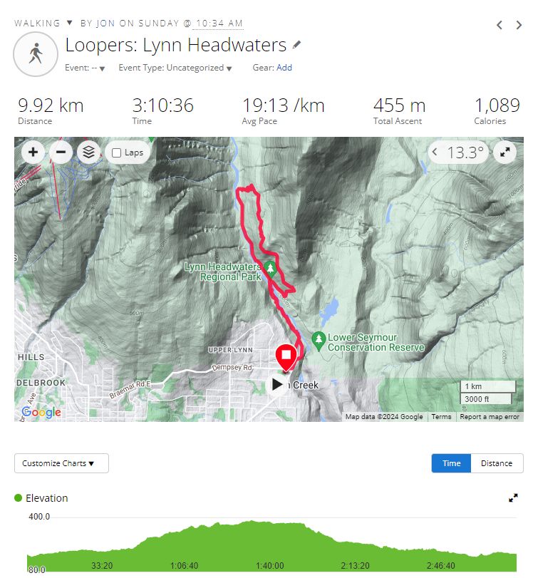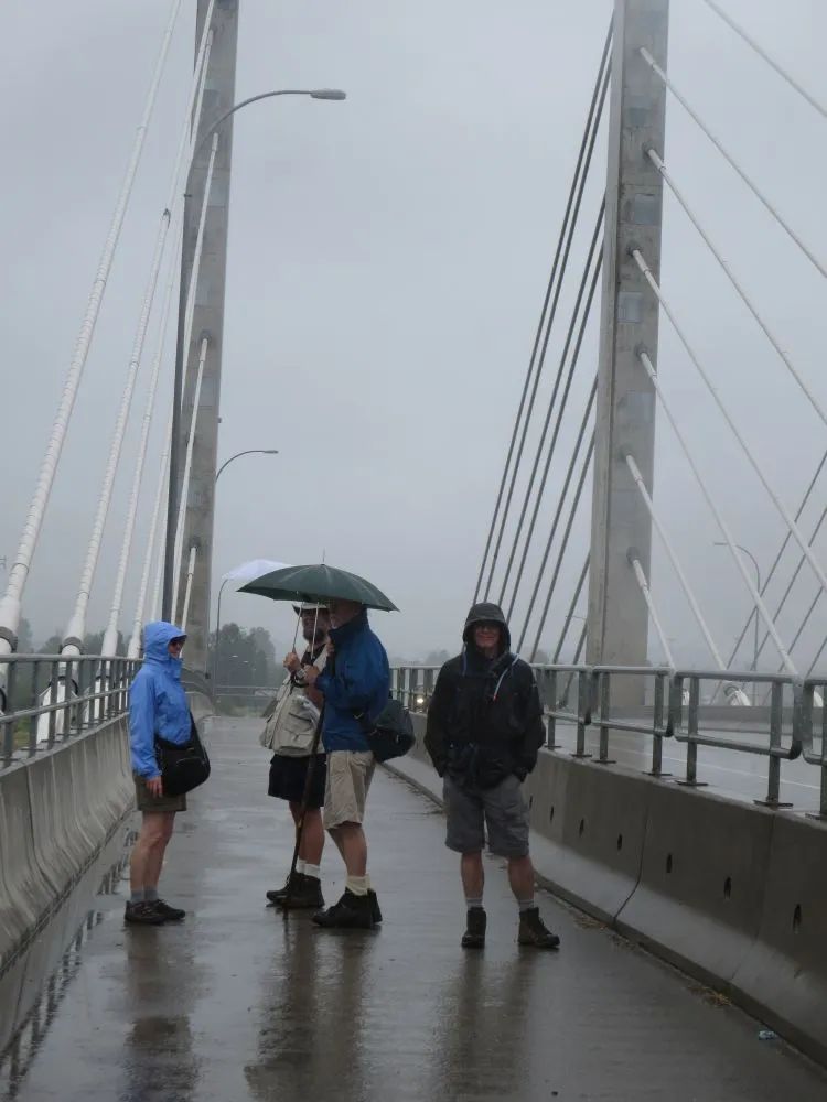 Afters were at GoodCo on Dollarton Highway, where we were joined by three Loopers who had been unable to do the hike.  There was some discussion as to where this hike ranked in terms of the wettest Looper outings of all time.  Your faithful scribe believes it likely ranks in the top 3.  First of note to me was in our first year, July 6, 2014 (Port Coquitlam to Pitt River).  After that outing I came down with pneumonia!  The second, memorable to many Loopers, was November 1, 2015 (Semiahoo to the Peace Arch).  That one featured biting cold and horizontal rain along the White Rock shore, and the first deployment of the infamous blue poncho.