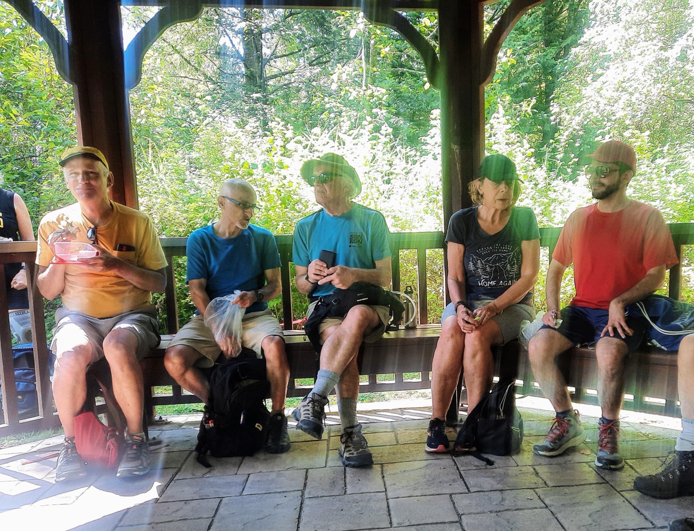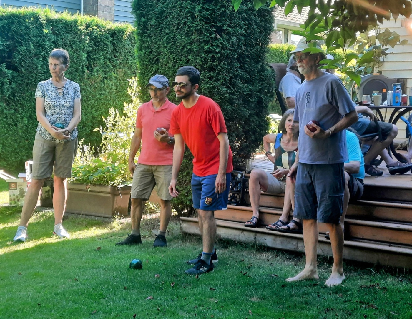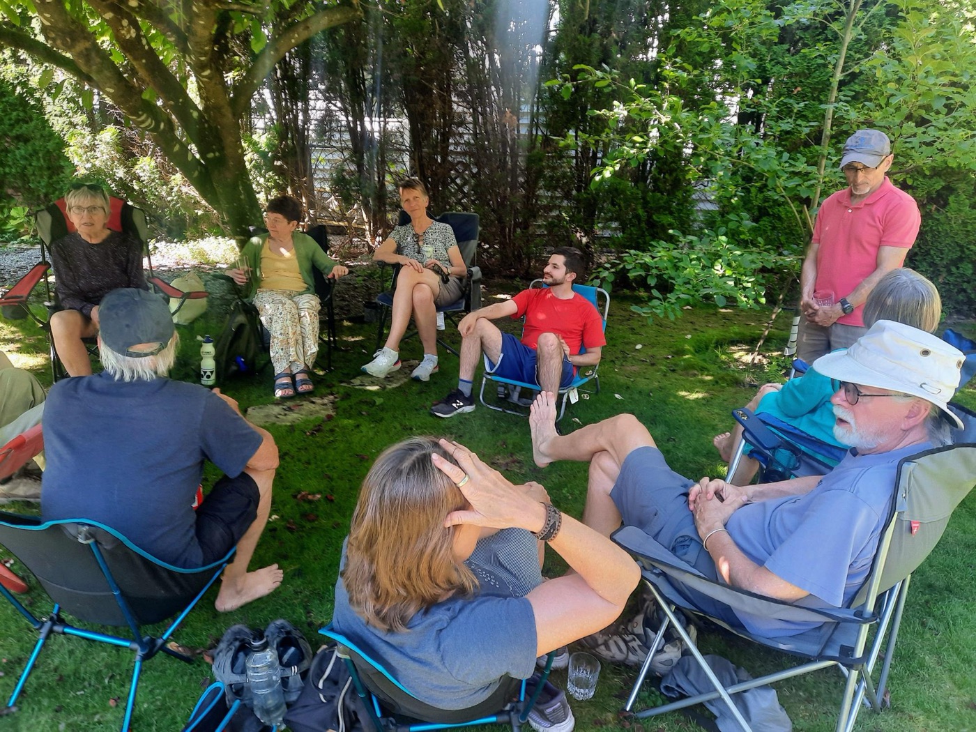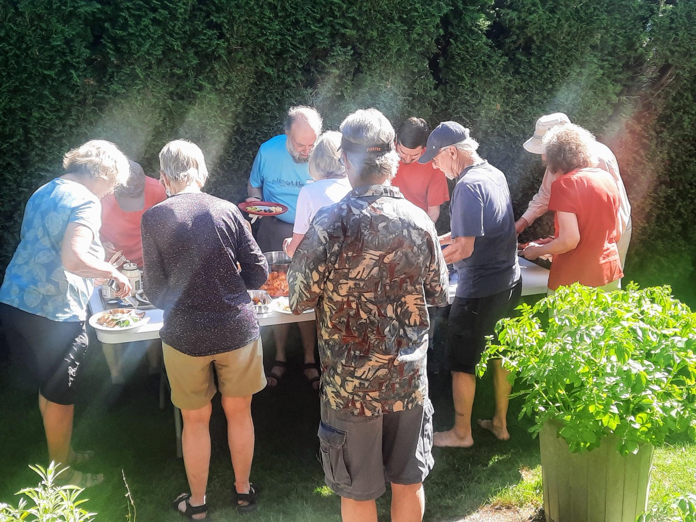 The day concluded with our annual BBQ, hosted once again by Ralph, Tina, and Maki, with Jon and Sandy serving as our grill-meisters. Our numbers at the BBQ were supplemented by several bonus Loopers, who had been unable to take part in the walk itself. Loopers could be observed lounging in various groupings about the yard: the shade-loving Loopers sought shade, while the solar-powered Loopers bronzed themselves in the sun. A lavish table of salads and other fine food offerings was spread in the shade. People partook, beverages were quaffed, and conversations took place, as well as bocce.
