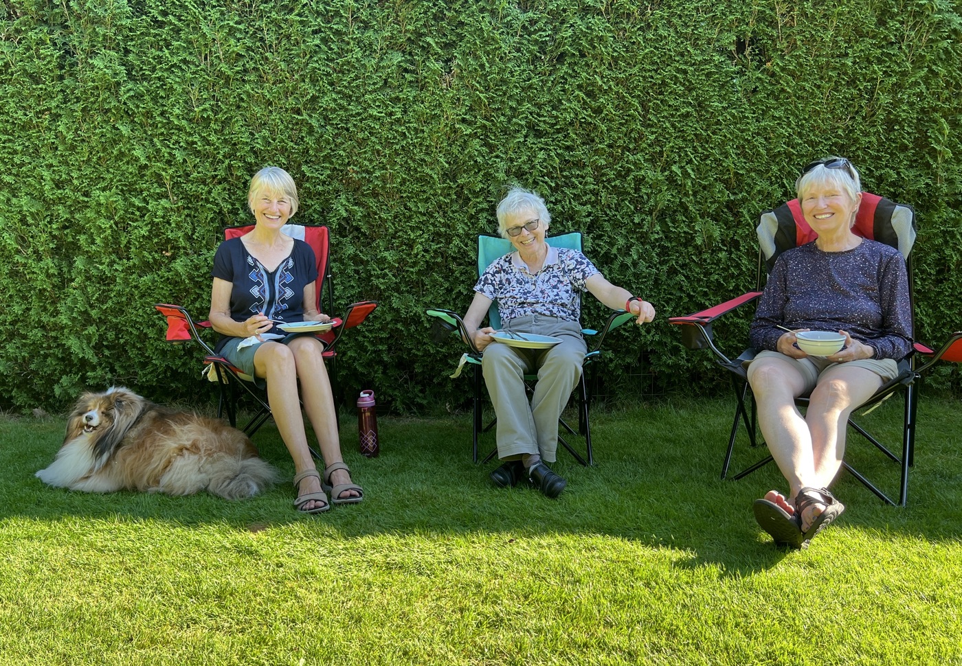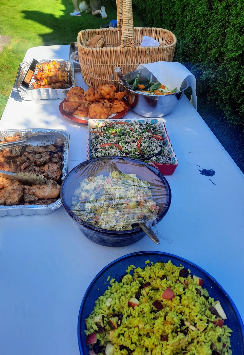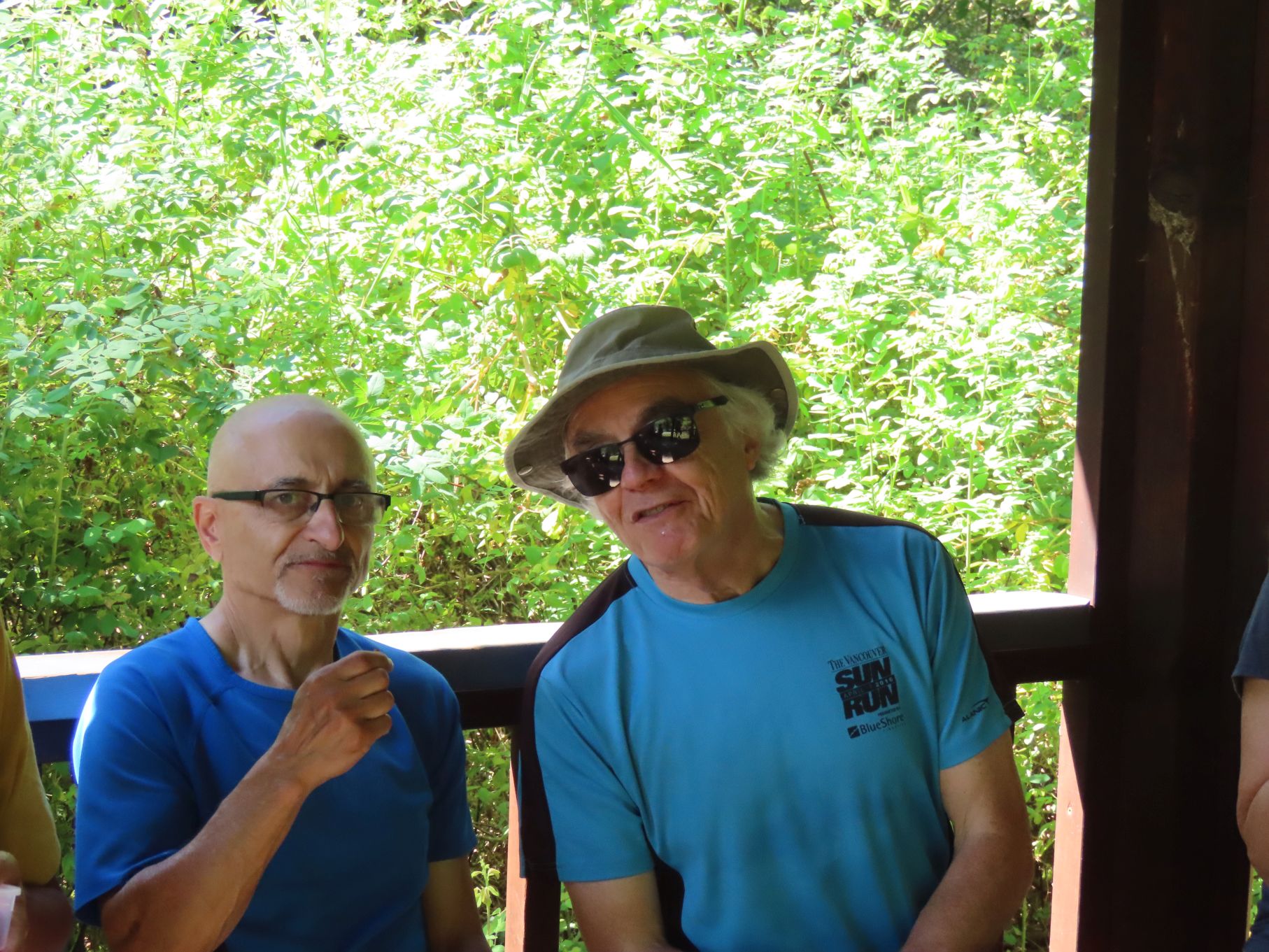 The day concluded with our annual BBQ, hosted once again by Ralph, Tina, and Maki, with Jon and Sandy serving as our grill-meisters. Our numbers at the BBQ were supplemented by several bonus Loopers, who had been unable to take part in the walk itself. Loopers could be observed lounging in various groupings about the yard: the shade-loving Loopers sought shade, while the solar-powered Loopers bronzed themselves in the sun. A lavish table of salads and other fine food offerings was spread in the shade. People partook, beverages were quaffed, and conversations took place, as well as bocce.