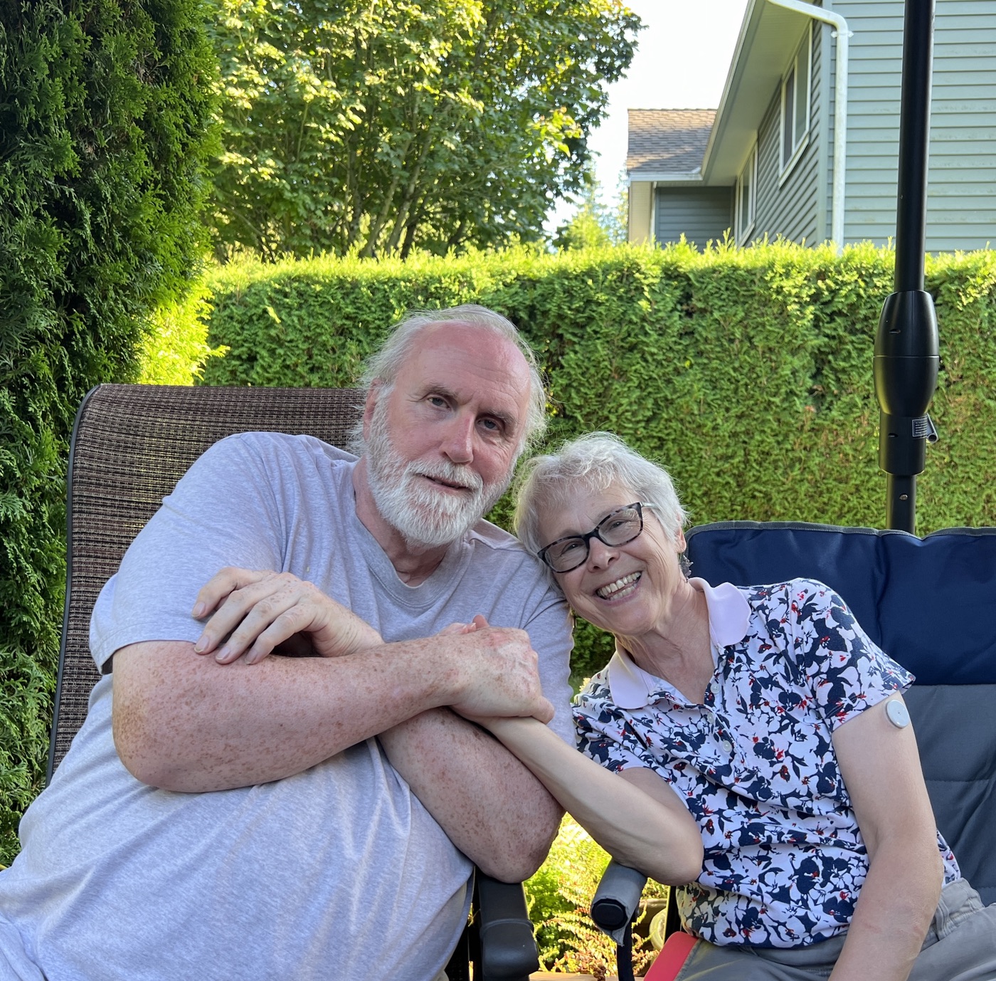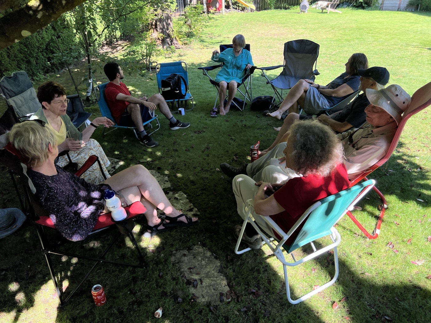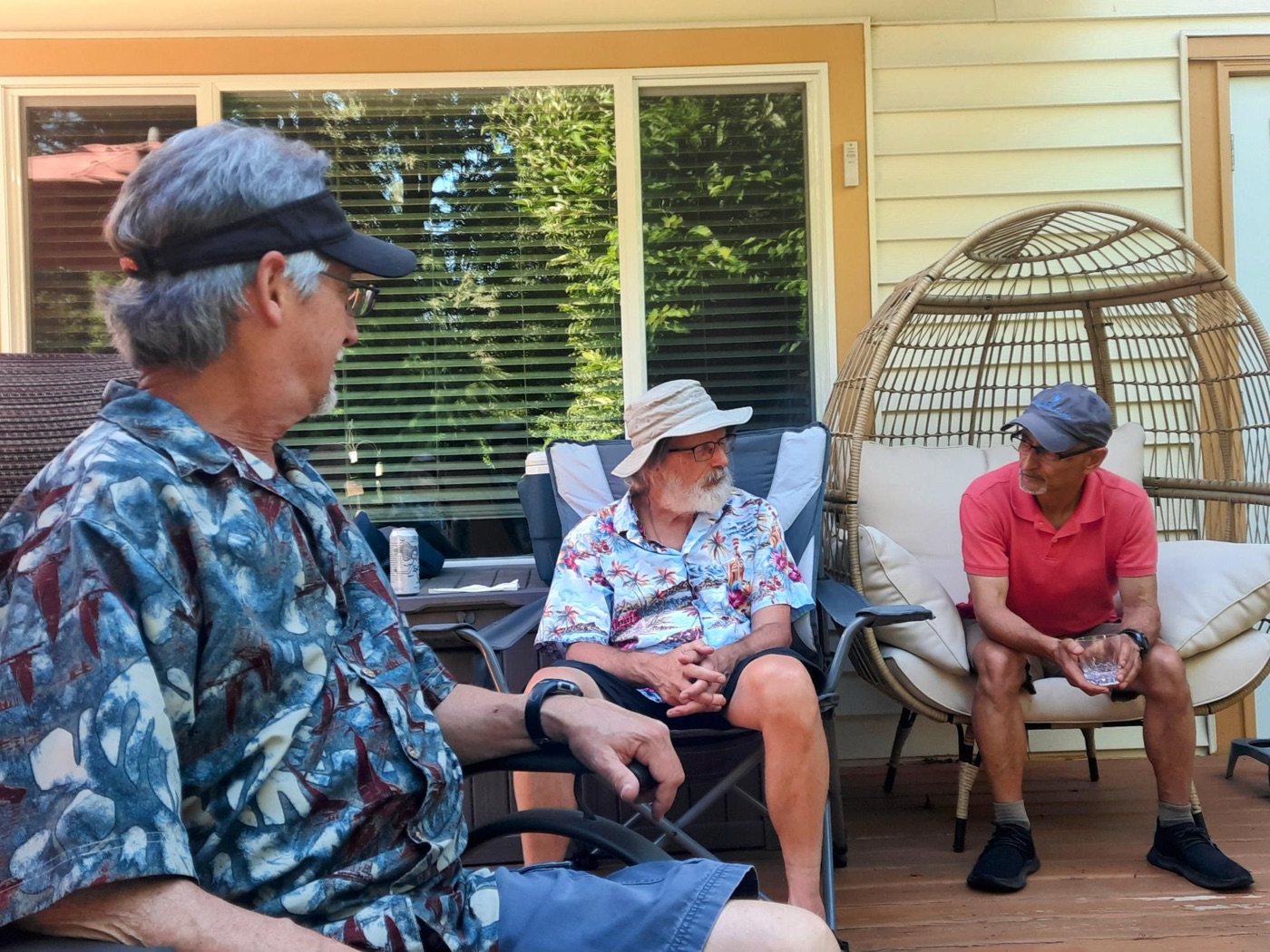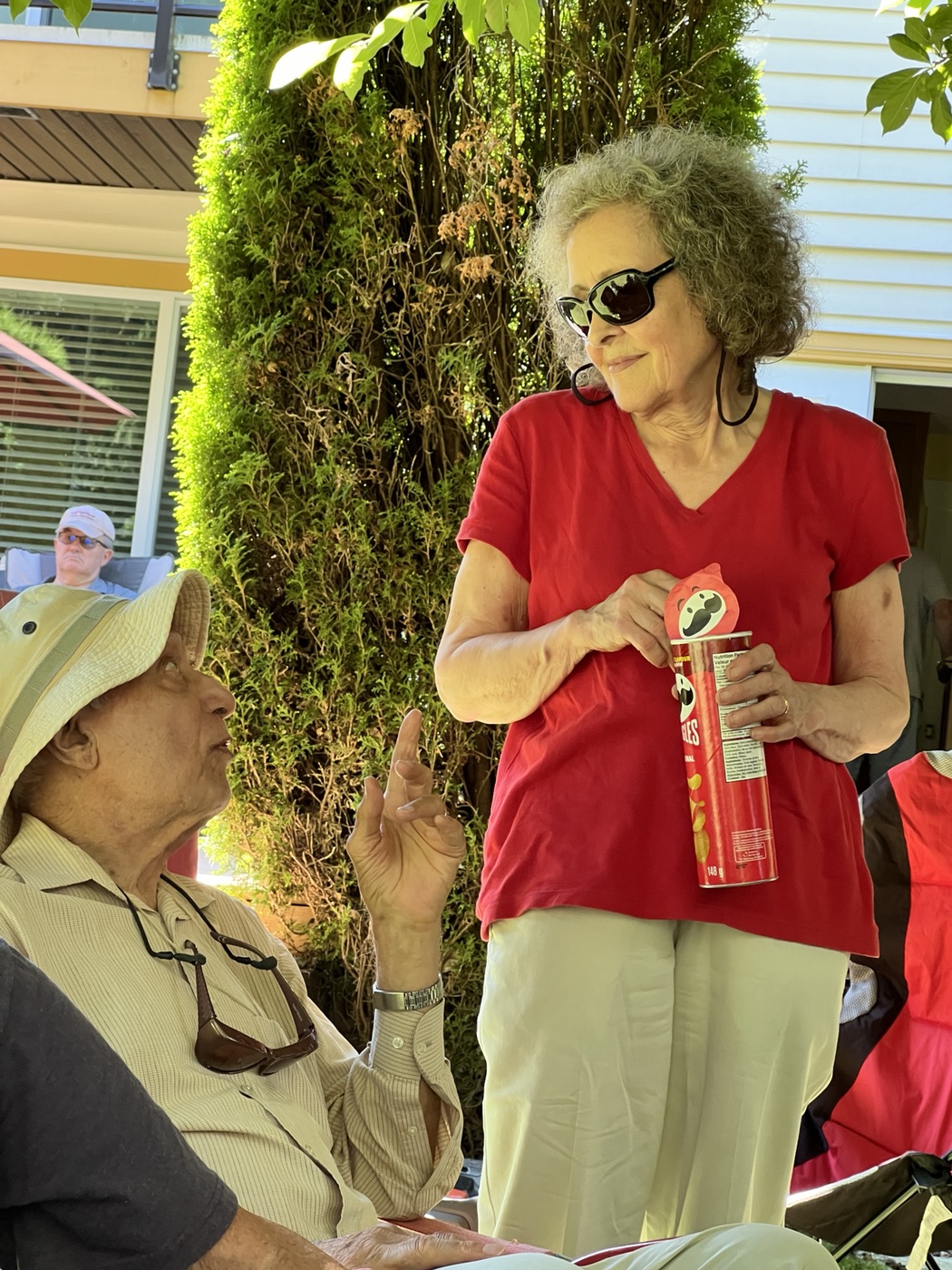 The day concluded with our annual BBQ, hosted once again by Ralph, Tina, and Maki, with Jon and Sandy serving as our grill-meisters. Our numbers at the BBQ were supplemented by several bonus Loopers, who had been unable to take part in the walk itself. Loopers could be observed lounging in various groupings about the yard: the shade-loving Loopers sought shade, while the solar-powered Loopers bronzed themselves in the sun. A lavish table of salads and other fine food offerings was spread in the shade. People partook, beverages were quaffed, and conversations took place, as well as bocce.