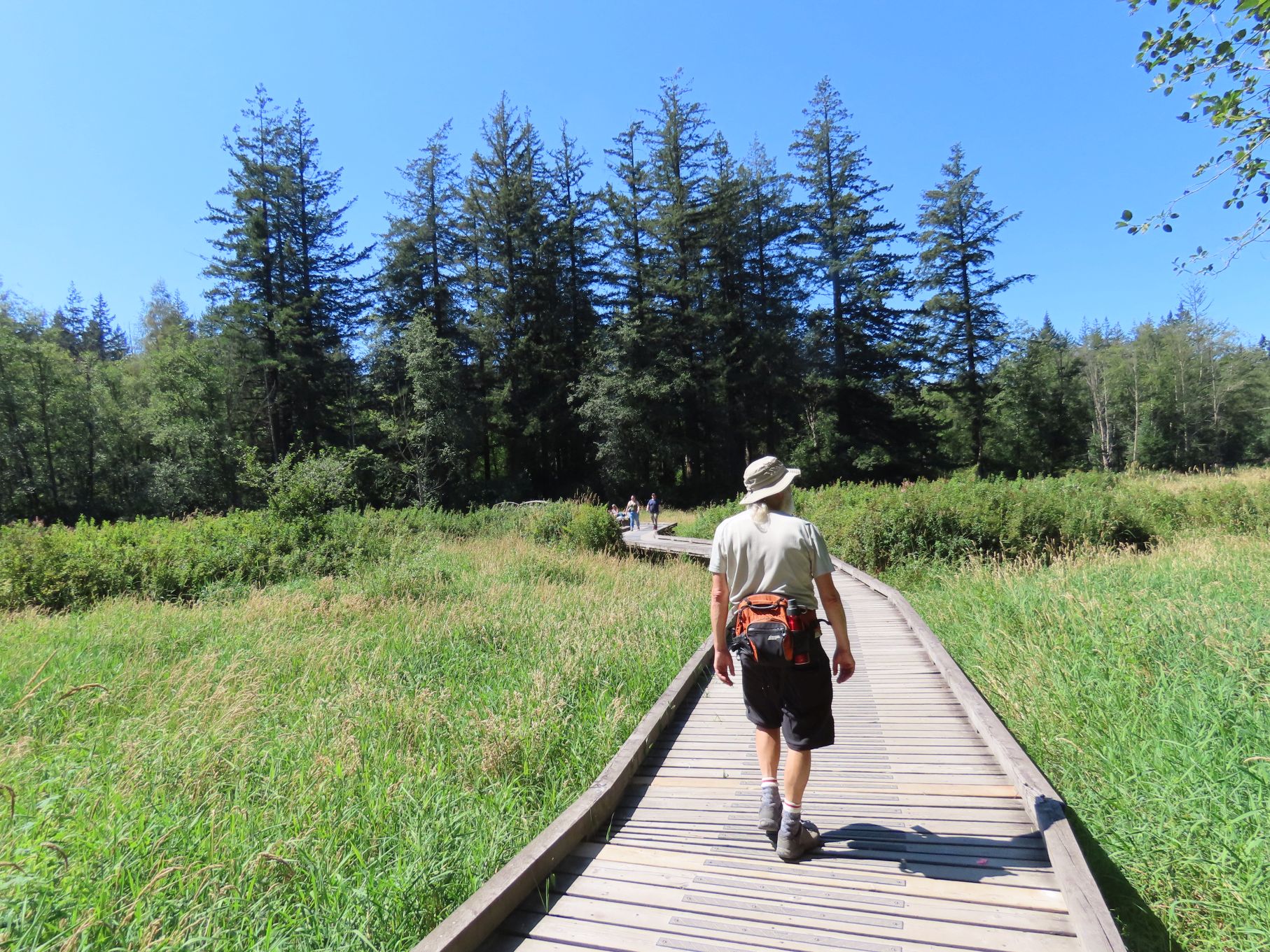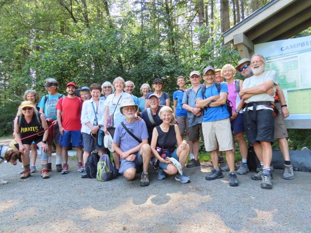 The latter method gets complicated if a dog is present, so we’ve used the former method to arrive at our count of 21 souls for the August Looper expedition in Campbell Valley; plus Maisie. One soul, hobbled by an Achilles inflammation, remained at the start of the walk with a chair and a book. The rest of us set out, chit-chatting as we walked. Cleverly, Jon had arranged things so that all of the elevation gain was positioned at the start of the walk, when everyone was fresh.