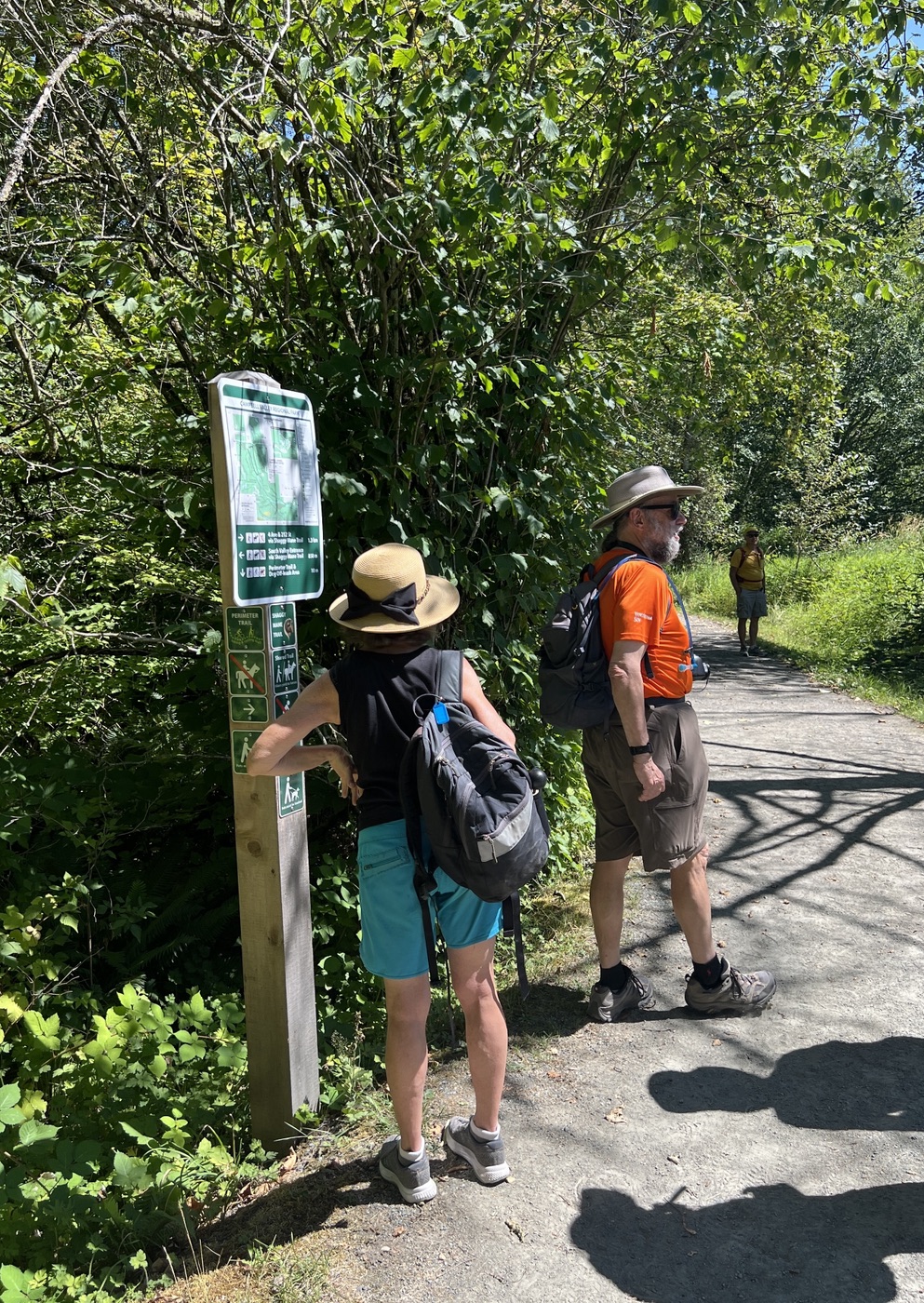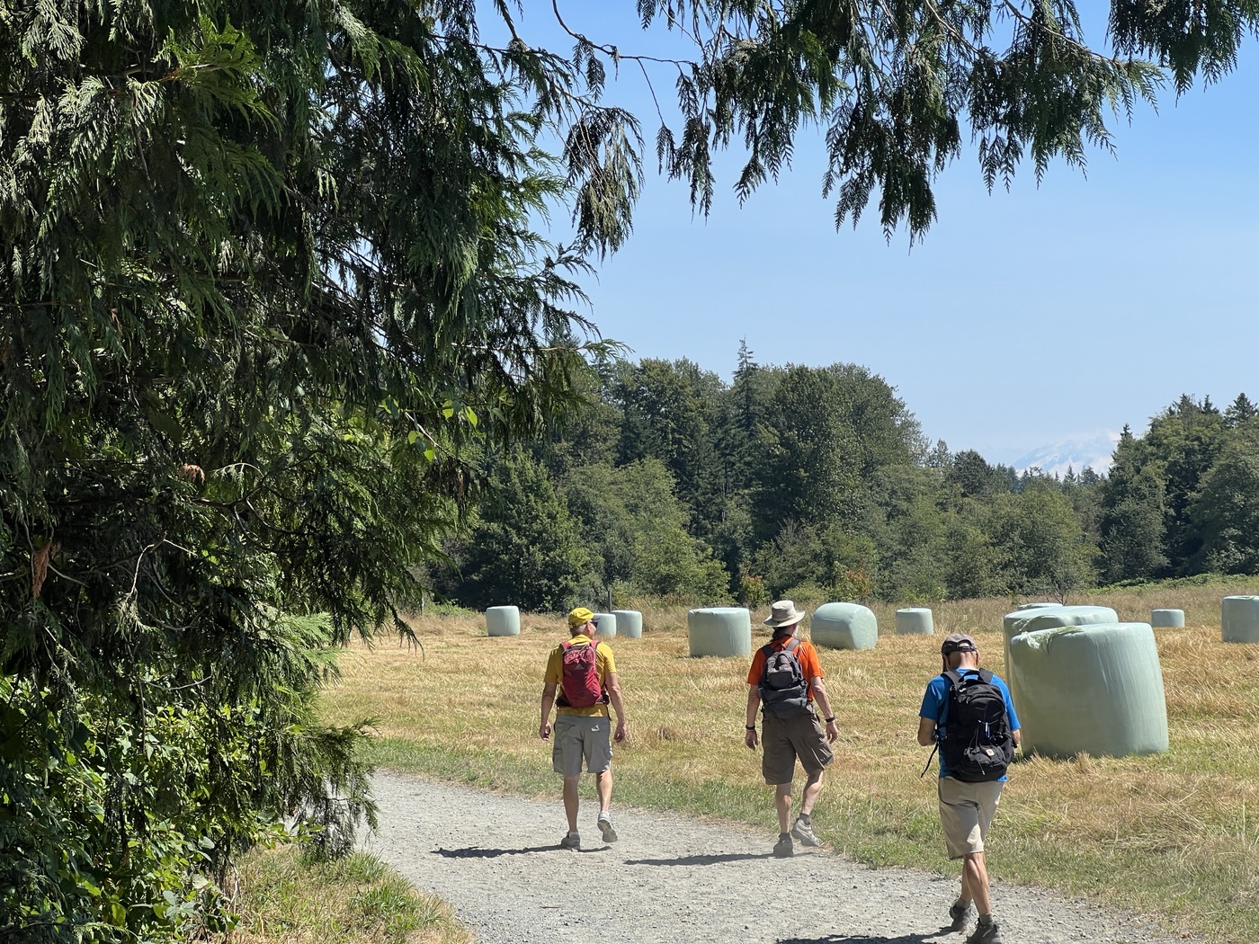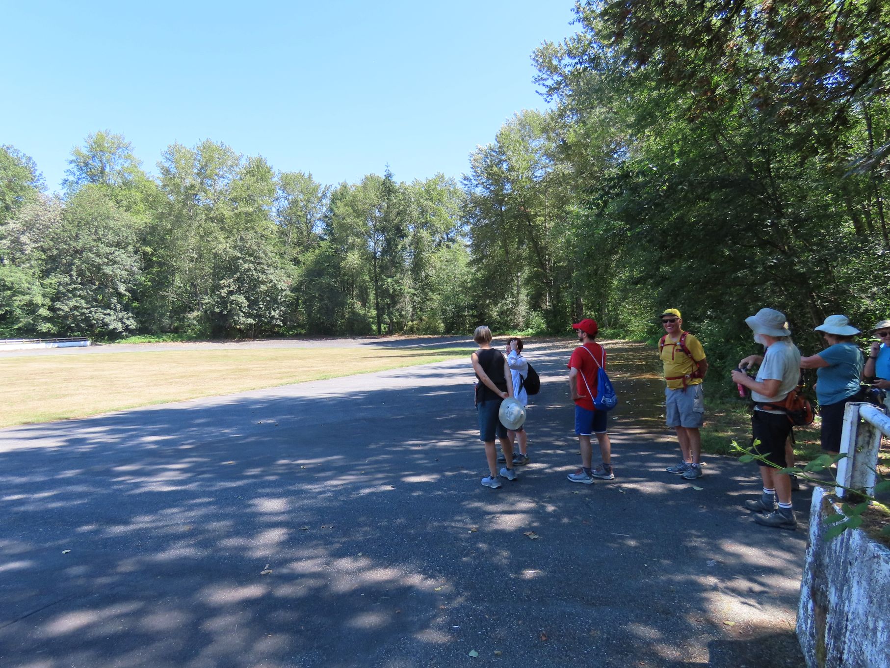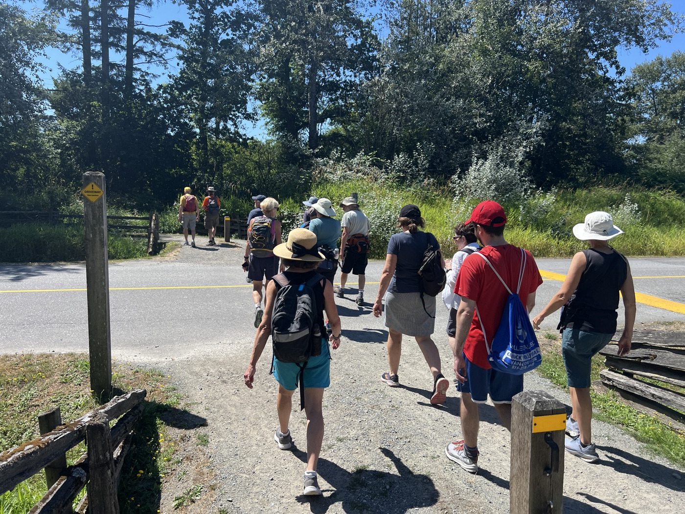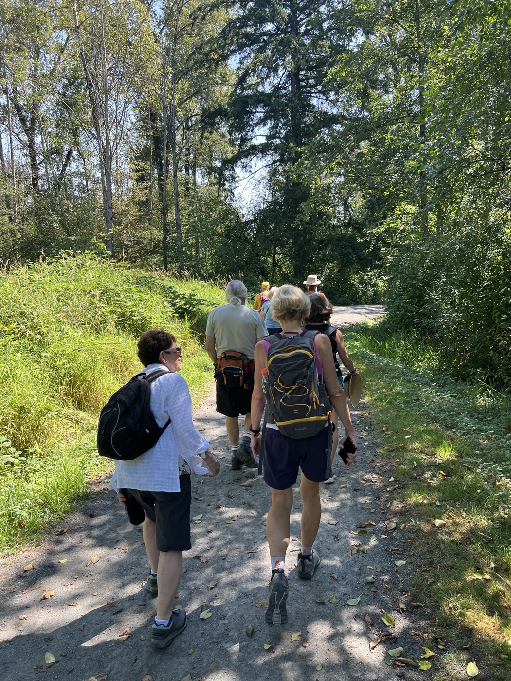 The August walk was organized and led by Jon, who had selected the labyrinthine trails of the Campbell Valley Regional Park as our August destination. Two routes were on offer: an 11 km loop, and a 5.5 km loop, for those who preferred to loop in moderation. Since our traditional annual BBQ was to follow the walk, we’d first met up at the home of Ralph, Tina, and Maki in Walnut Grove, so that pot-luck contributions could be spared the blazing sun. From there we car-pooled to the Campbell Valley Regional Park, a 25 minute ride due south, which resulted in an actual start time of approximately 11:19.