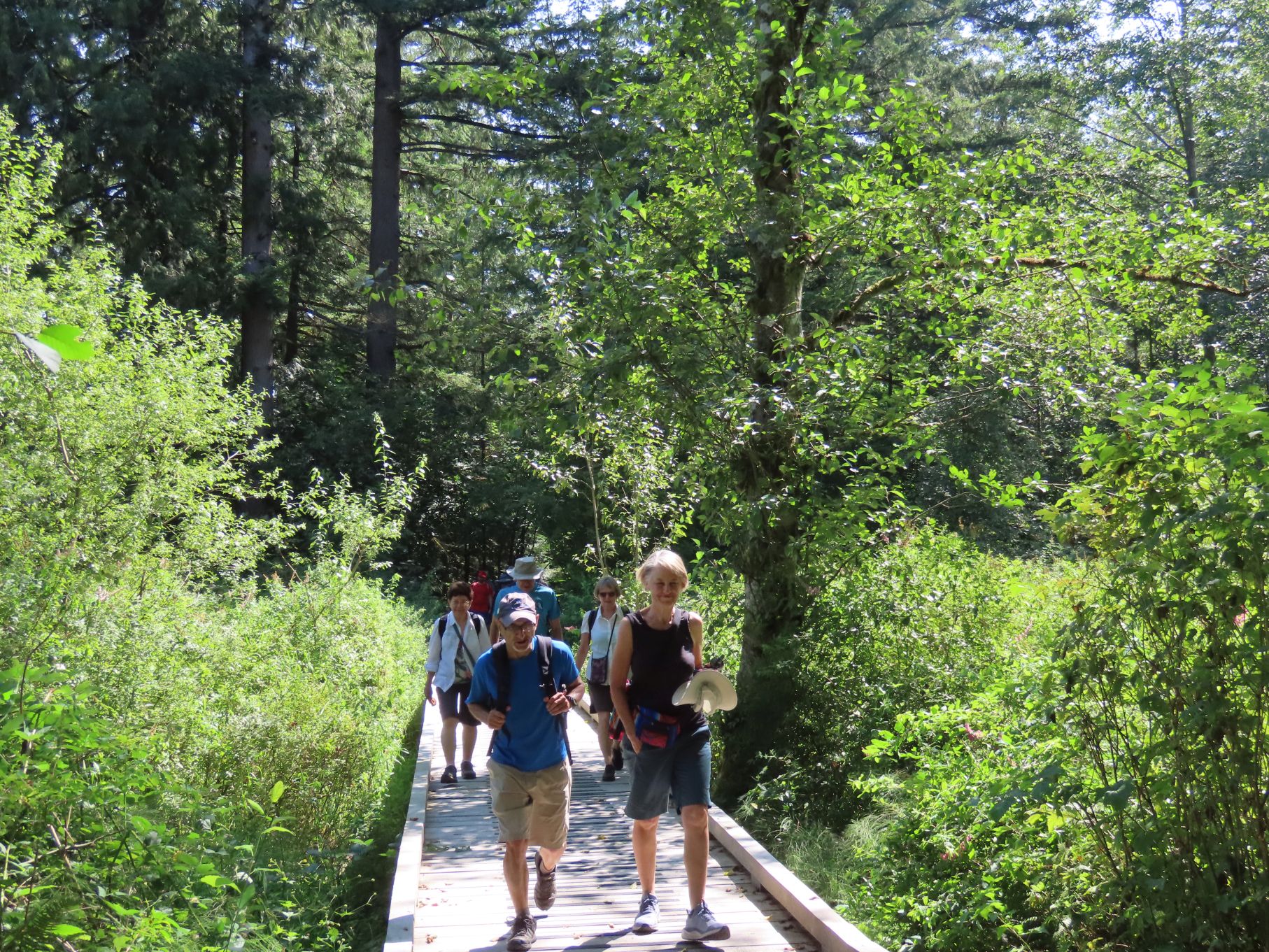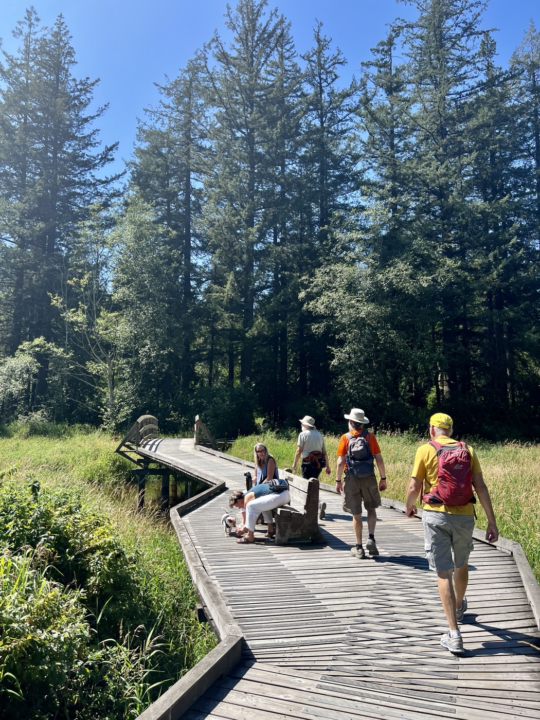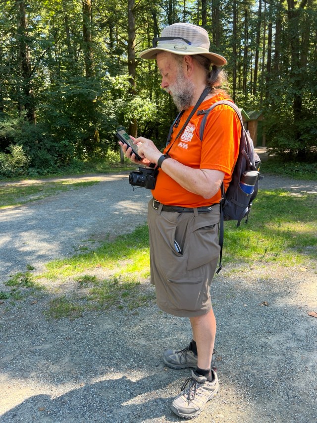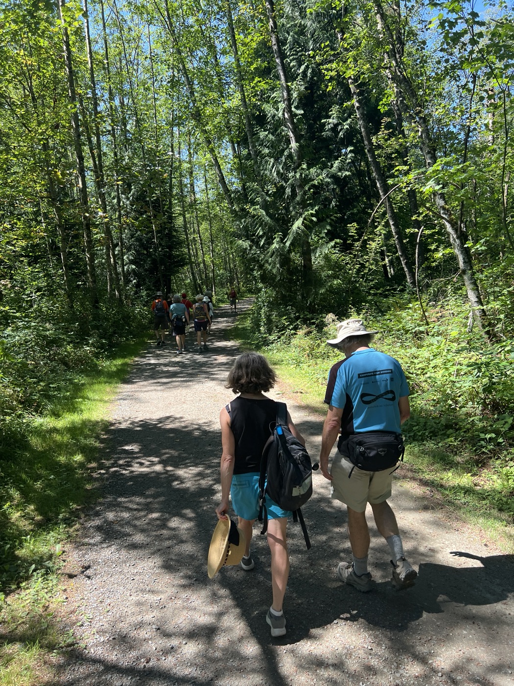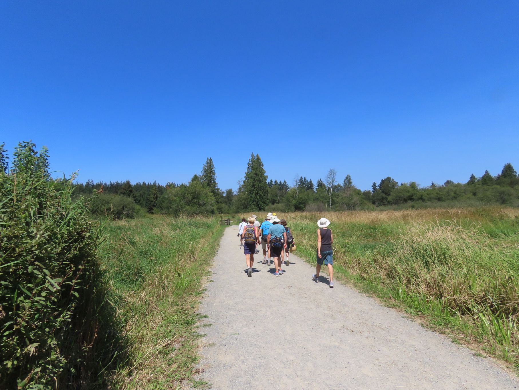 The August walk was organized and led by Jon, who had selected the labyrinthine trails of the Campbell Valley Regional Park as our August destination. Two routes were on offer: an 11 km loop, and a 5.5 km loop, for those who preferred to loop in moderation. Since our traditional annual BBQ was to follow the walk, we’d first met up at the home of Ralph, Tina, and Maki in Walnut Grove, so that pot-luck contributions could be spared the blazing sun. From there we car-pooled to the Campbell Valley Regional Park, a 25 minute ride due south, which resulted in an actual start time of approximately 11:19.