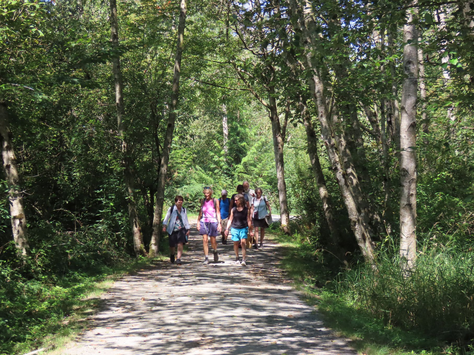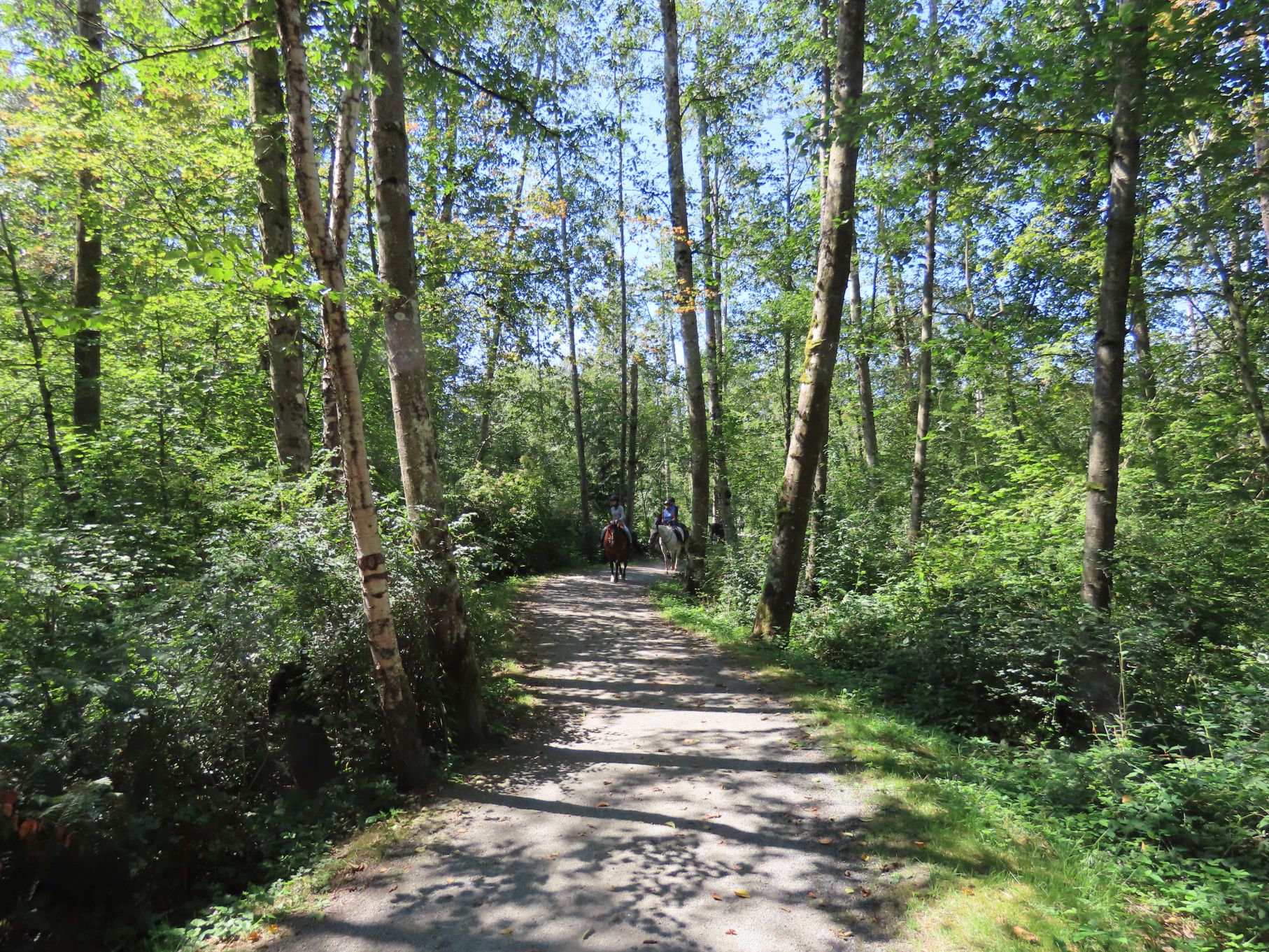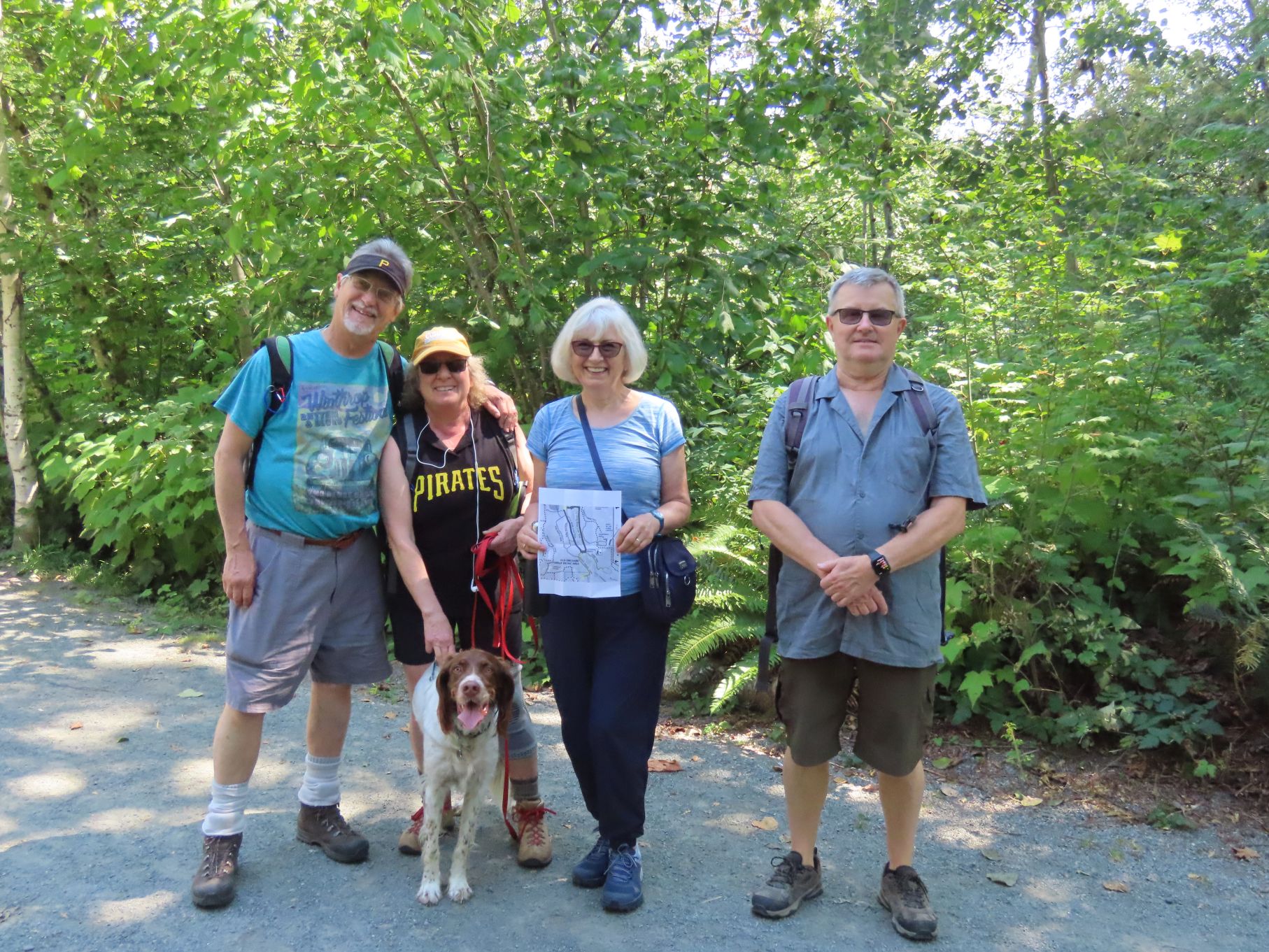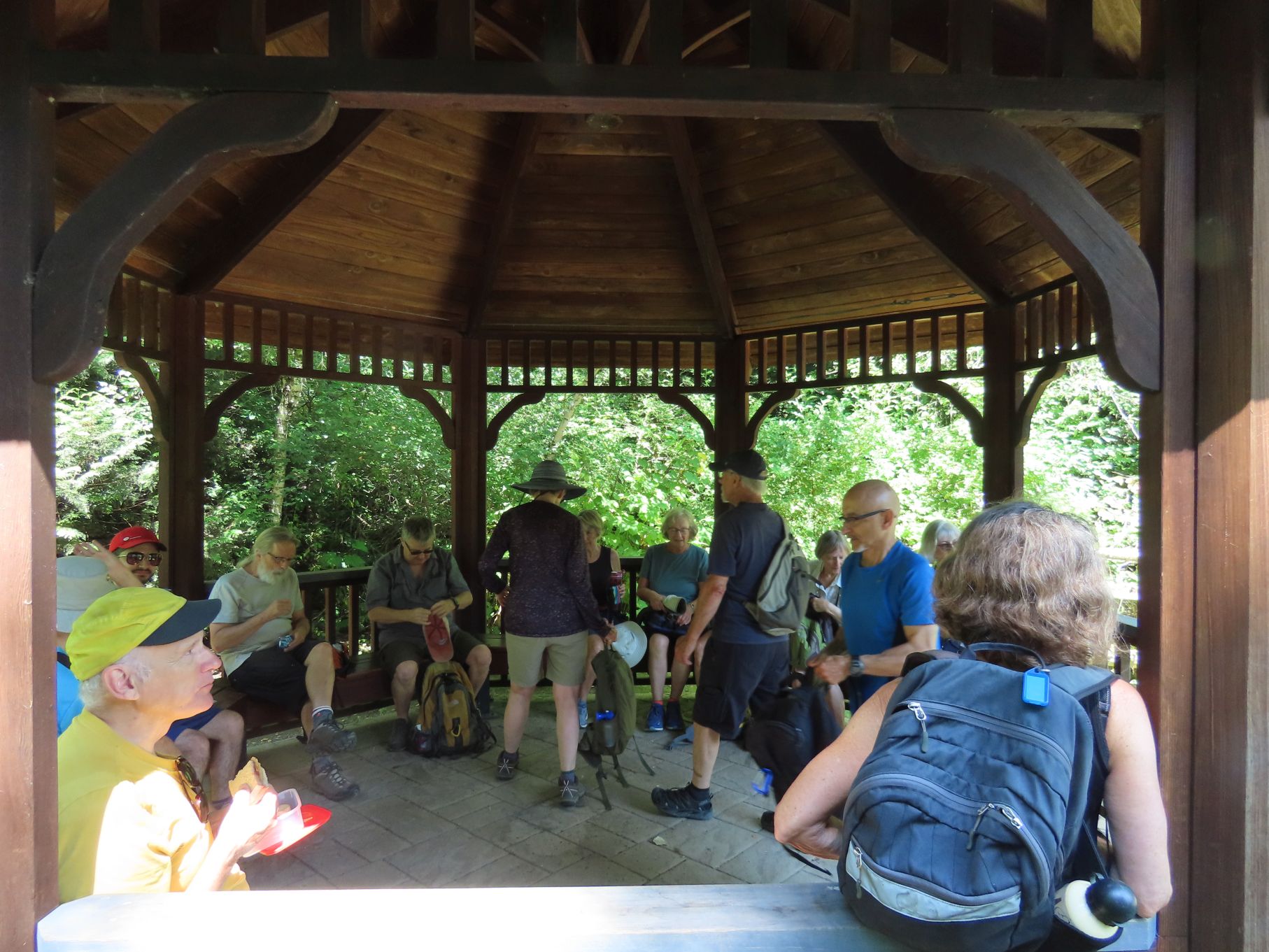 The August walk was organized and led by Jon, who had selected the labyrinthine trails of the Campbell Valley Regional Park as our August destination. Two routes were on offer: an 11 km loop, and a 5.5 km loop, for those who preferred to loop in moderation. Since our traditional annual BBQ was to follow the walk, we’d first met up at the home of Ralph, Tina, and Maki in Walnut Grove, so that pot-luck contributions could be spared the blazing sun. From there we car-pooled to the Campbell Valley Regional Park, a 25 minute ride due south, which resulted in an actual start time of approximately 11:19.