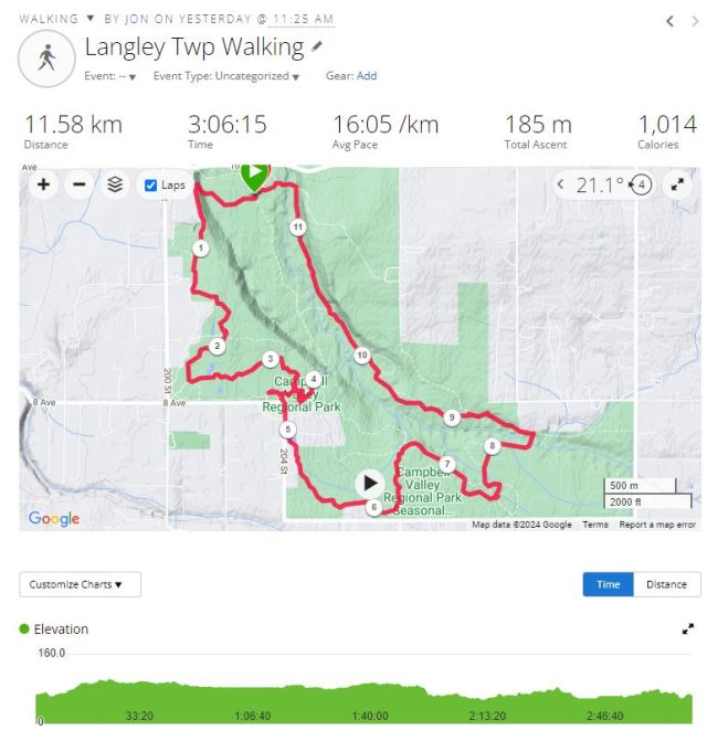 As the LLG neared the Historic Langley Speedway, one Looper experienced mild discomfort. Out of an abundance of caution, Jean summoned a Metro Vancouver Parks vehicle and park ranger from thin air, which appeared from the surrounding forest as if by magic, to carry the Looper back to the starting parking lot and her vehicle. This exciting event, combined with the splitting off of the SLG at the gazebo, and the Achilles Looper who’d remained at the start, meant that our numbers had been reduced from 21 souls to a mere 14 at the completion of the Longer Loop. Nonetheless, all Loopers were — more or less — eventually accounted for, so this diminishment in numbers should NOT be considered a black mark against this month’s leader.