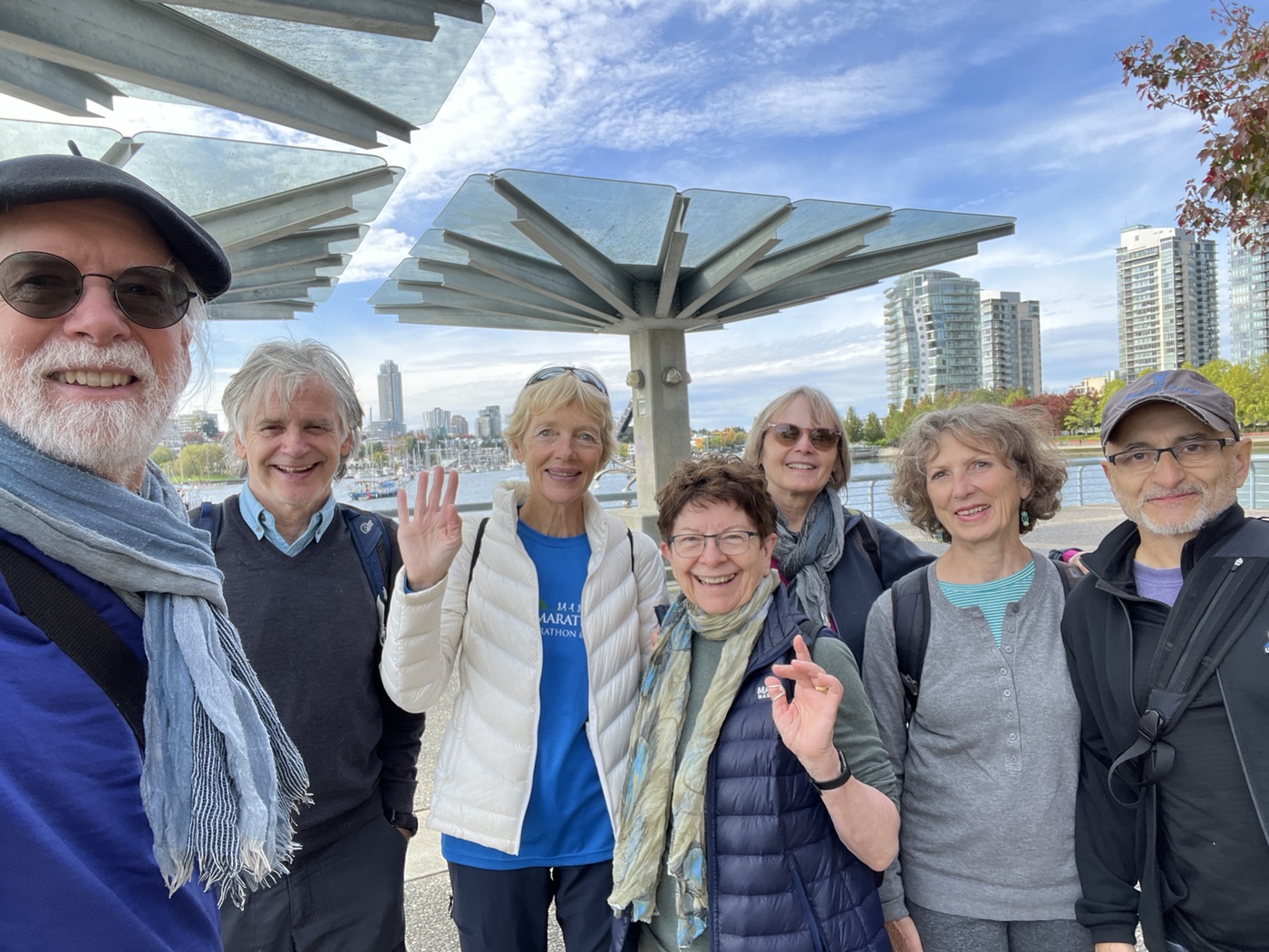 At the foot of Davie Street, we took a lunch break and met up with Carol, Sandy, and Carrie, who, through an unaccountable failure of communication (the organizer will be performing an appropriate penance), thought we were to meet up at the Ookpiits. All was smoothed over as a result of the warm welcome they received, and our enlarged group continued to the Cambie Bridge and then backtracked slightly to see a couple of other installations on Marinaside Crescent before crossing back over Pacific Boulevard.