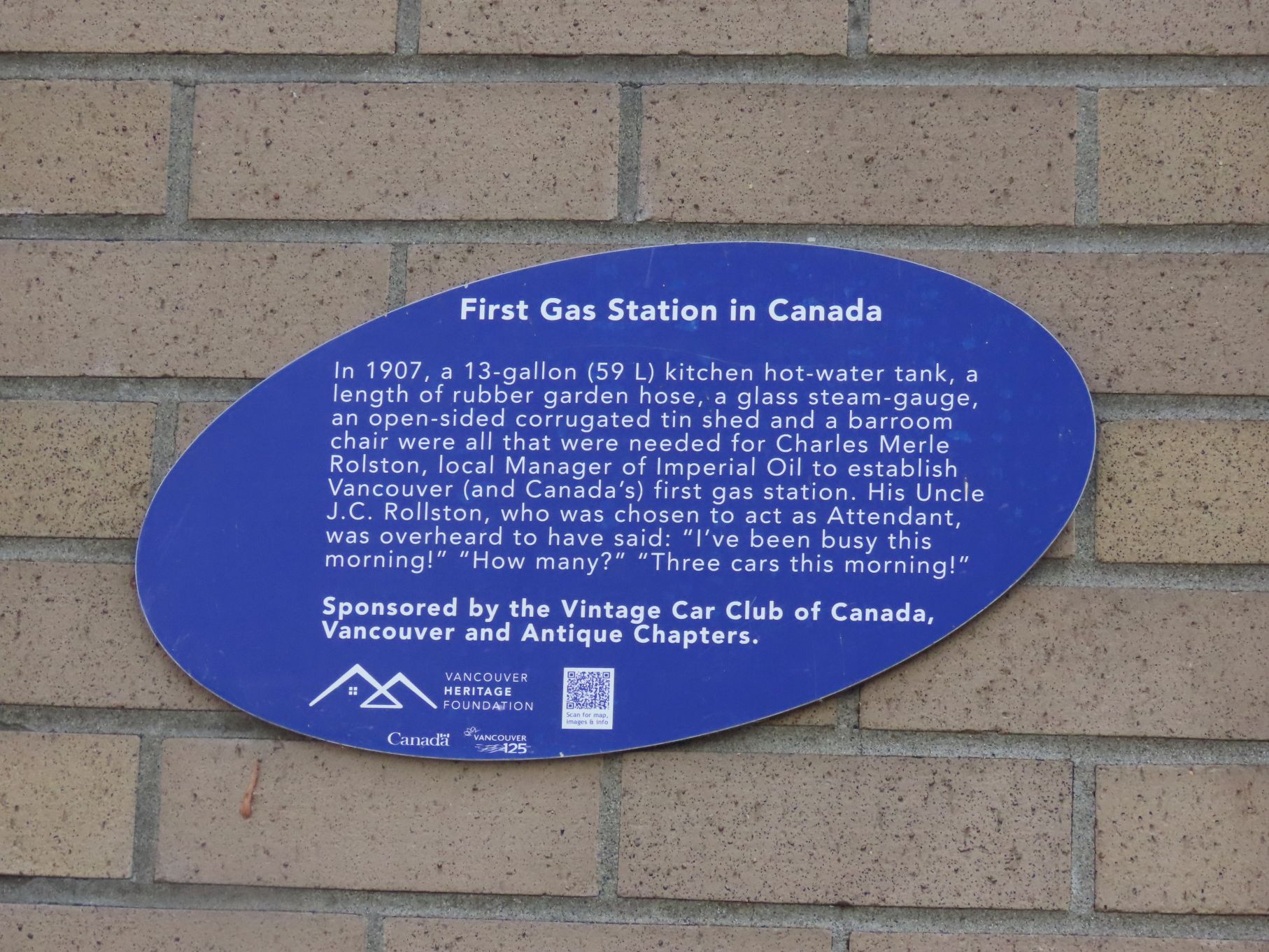 | Notice First gas station in Canada plaque on the south-east corner of Cambie and Smithe. |