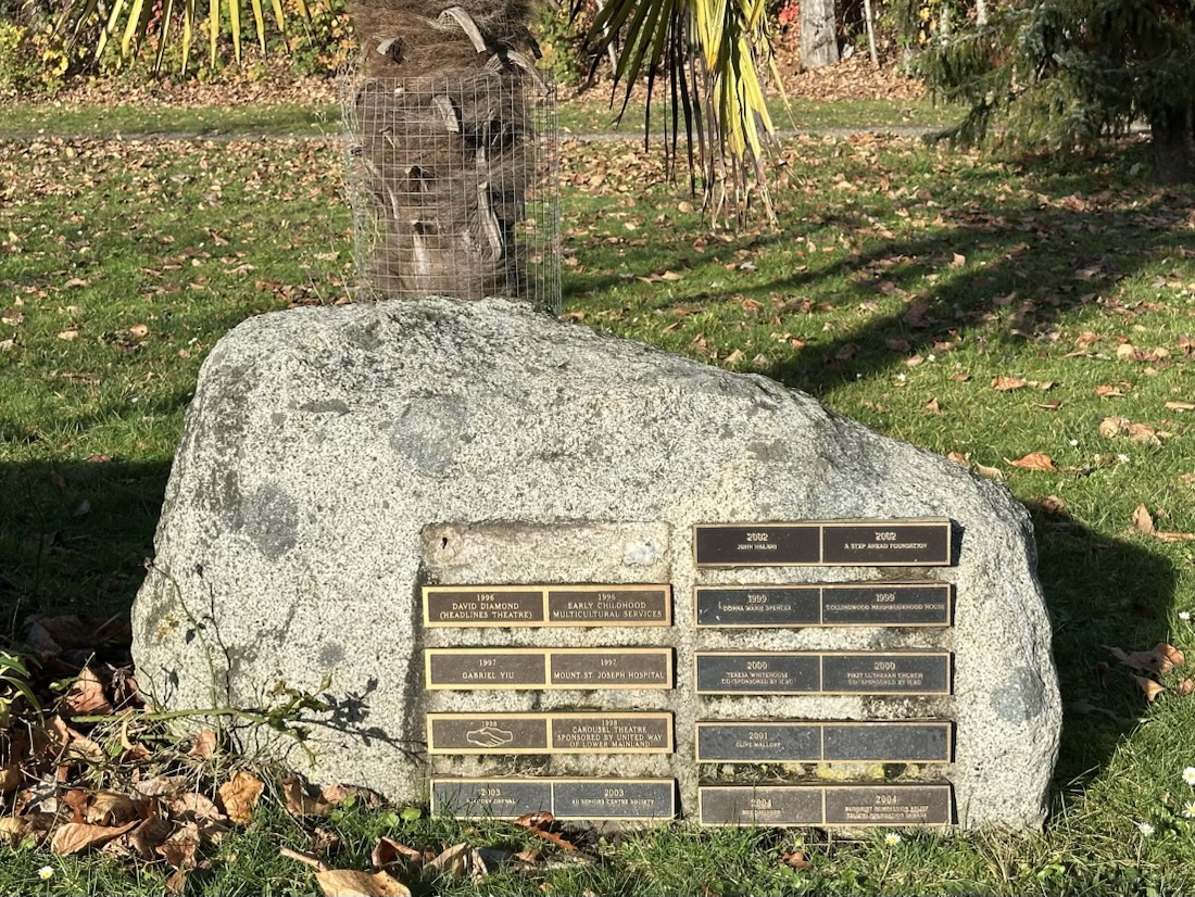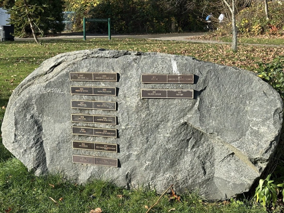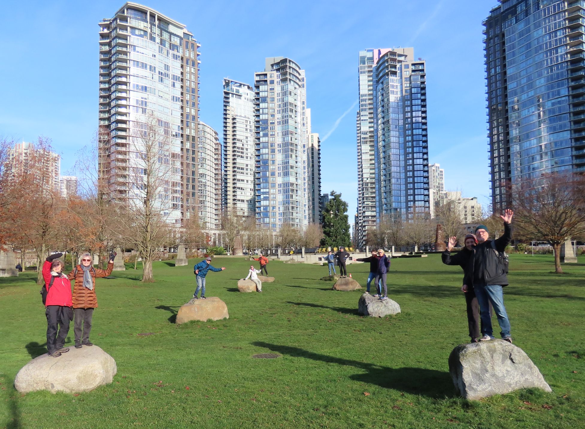 We continued our clockwise walk along the False Creek seawall, passing beneath the Cambie Bridge, the Granville Bridge (resisting the temptations of Granville Island, including Lee’s Donuts, which has been “serving handmade, quality, classic donuts since 1979”) and the Burrard Bridge, where we contemplated the mysterious stones and plaques which constitute the Cultural Harmony Grove.