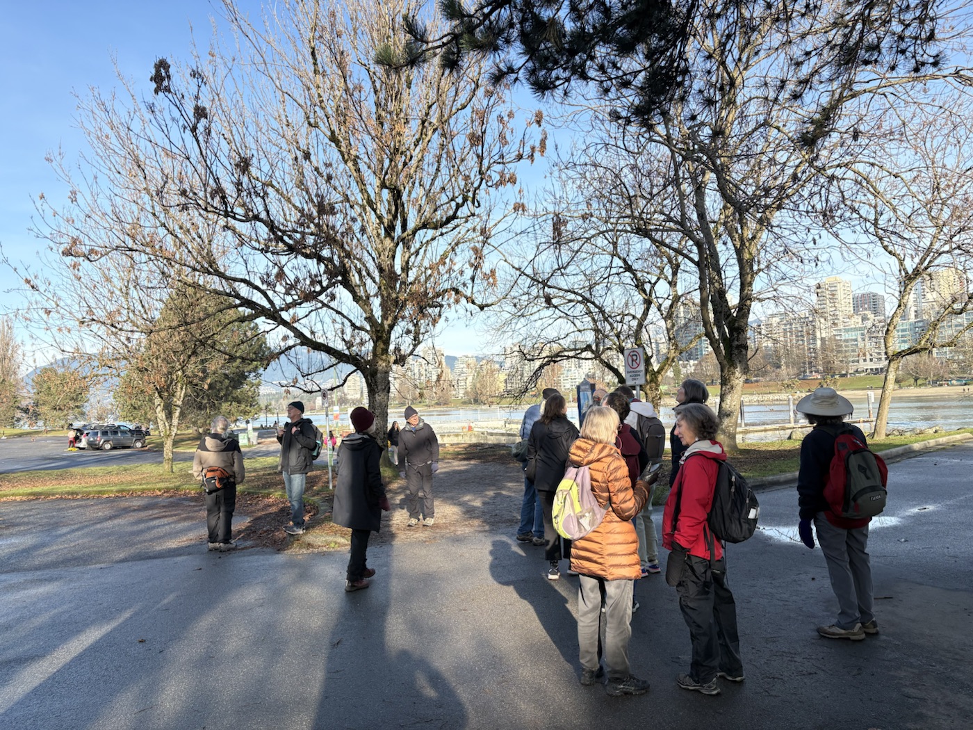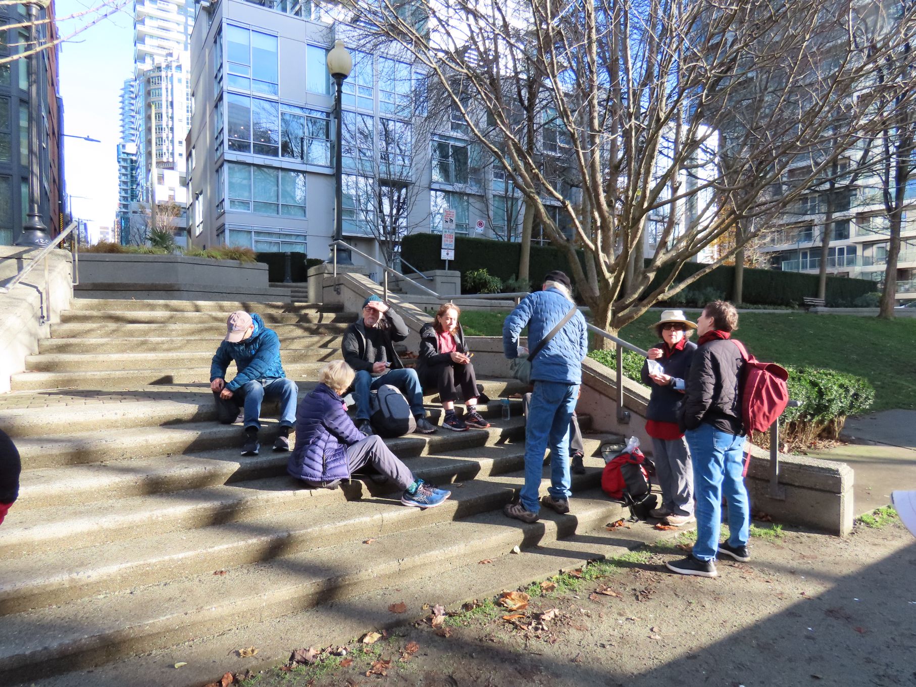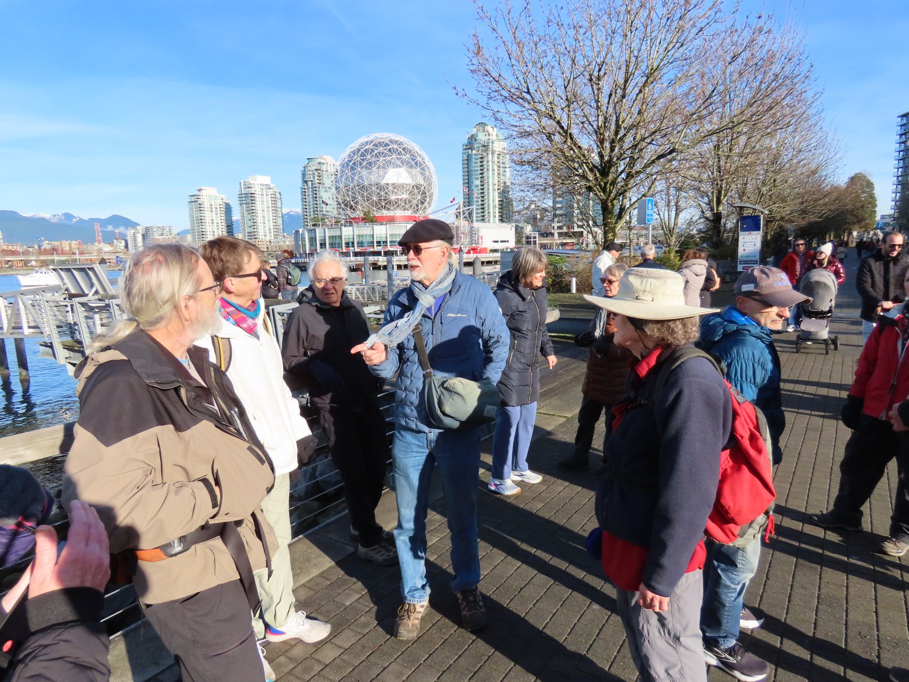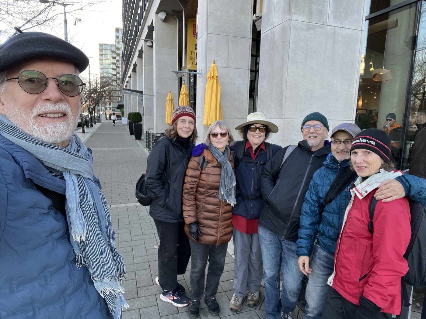 It was a perfect day for our final walk of 2024, and sixteen Loopers gathered just outside the Olympic Village Skytrain station at Cambie and West 2nd Ave at 10:30 am. Dave was the leader of this month’s walk, and the route he’d selected took us clockwise around False Creek.