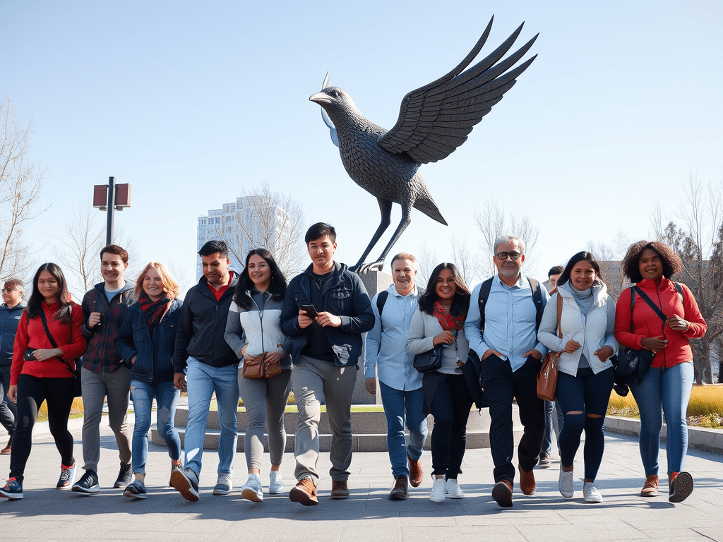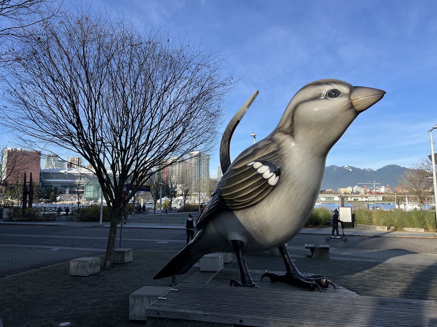 The AI prompt was “a group of 16 urban walkers standing beside the giant sparrow sculpture in Vancouver’s Olympic Village Park.” Which proves that, despite its many marvels, AI does have limitations, since it apparently can’t count as high as 16.