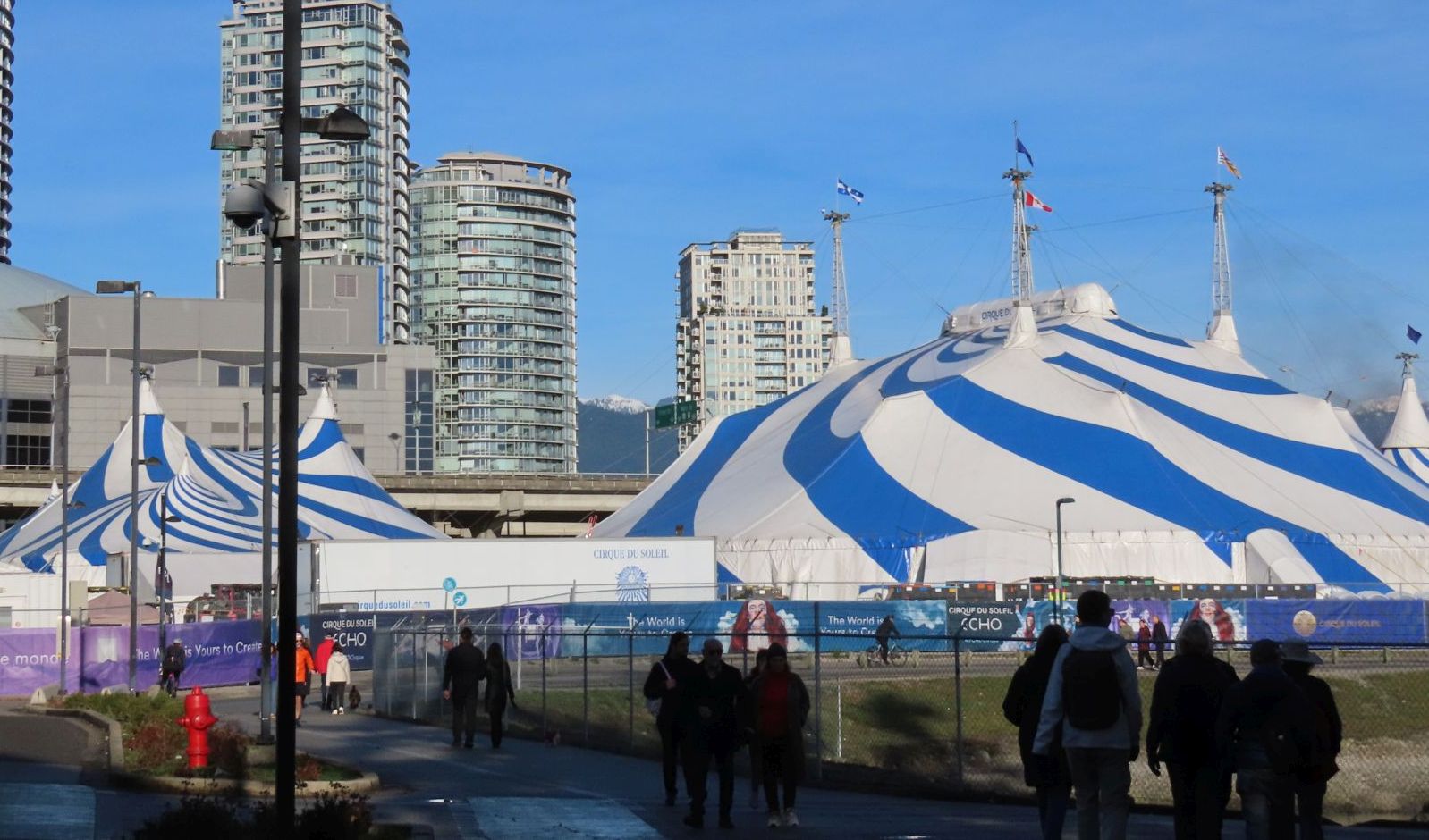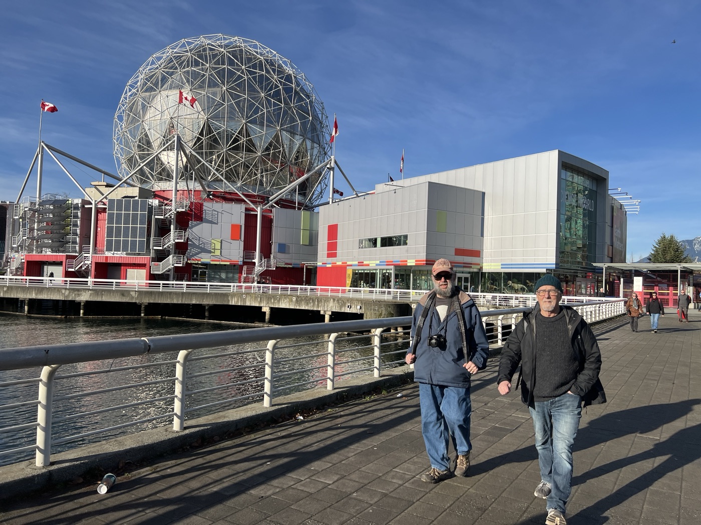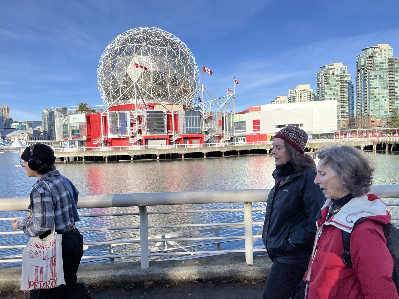 After crossing Burrard Bridge we descended to the seawall once again, to continue our clockwise circuit. Our timing was the slightest bit off, since we just missed (by a mere 15 minutes) the noon performance of (Factoid 6:) the fabulous spinning chandelier sculpture which hangs beneath Granville Bridge. Soon thereafter Looper Fred spotted a circle of stones in George Wainborn Park, and, since the stones were vacant, we stood atop them—since this is the sort of thing that Loopers do. We reached Science World at the head of False Creek just after 1:00, and marvelled at its spherical immensity before carrying on.
