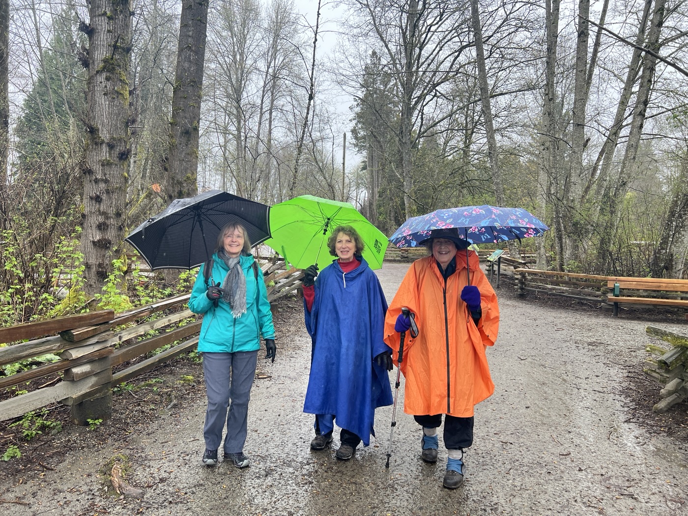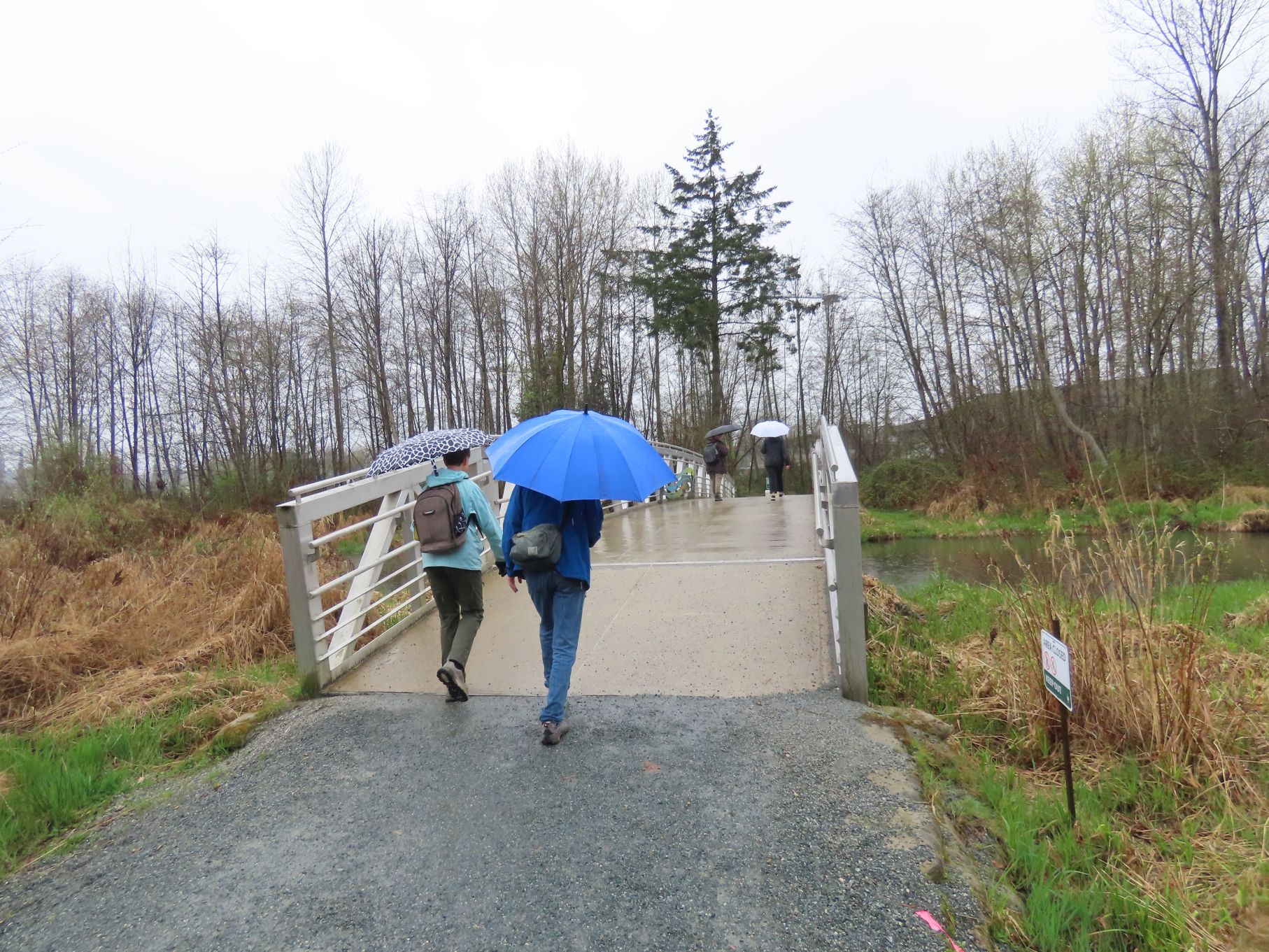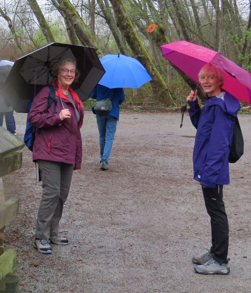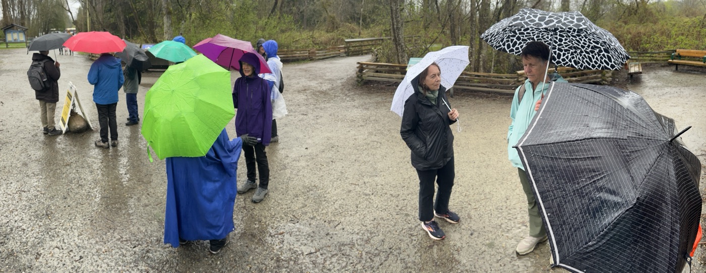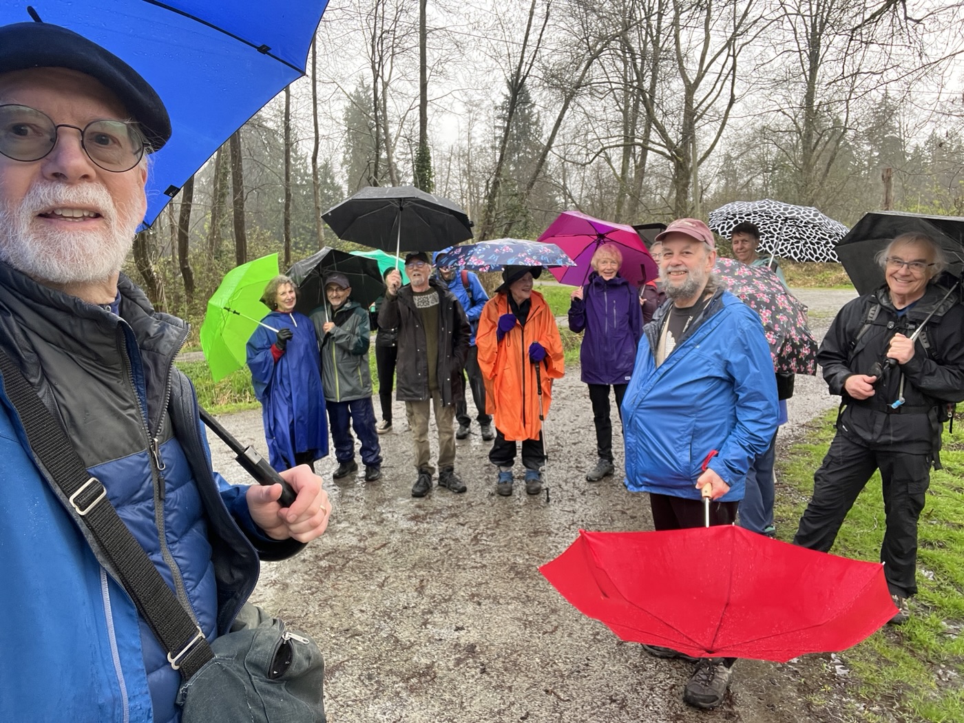 After a spell of sunshine several days long, sixteen hardy loopers met at the east end of Burnaby Lake on a day that promised and delivered nothing but rain, with a few breaks for … cloud. Gathering in the parking lot on Avalon Avenue we can assume that some at least of the cheerful small talk under umbrellas was about the weather.