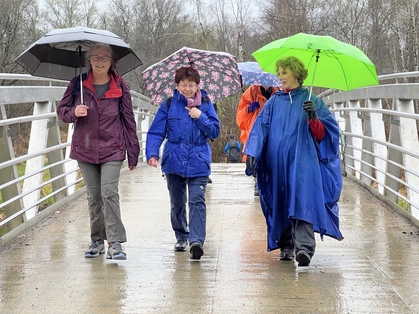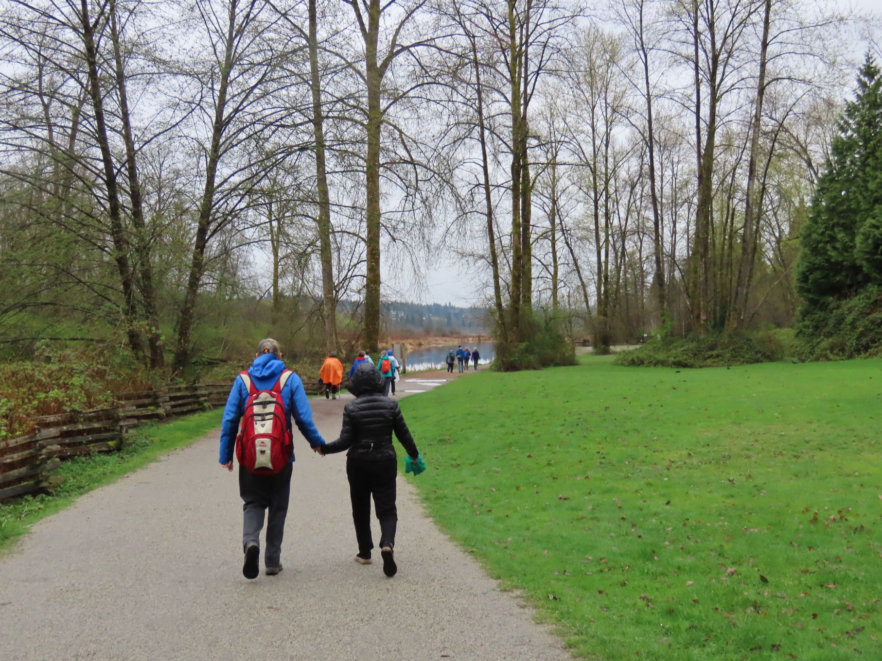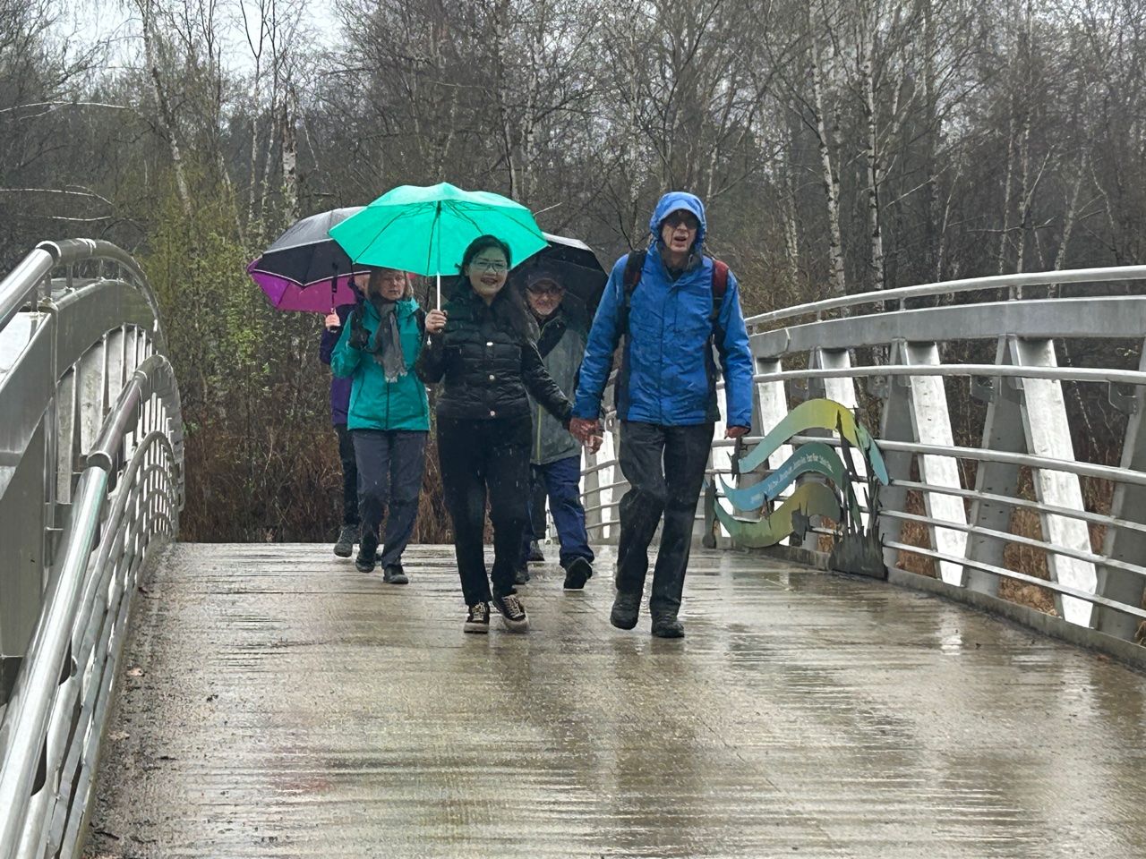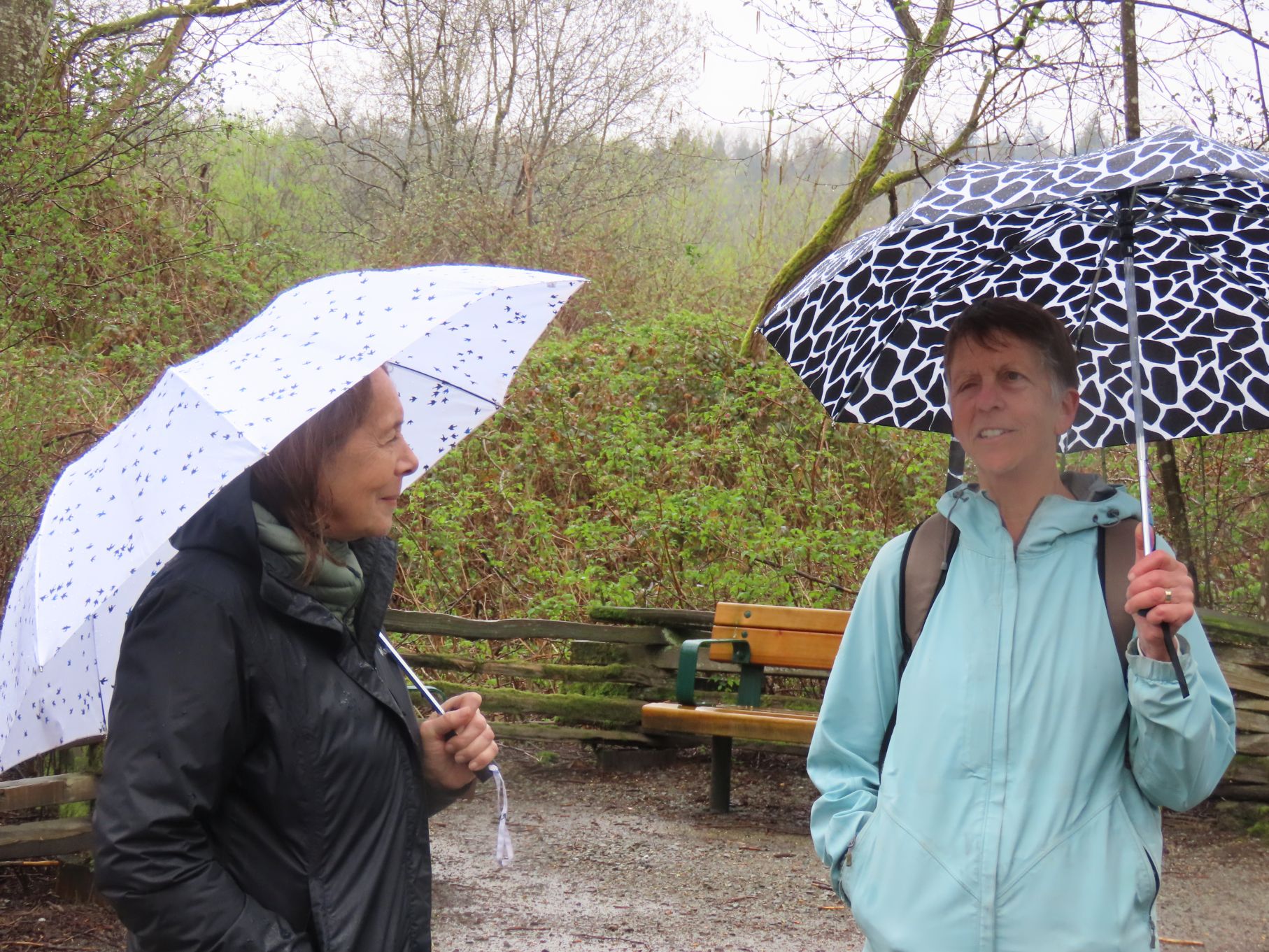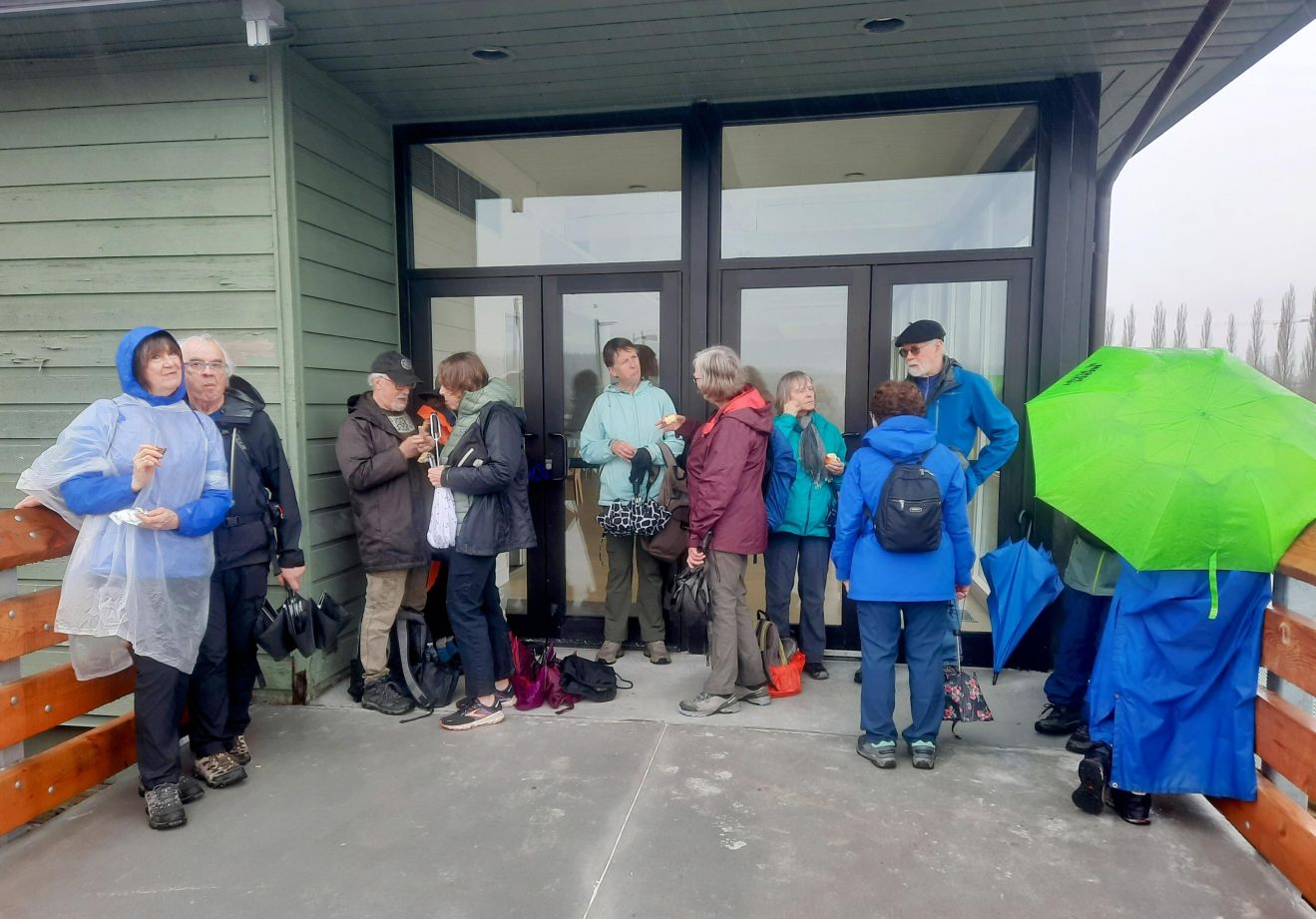 After a spell of sunshine several days long, sixteen hardy loopers met at the east end of Burnaby Lake on a day that promised and delivered nothing but rain, with a few breaks for … cloud. Gathering in the parking lot on Avalon Avenue we can assume that some at least of the cheerful small talk under umbrellas was about the weather.
