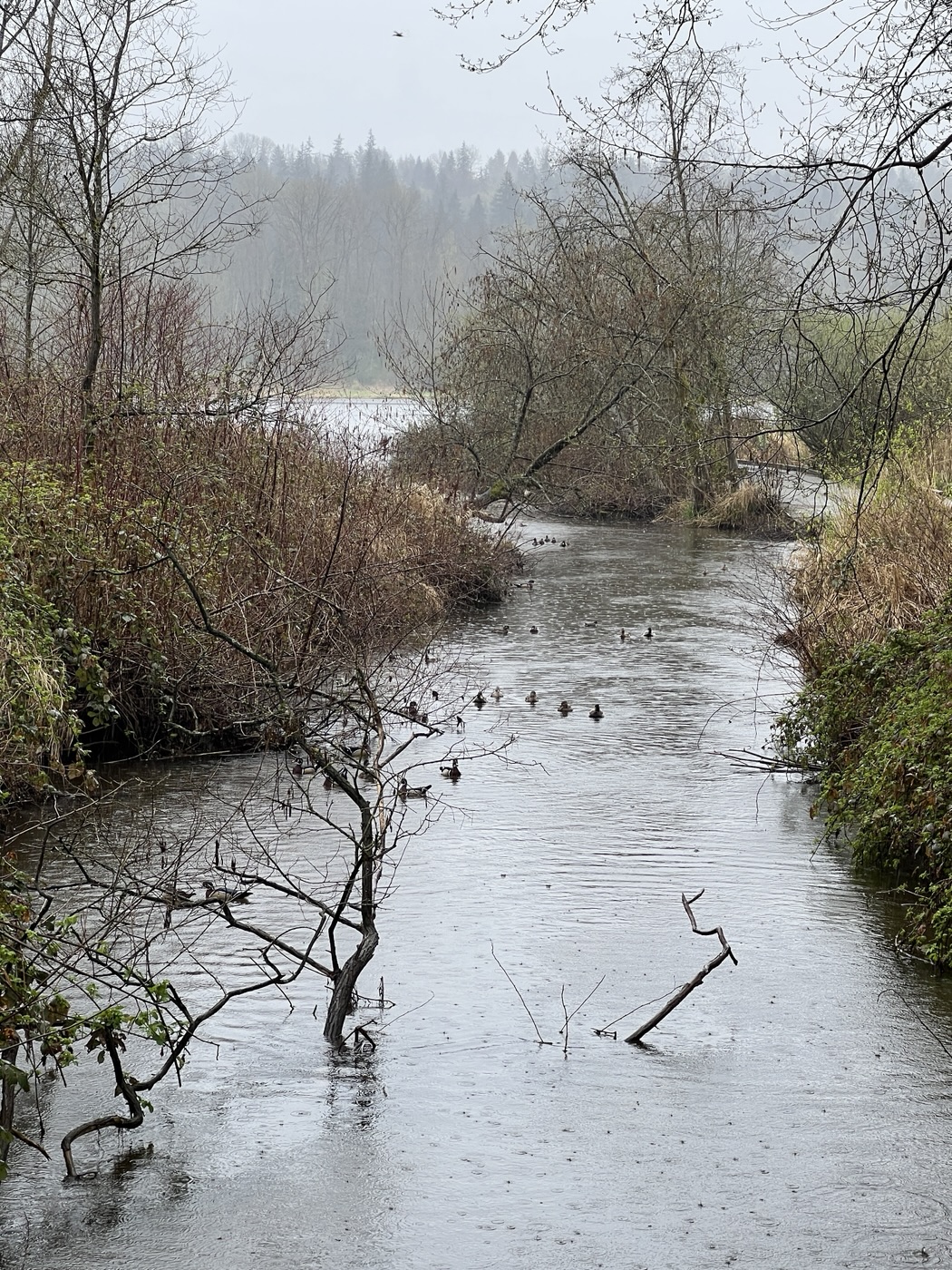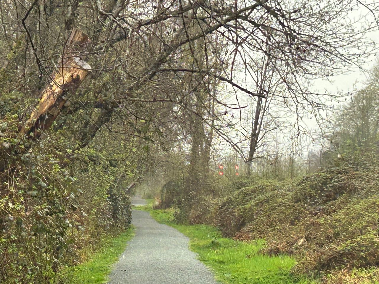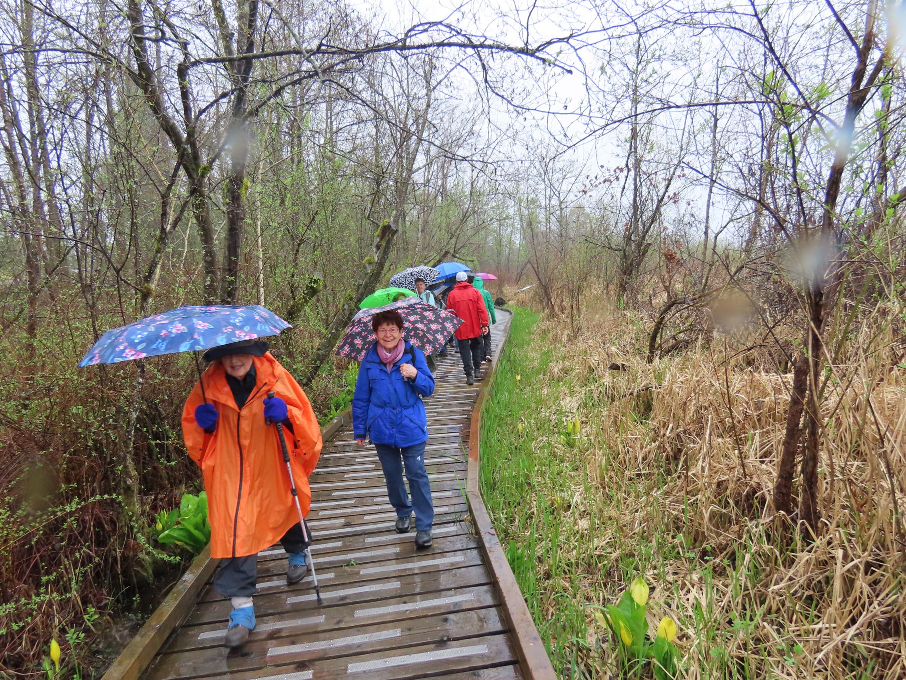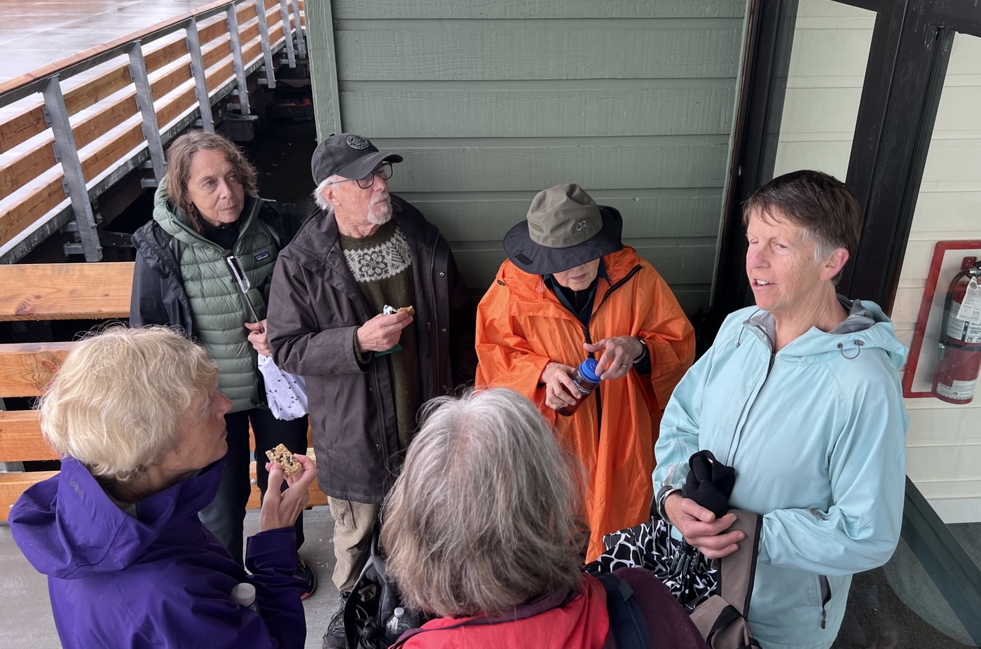 After a spell of sunshine several days long, sixteen hardy loopers met at the east end of Burnaby Lake on a day that promised and delivered nothing but rain, with a few breaks for … cloud. Gathering in the parking lot on Avalon Avenue we can assume that some at least of the cheerful small talk under umbrellas was about the weather.