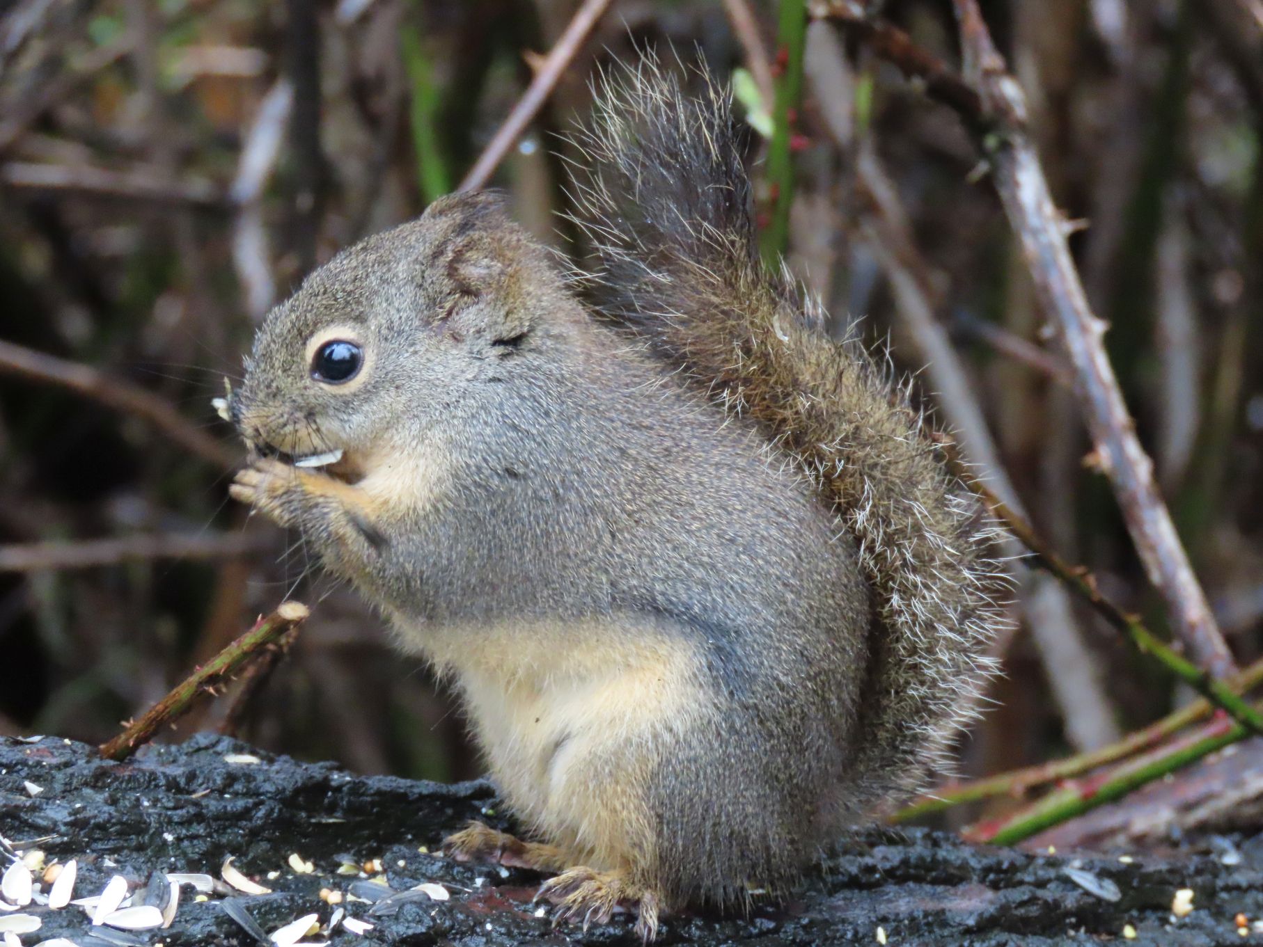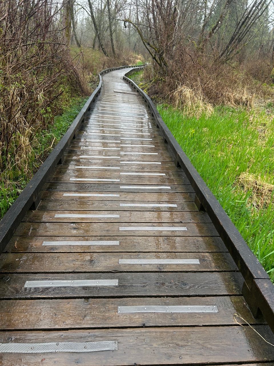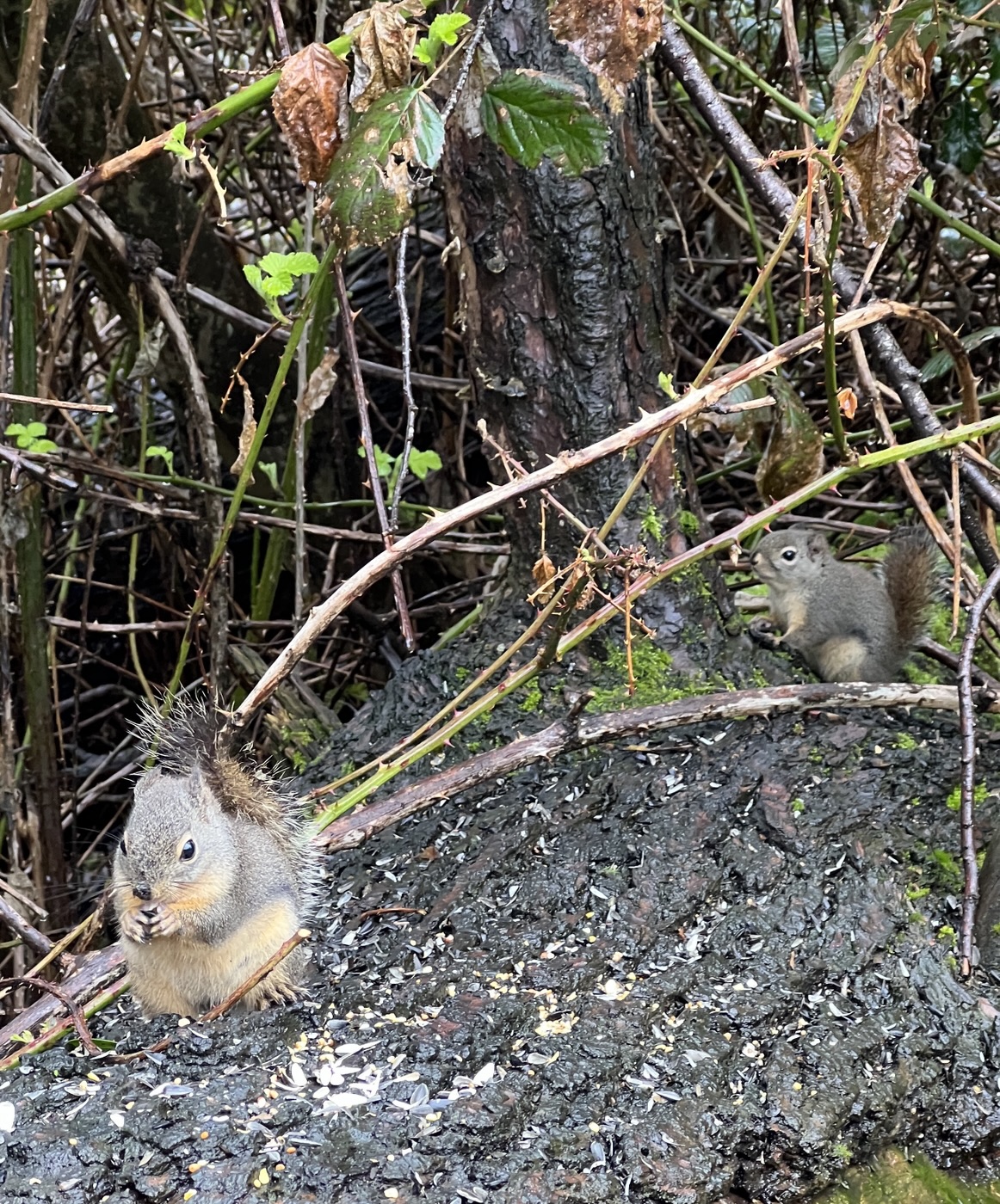 Loopers indeed spotted some wildlife. At the Piper Road education centre we stopped to view various waterfowl, including little Green-winged Teal, slightly larger and more colourful Wood Duck, even larger Mallard, and of course, the usual Canada Geese. Jon was able to spot the obligatory Great Blue Heron at some distance and snag a photo. This stop was also the first of two biological opportunities. A Douglas squirrel feeding on seeds scattered on a stump was the only wild mammal this blogger saw – and it seemed rather tame.
