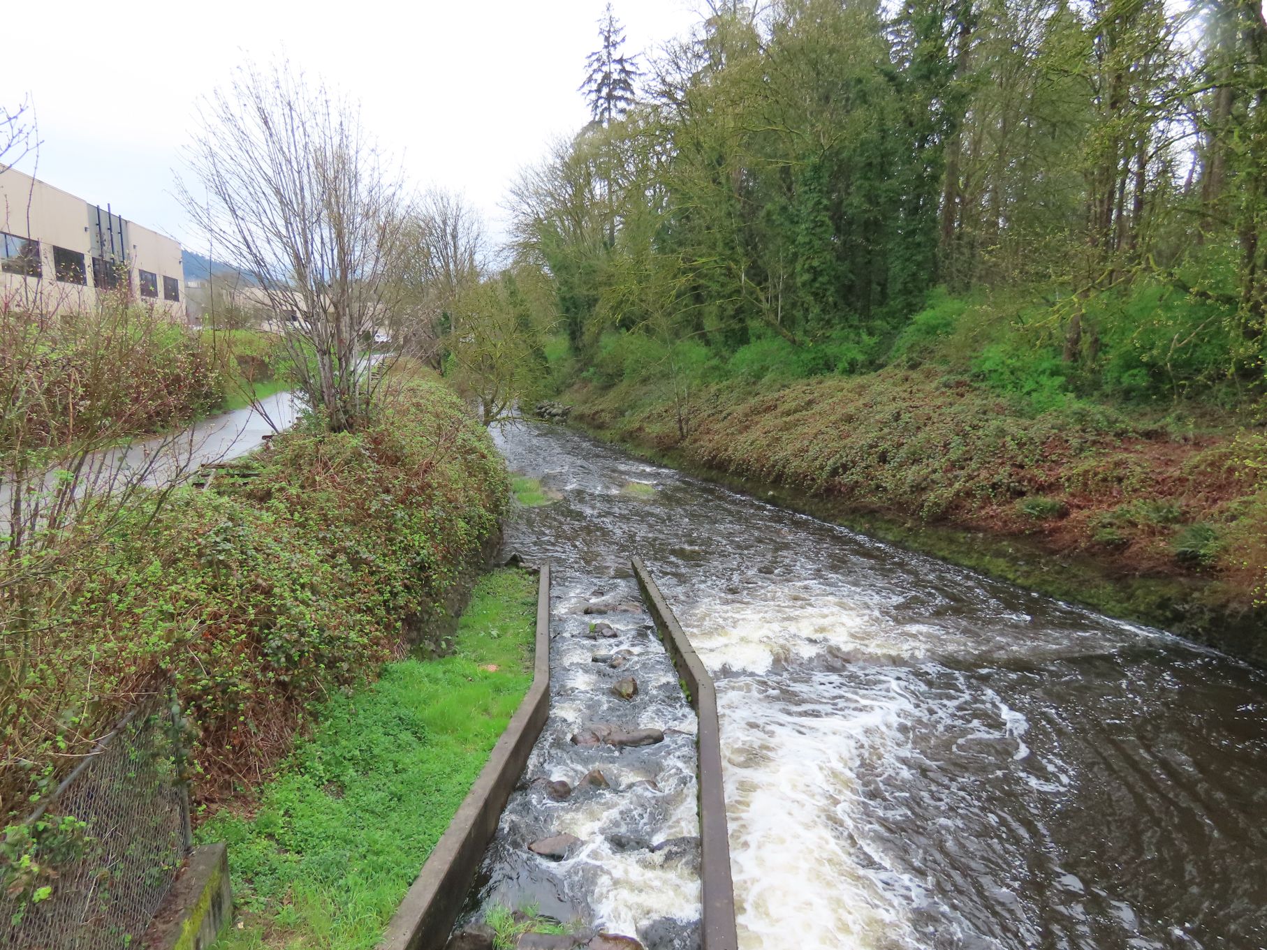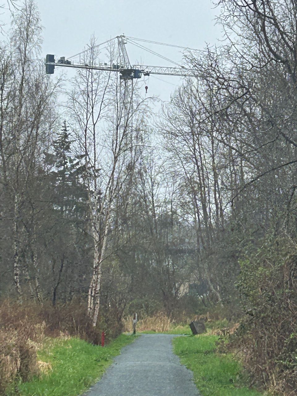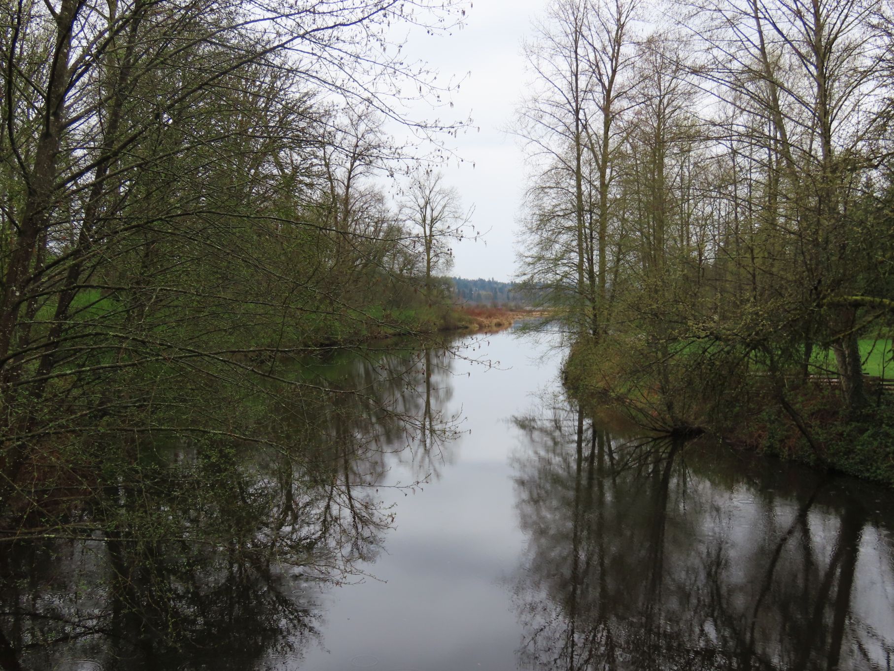 The long dead-straight stretch parallel to the railway line seemed endless – but we finally turned south to eventually cross the handsome aluminum bridge over Still Creek and begin the return leg along the south side of the lake.