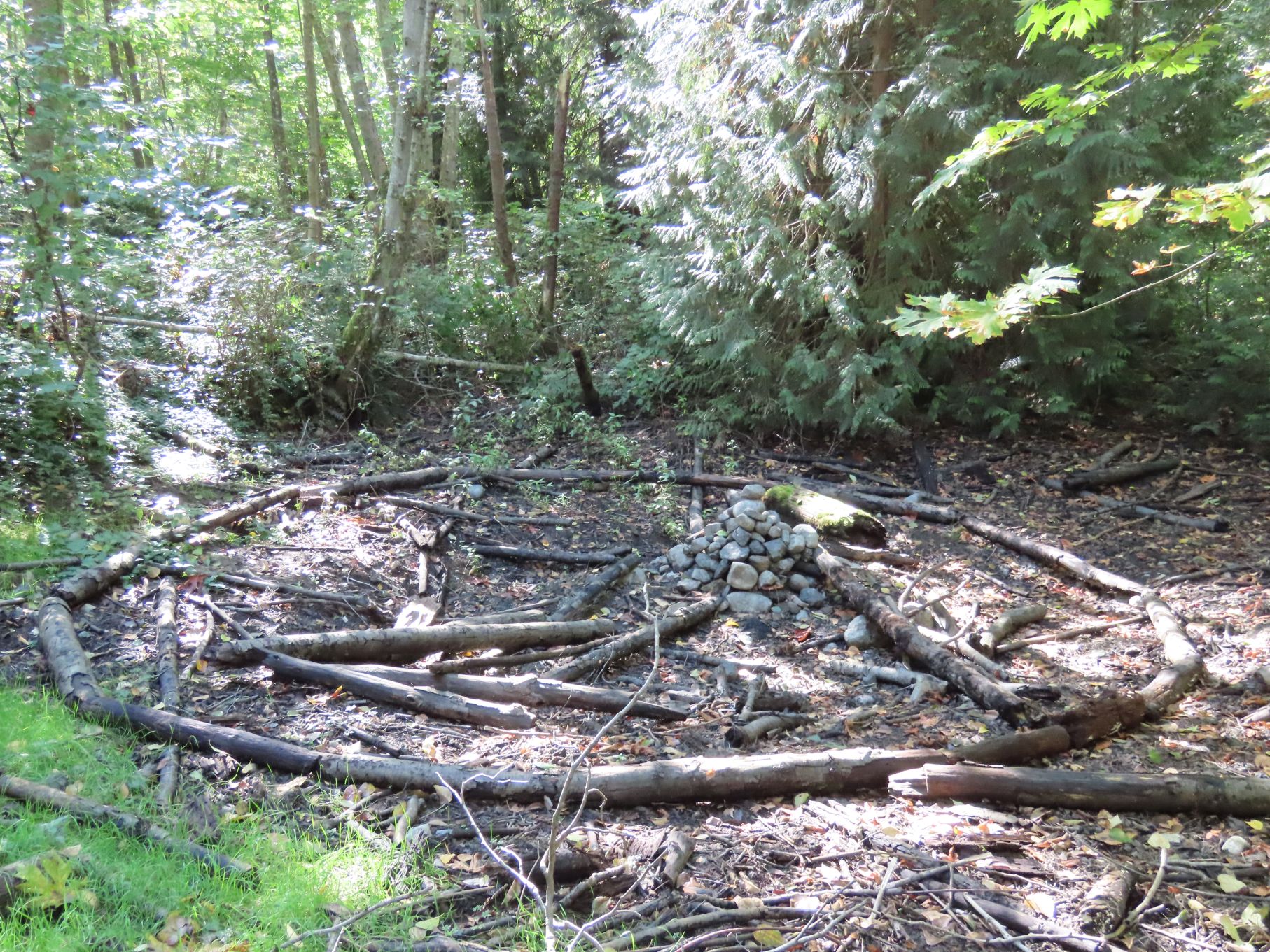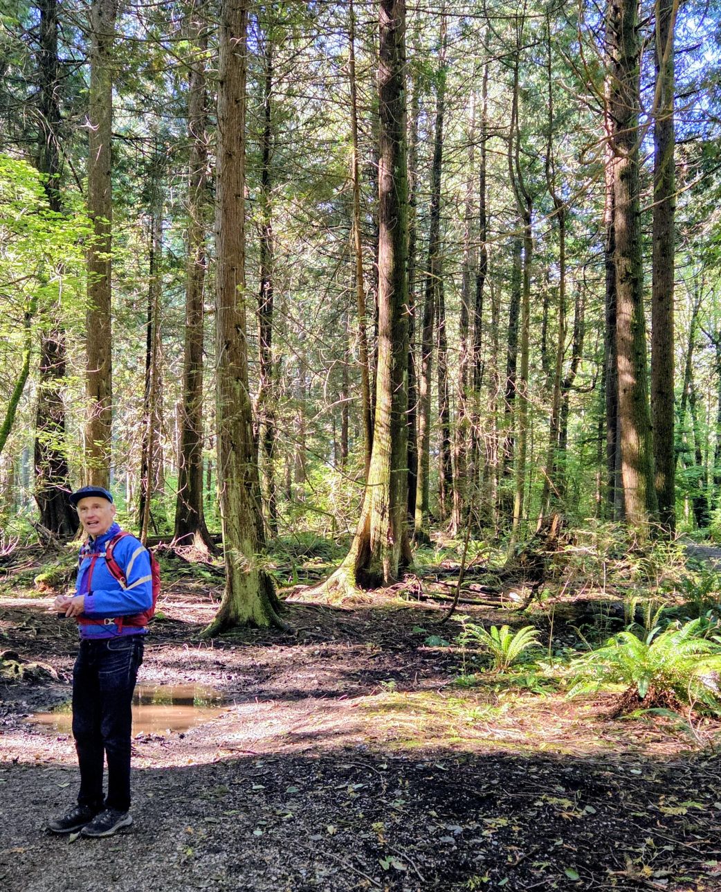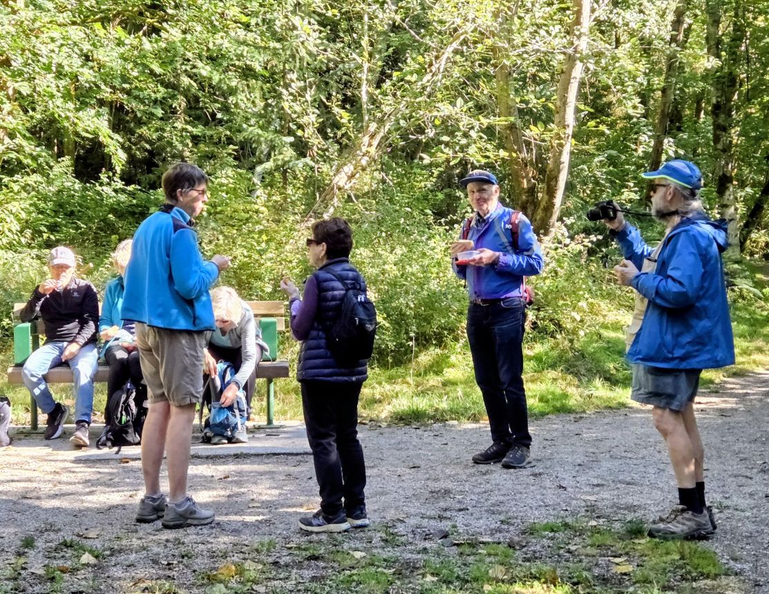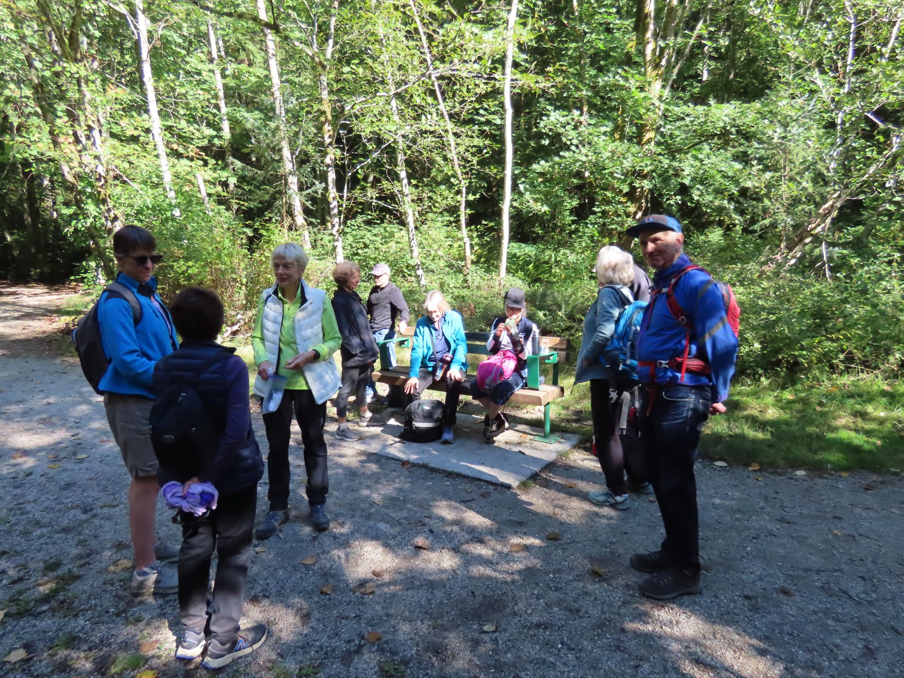 Guided by our leader Gordon, we took a meandering route through the southern part of Pacific Spirit Park. We followed Huckleberry trail to Hemlock trail and continued to the west. Upon meeting Salish trail we turned northward back towards 16th Avenue. At the junction with Sword Fern trail we turned back south and followed Sword Fern down to Imperial trail, one of the main east/west trails through the park. Partway along Sword Fern Jon pointed out a spot where a bench had once stood, been replaced and then mysteriously removed again.