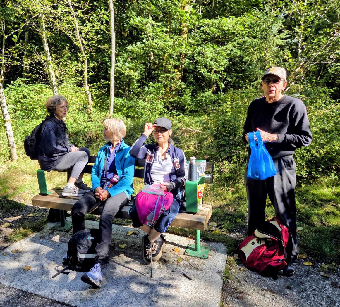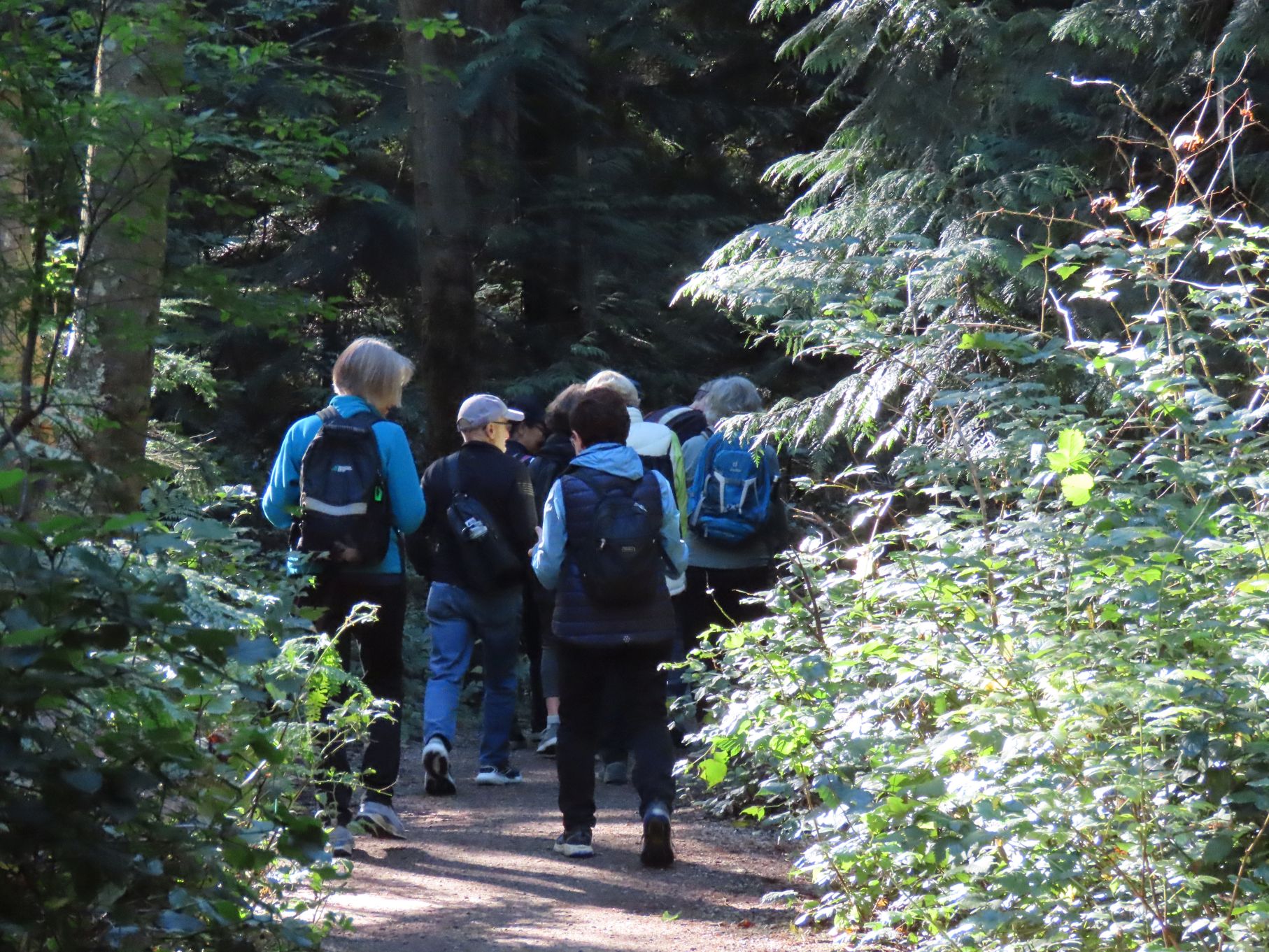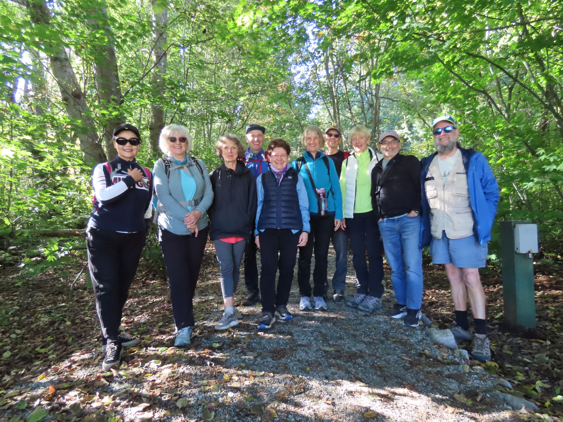 On a crisp and sunny morning, this month’s gathering point was at the corner of 16th Avenue and Imperial Drive. 10 loopers posed for the starting selfie at the Huckleberry trailhead before plunging into the woods. We were joined very shortly by a couple of stragglers.