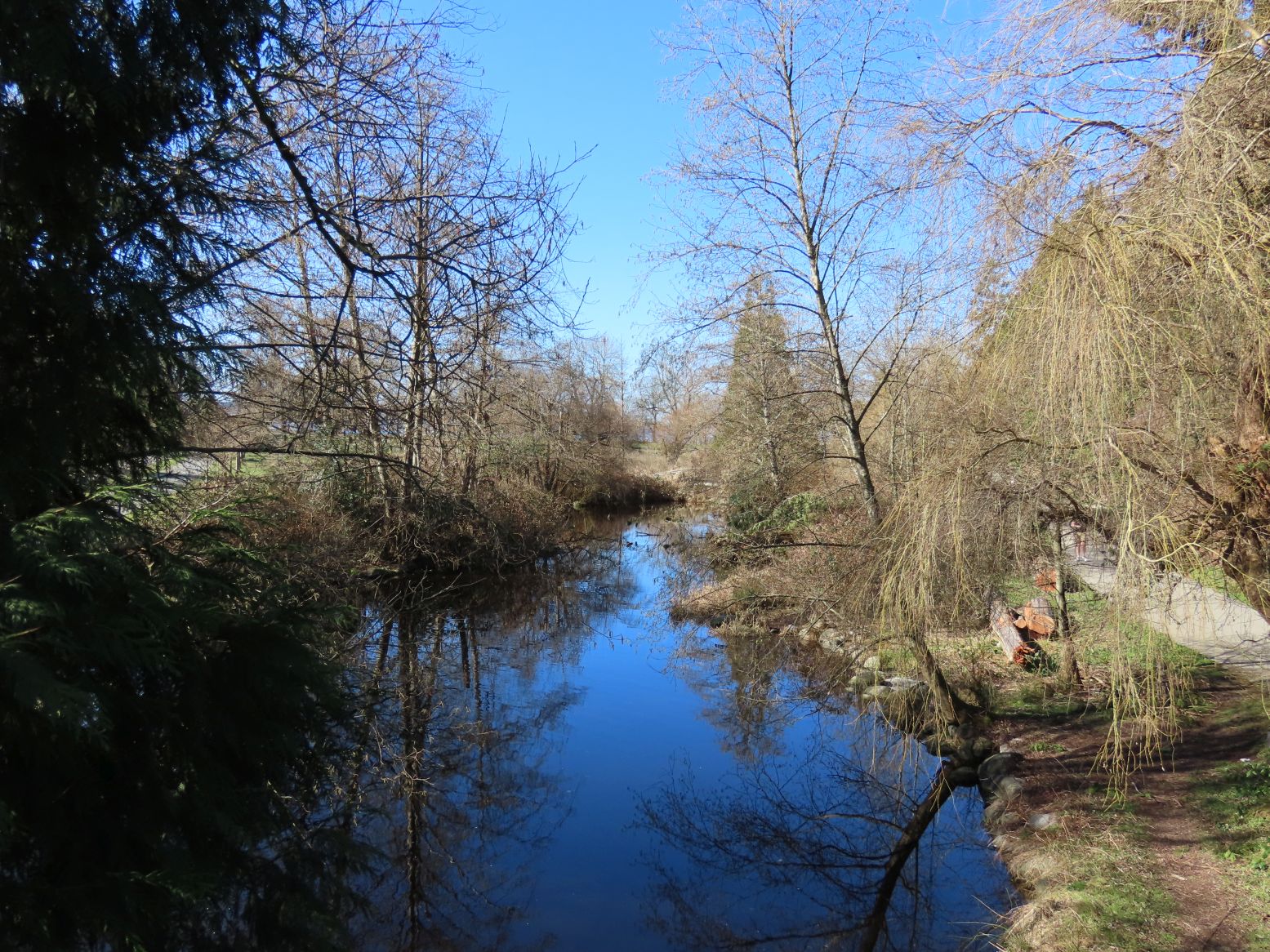 We took South Creek Trail and Beaver Lake Trail, and wandered in the direction of the bridge over the causeway. David, Angela, and Finn left after we crossed the causeway bridge — although they needed to peruse the map carefully. Advice was given. They were last seen heading to Lovers Walk. We trust they made their way safely home.