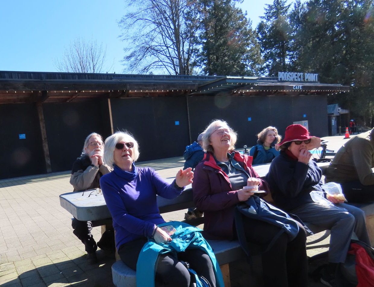 The elevation gain was almost all on Bridle Path on the way up to Prospect Point, where we received our reward in the form of a snack break in the sunshine.Then we descended via Merilees Trail. Here, we had lots of glimpses of the water: there were classic Vancouver views of sea, white sails, blue sky, and distant mountains.