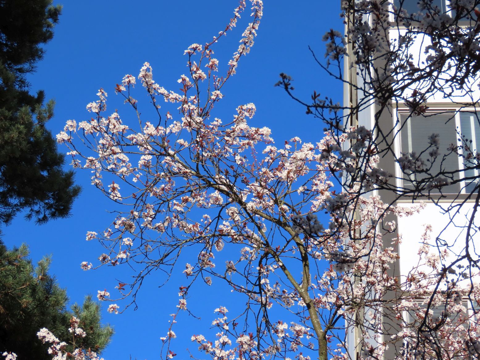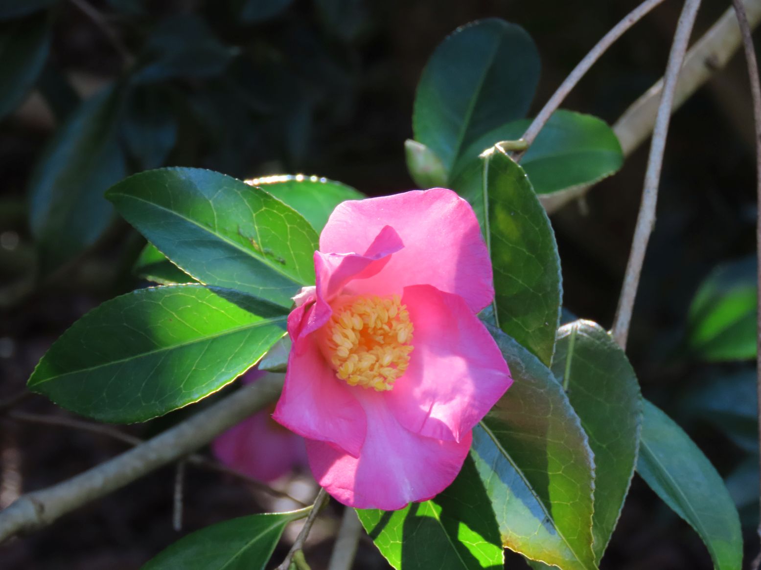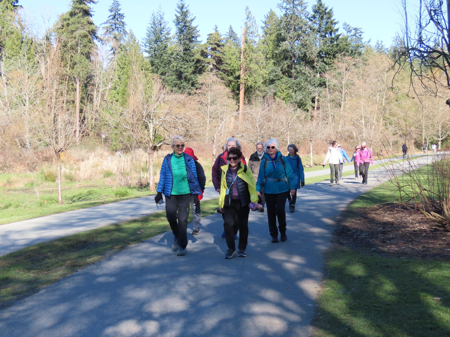 The last part yielded more of the springy trails, serenading birds, and tall trees. Near the end, we saw lots of evidence of an early spring, with daffodils, crocuses, and camellias along with cherry blossoms. In Ceperley Meadow, we saw another of Sandy’s carpentry masterpieces in the form of a curved bridge, now half-hidden in the grass.